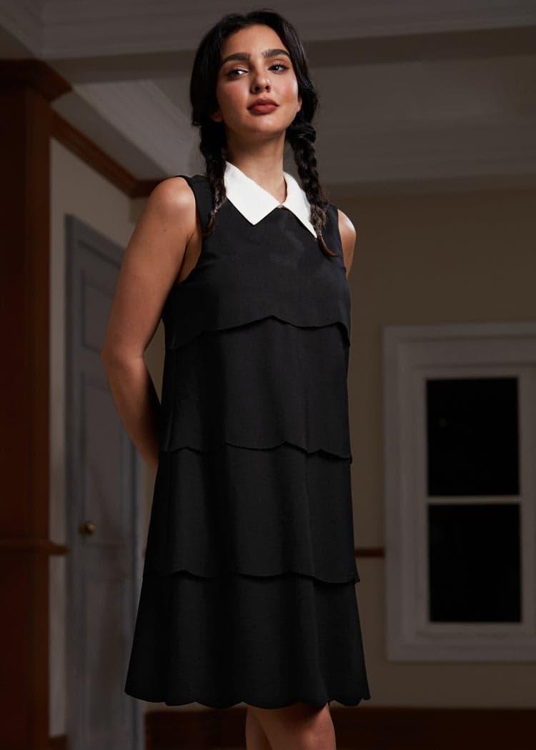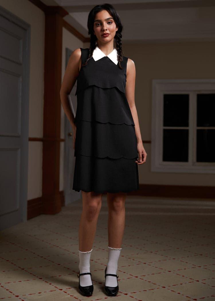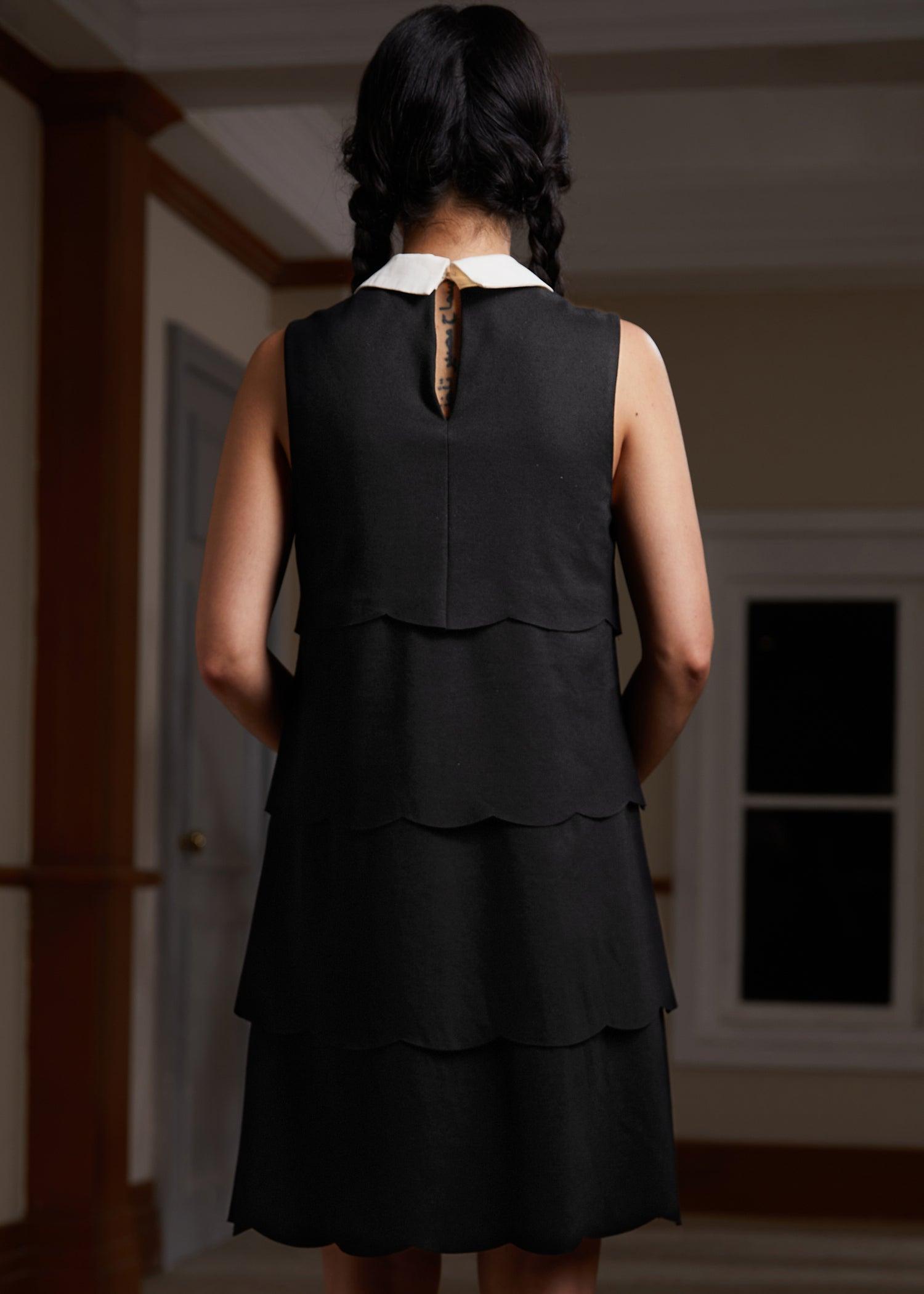 Bonfire Bash A-Line Dress from our ModCloth namesake label offers a nostalgic silhouette with a contemporary twist. Constructed from Ponte fabric with medium stretchability, this black dress cuts a svelte figure while ensuring easy movement. A contrast collar with scallop detail provides a focal point that's as delightful as the first leaf fall, setting the stage for an afternoon of antiquing or a serene date night at your local bistro.Machine wash cold, line dryLength 36"ImportedShell: 67% Viscose, 29% Polyamide, 4% Elastane Contrast:100% PolyesterModel is wearing a US size SModel Measurements: Height 5'5"/Bust 34"/Waist 24"/Hips 36"