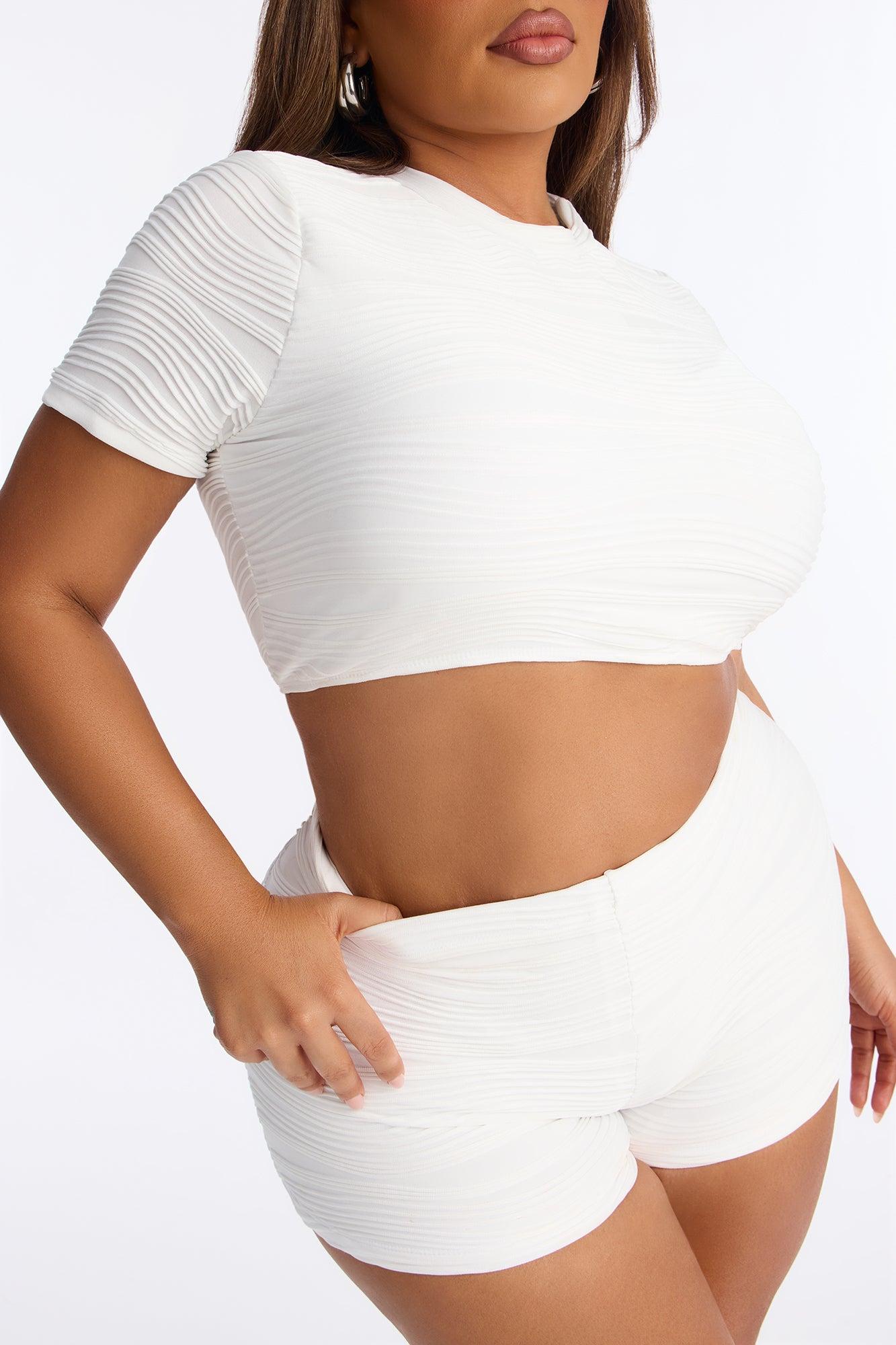 Available In Orange And White. 2 Piece Bikini Textured Crop Top Bikini Top Removable Cups Short Sleeves Adjustable Lace Up Back Boyshort Bikini Bottoms Full Coverage Full Stretch Final Sale Shell & Lining: 96% Polyester 4% Spandex Imported California Proposition 65WARNING: Cancer and Reproductive Harm - www.P65Warnings.ca.gov.