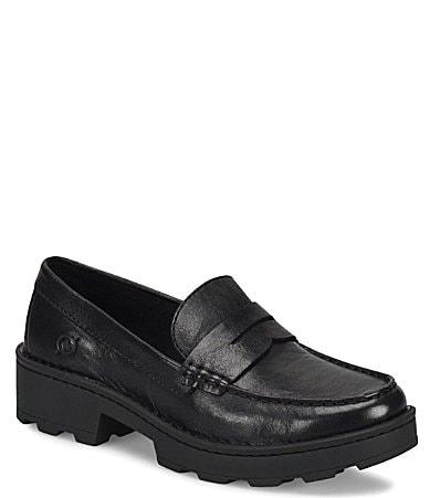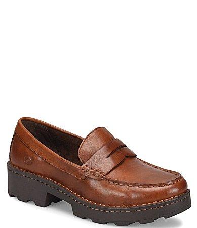 From Born, the Carrera Leather Lug Sole Platform Penny Loafers feature:Soft hand-finished leather upperOpanka hand crafted constructionPenny keeper strapSlip onBreathable soft fabric suede liningSoft fabric covered footbed with extra foam for added comfortHigh traction flexible lightweight EVA and rubber combination lugged outsoleApprox. 1 platform heightApprox. 1.5 heel heightImported.