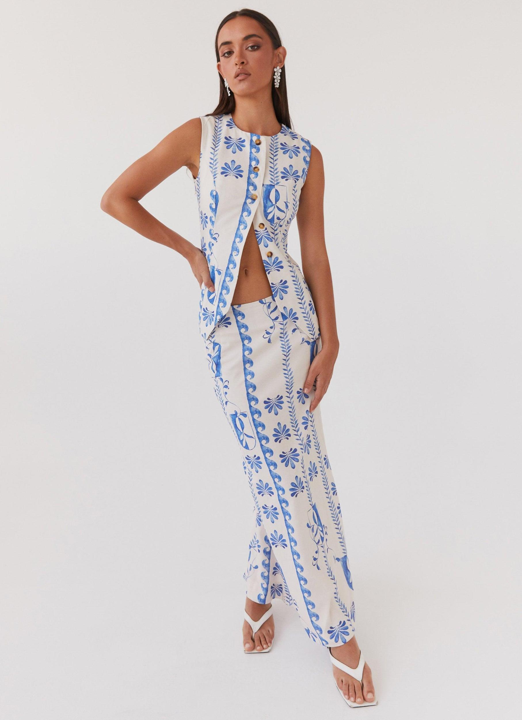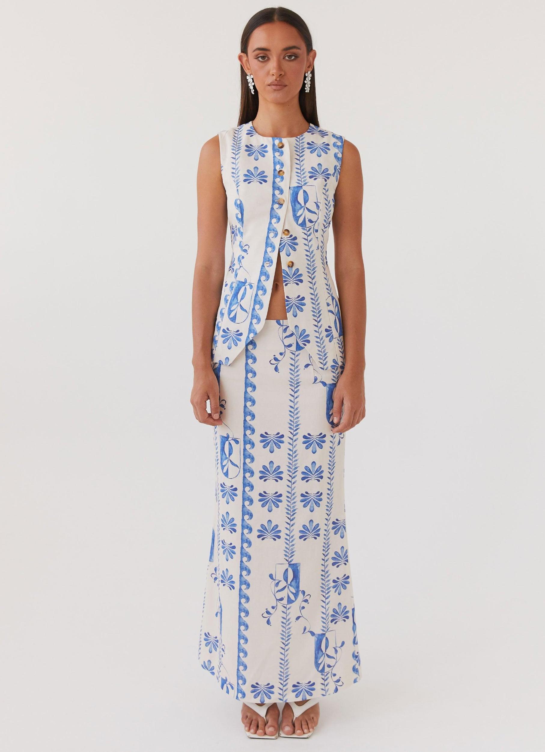 Peppermayo Exclusive Introducing our Born For Bordeaux Linen Midi Skirt—a dreamy addition to your wardrobe. Crafted from luxurious linen, this skirt boasts a flattering mid-rise fit and a slightly flared hem for added elegance. Complete the set with our Born For Bordeaux Linen Vest and elevate your style effortlessly. Ideal for golden skies and balmy nights. - Maxi dress- Side seam invisible zip- Unlined- Mid-rise- Centre back split- Exclusive Peppermayo print- 45% Linen, 55% Cotton Size AU 8 garment measurements: Waist 73cmLength 95.5cmHip 93cm Roberta wears size AU 6 / size US 2