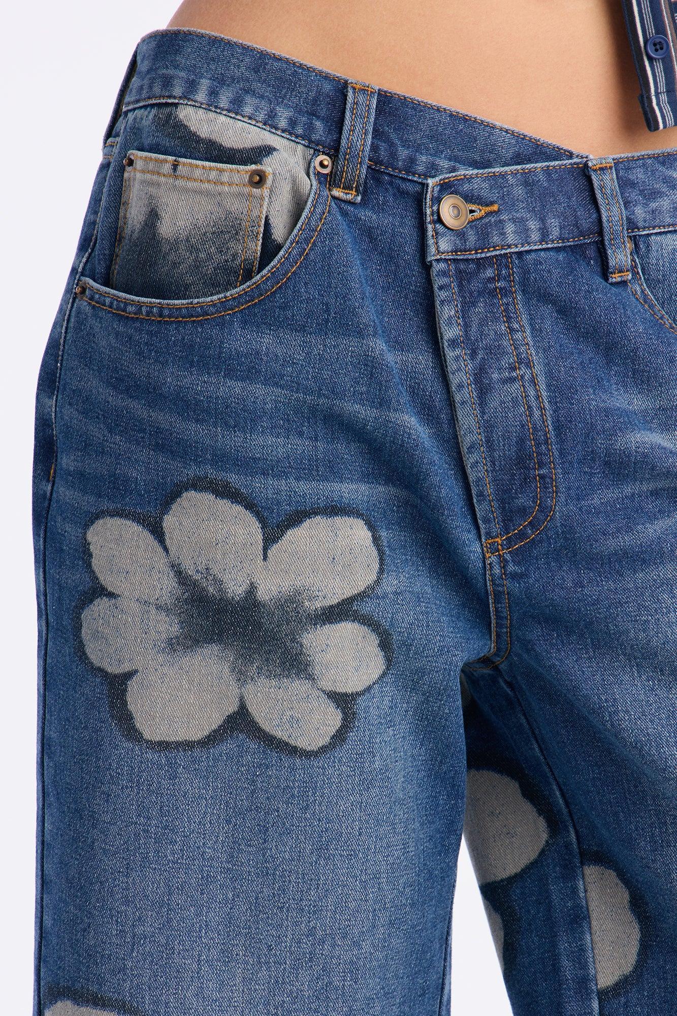 Available In Dark Wash. Denim Jort 5 Pocket Crossover Waistband Floral Print 11.75" Rise 10.5" Inseam Non-Stretch Disclaimer: Due To The Specialized Wash, Each Garment Is Unique. 80% Cotton 20% Polyester Imported
