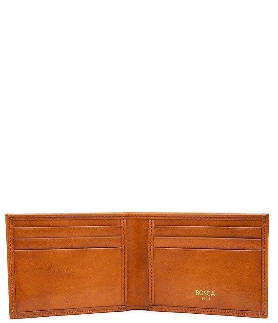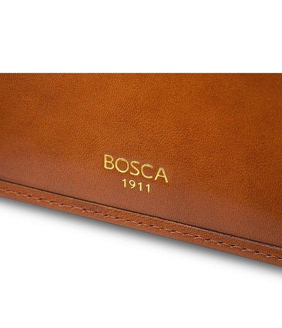 From Bosca, this wallet features: classic, refined modern style that is sure to impress simple, clean and classic styling hand-stitched, with rounded corners and turned-edge finish six card pockets to handle your ID and all of your debit, credit, loyalty and business cards two additional slash pockets for receipts and other necessary items center cash well for all of your paper bills signature old leather rich stain that highlights the natural grains and textures of the vegetable-tanned leather polished leather with high luster that results in an amazing finish Imported.
