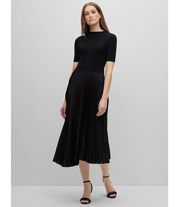 From BOSS by HUGO BOSS, this dress features: Mixed media knit and woven fabrication A-line silhouette Round neckline Short sleeves Pleated skirt Midi length Unlined Straight hemline Pullover construction Approx. 47" length Viscose/polyamide Machine wash/tumble dry Imported.