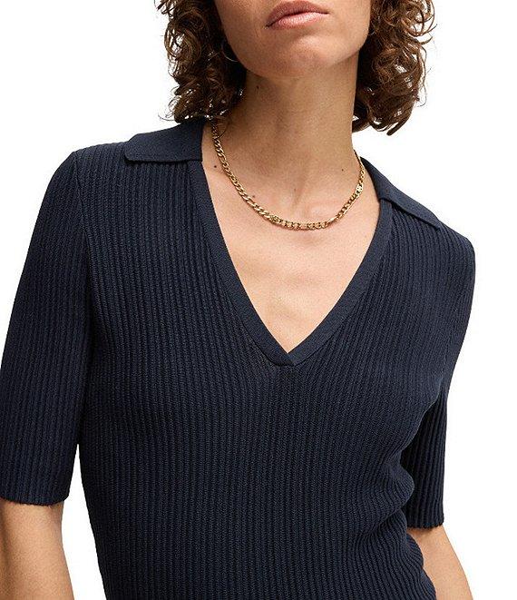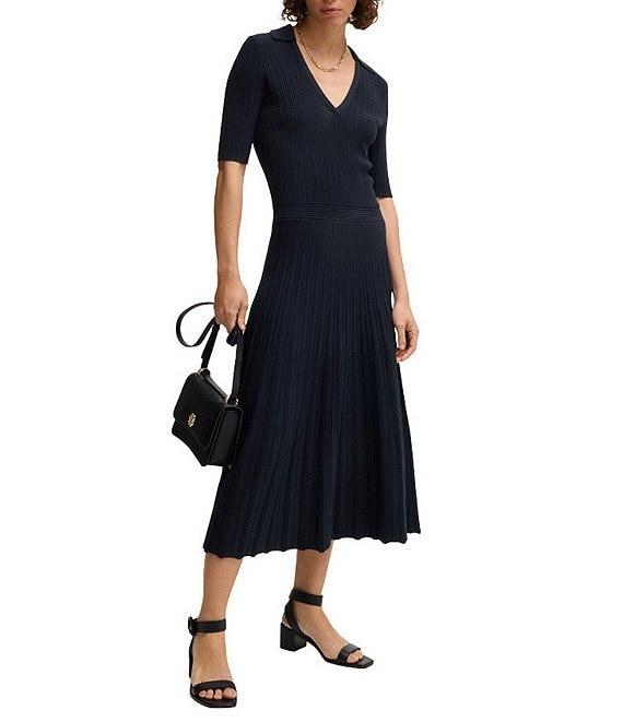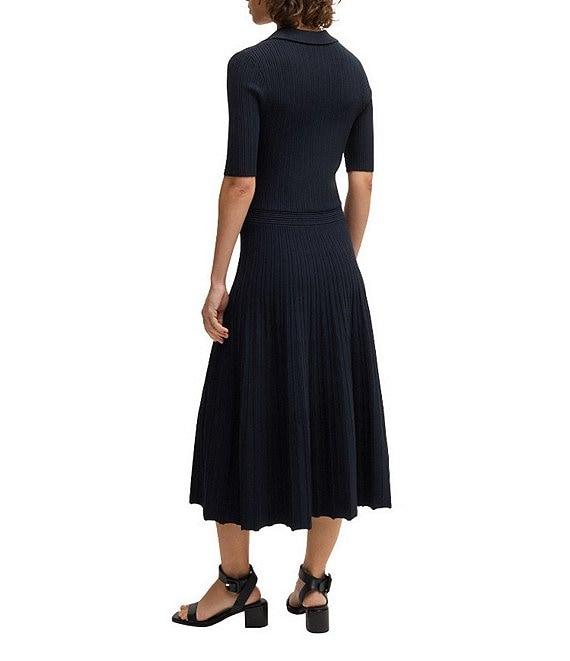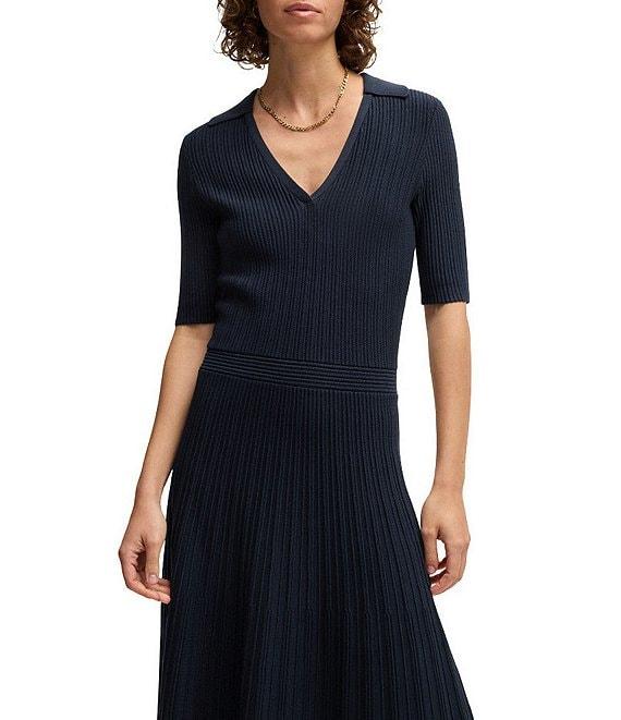 From BOSS by Hugo Boss, this dress features: Ribbed knit fabrication Fit-and-flare silhouetteV-neckline with collar Elbow sleeves Straight hem Pullover construction Approx. 46.46" length Viscose/polyamideHand wash Imported.