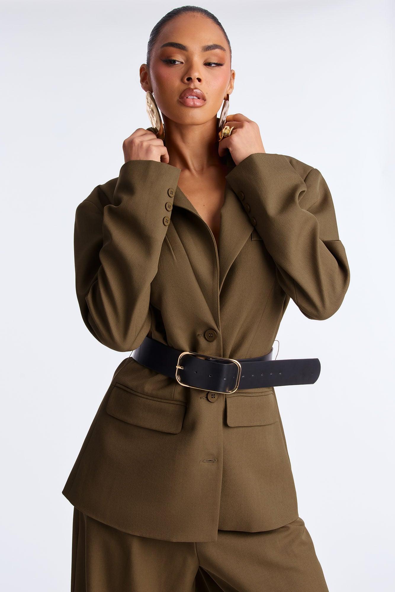 Available In Black And Olive. 3 Piece Ensemble Belt, Blazer And Wide Leg Pant Set Non Stretch 33" Inseam Shoulder Pads Detachable Belt Front Clasp And Zipper Pant Closure Pockets Self: 95% Polyester 5% Spandex Lining: 100% Polyester Imported