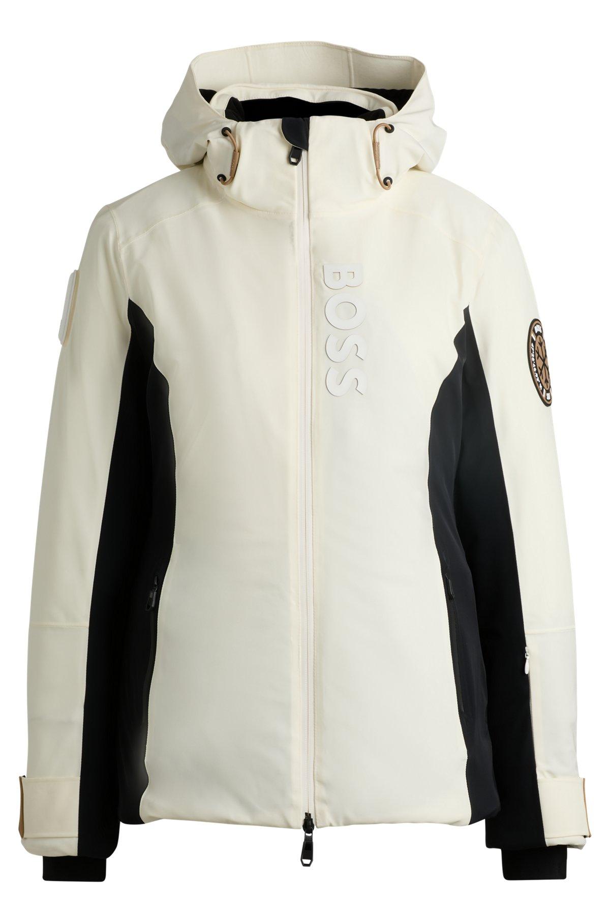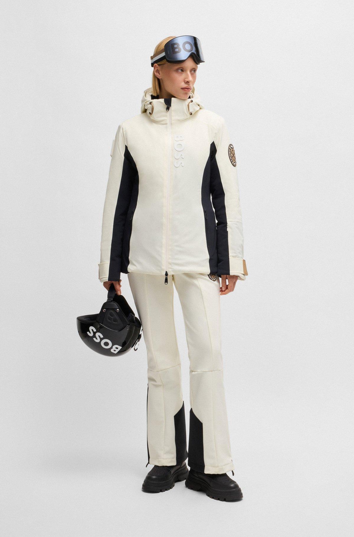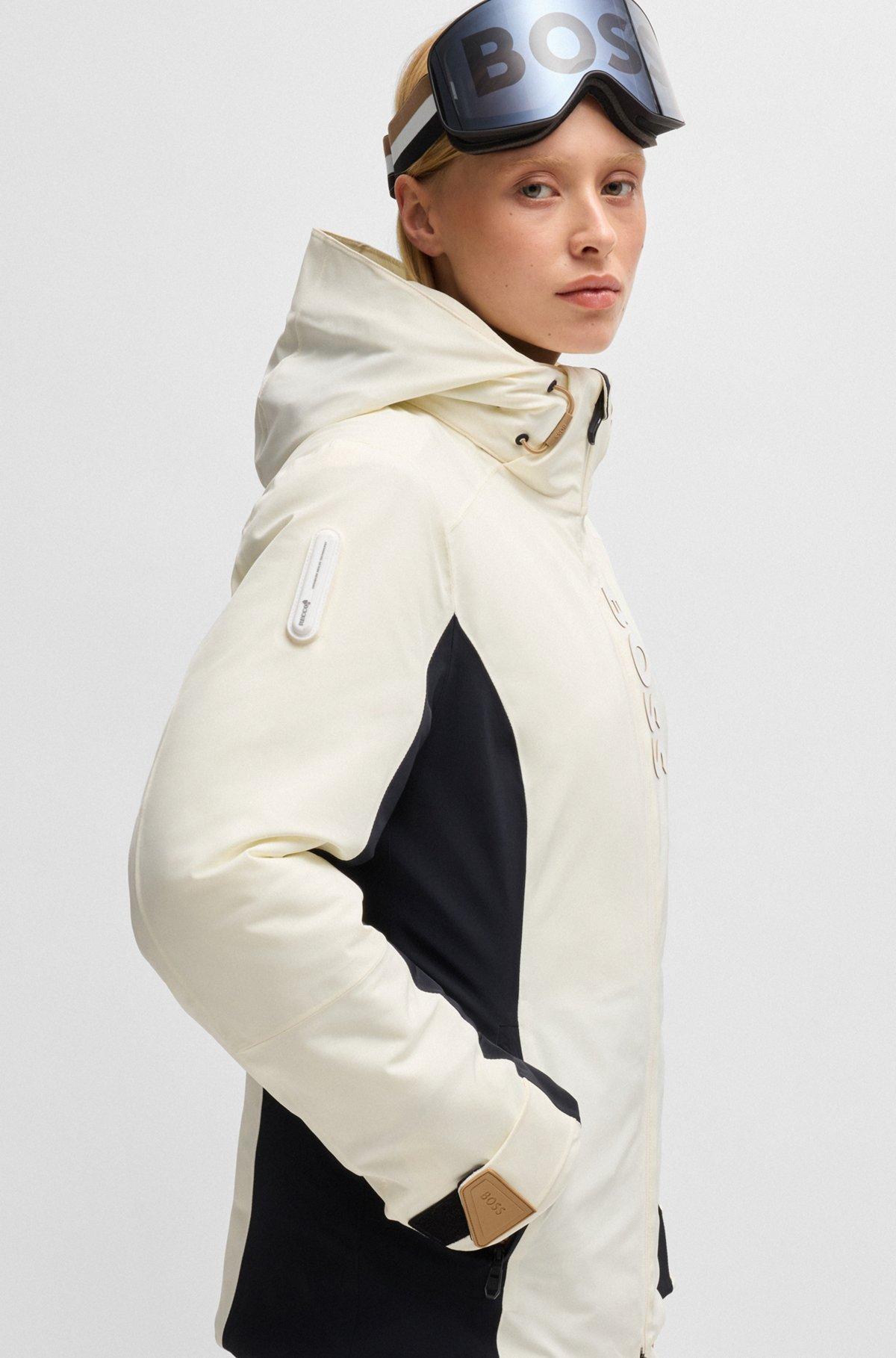 With a special snow guard and sealed seams, this women's BOSS Ski jacket keeps the elements out. Inner straps for carrying on your back. Take to the mountains in style with BOSS Ski: a collection of high-performance pieces and bold après-ski designs.