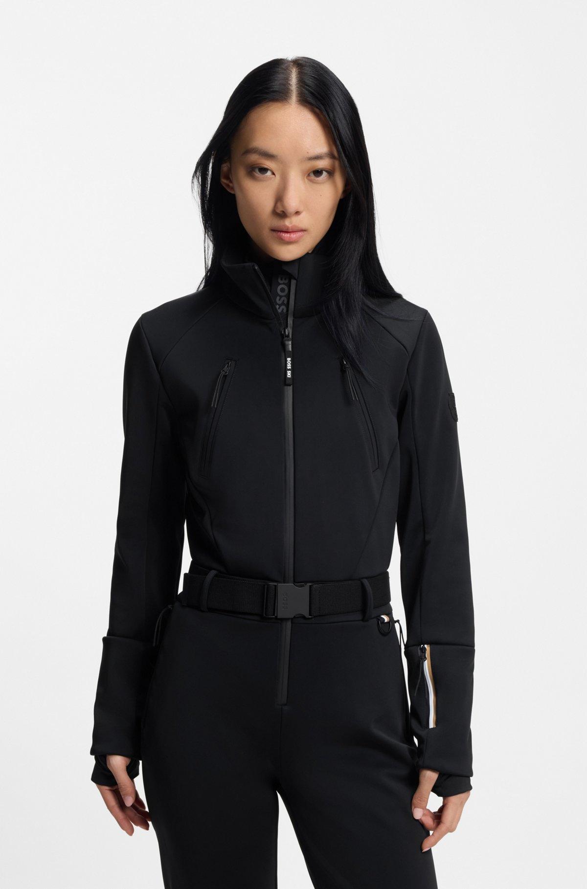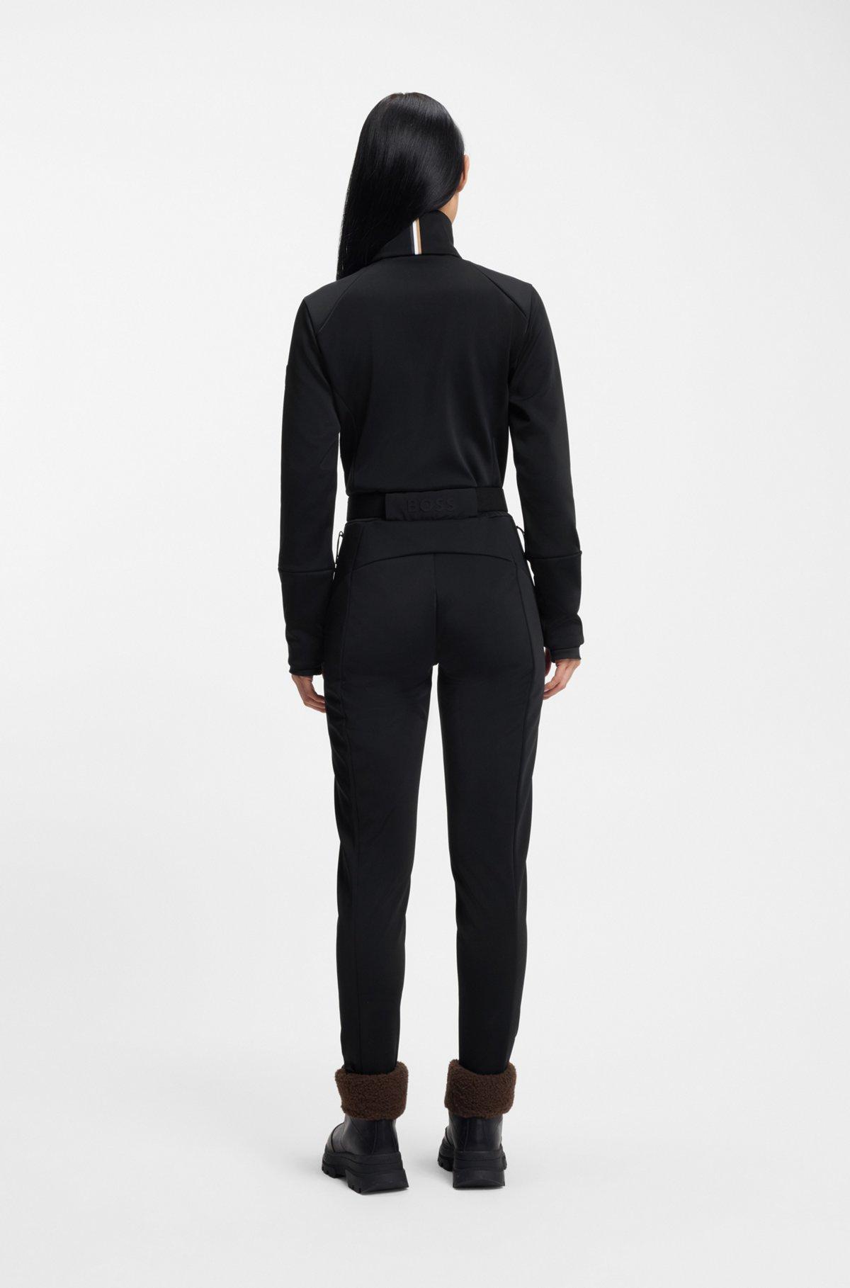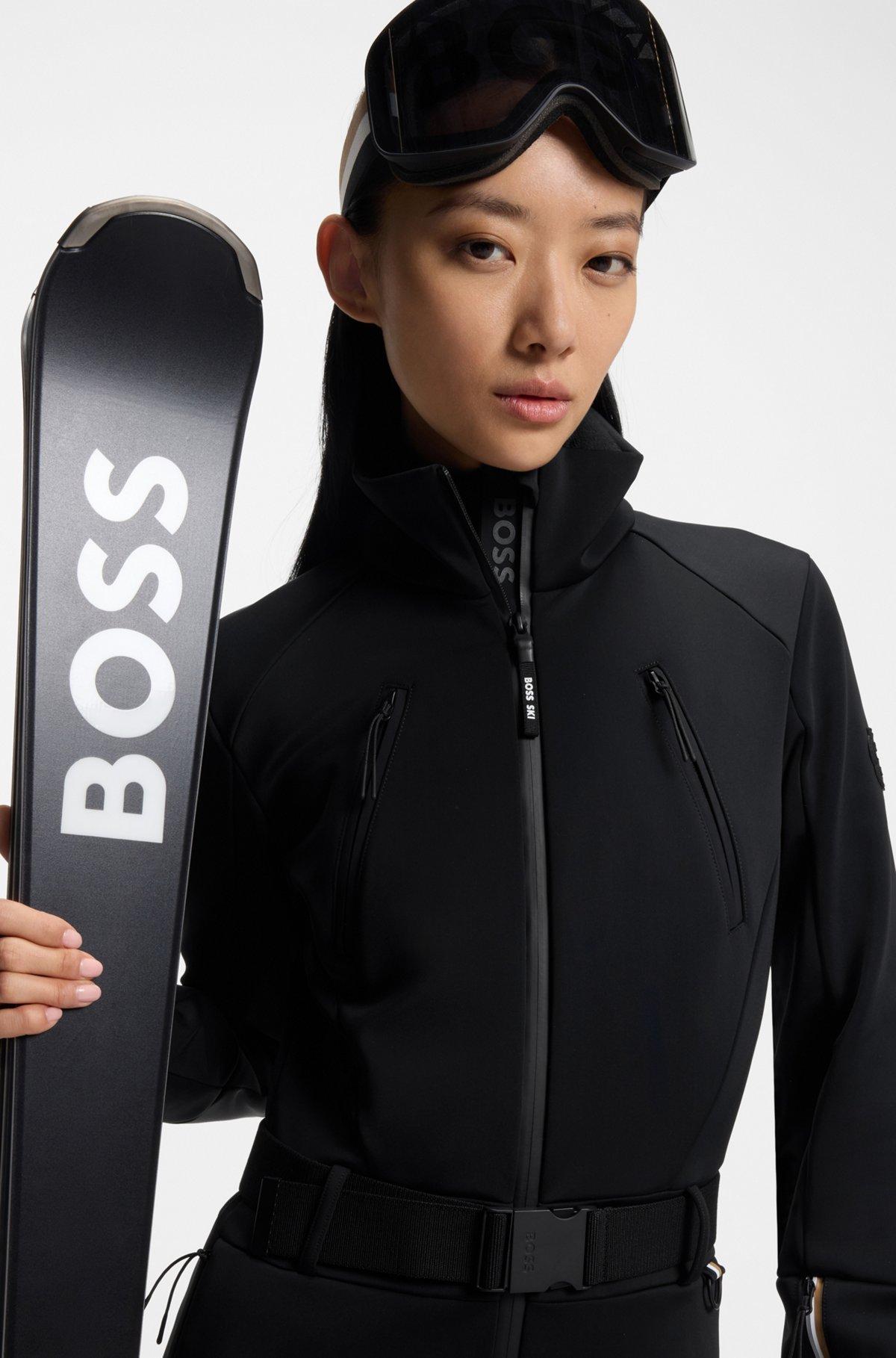 Water-repellent and cozy, this women's BOSS Ski suit is the all-in-one you're looking for. Stirrups for comfy hold. Buckled adjustable belt. Take to the mountains in style with BOSS Ski: a collection of high-performance pieces and bold après-ski designs.