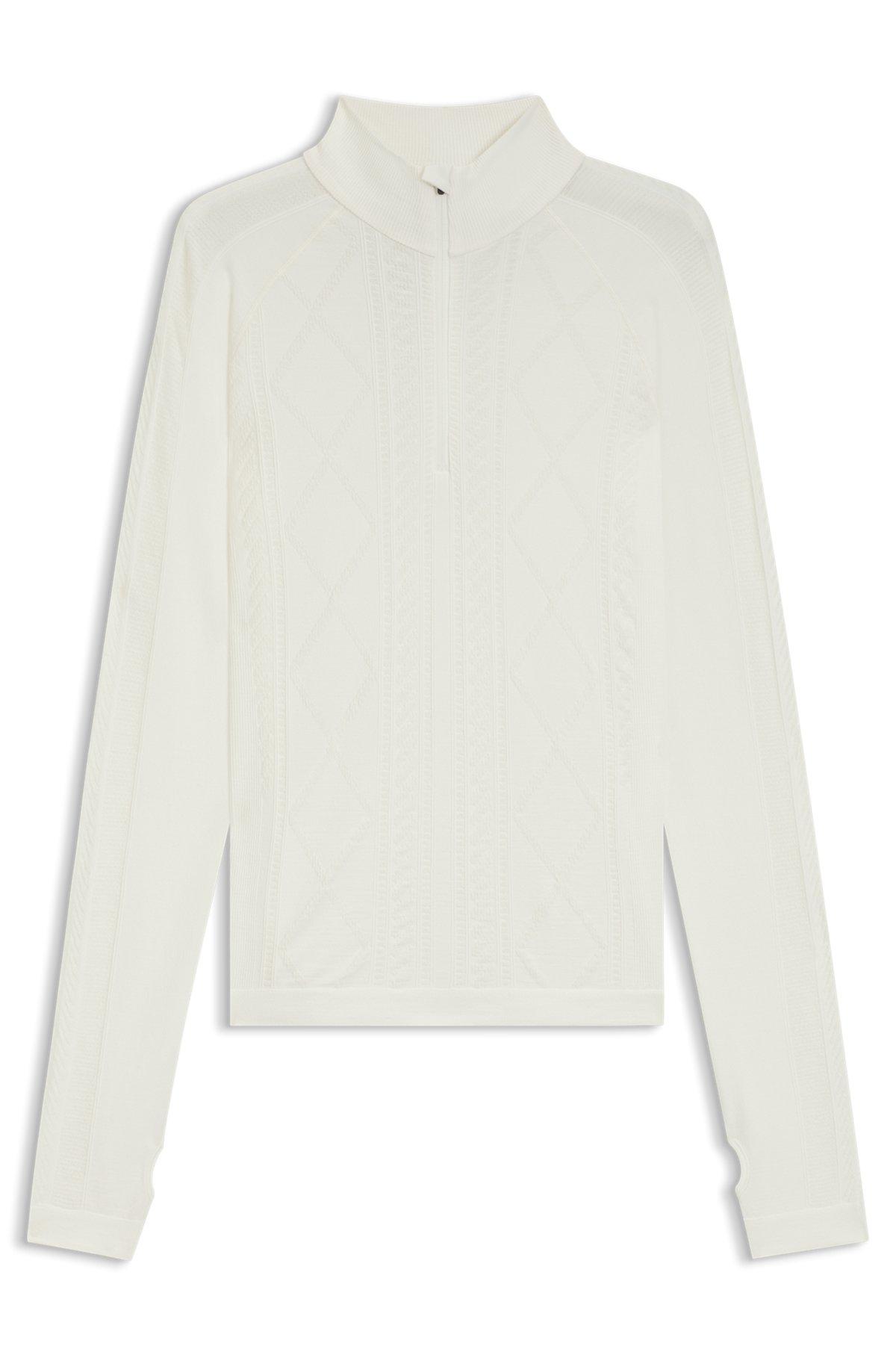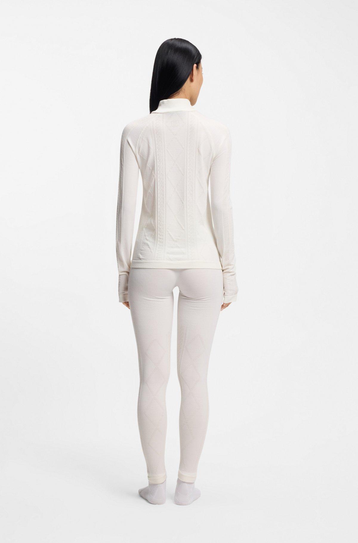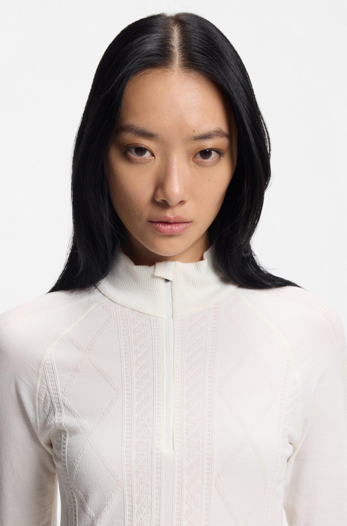 In a wool-blend jersey knit, this slim-fit women's BOSS Ski top is an insulating-yet-breathable base layer for wearing under ski suits or simply relaxing in. With a zip neckline and thumbholes. Take to the mountains in style with BOSS Ski: a collection of high-performance pieces and bold après-ski designs.