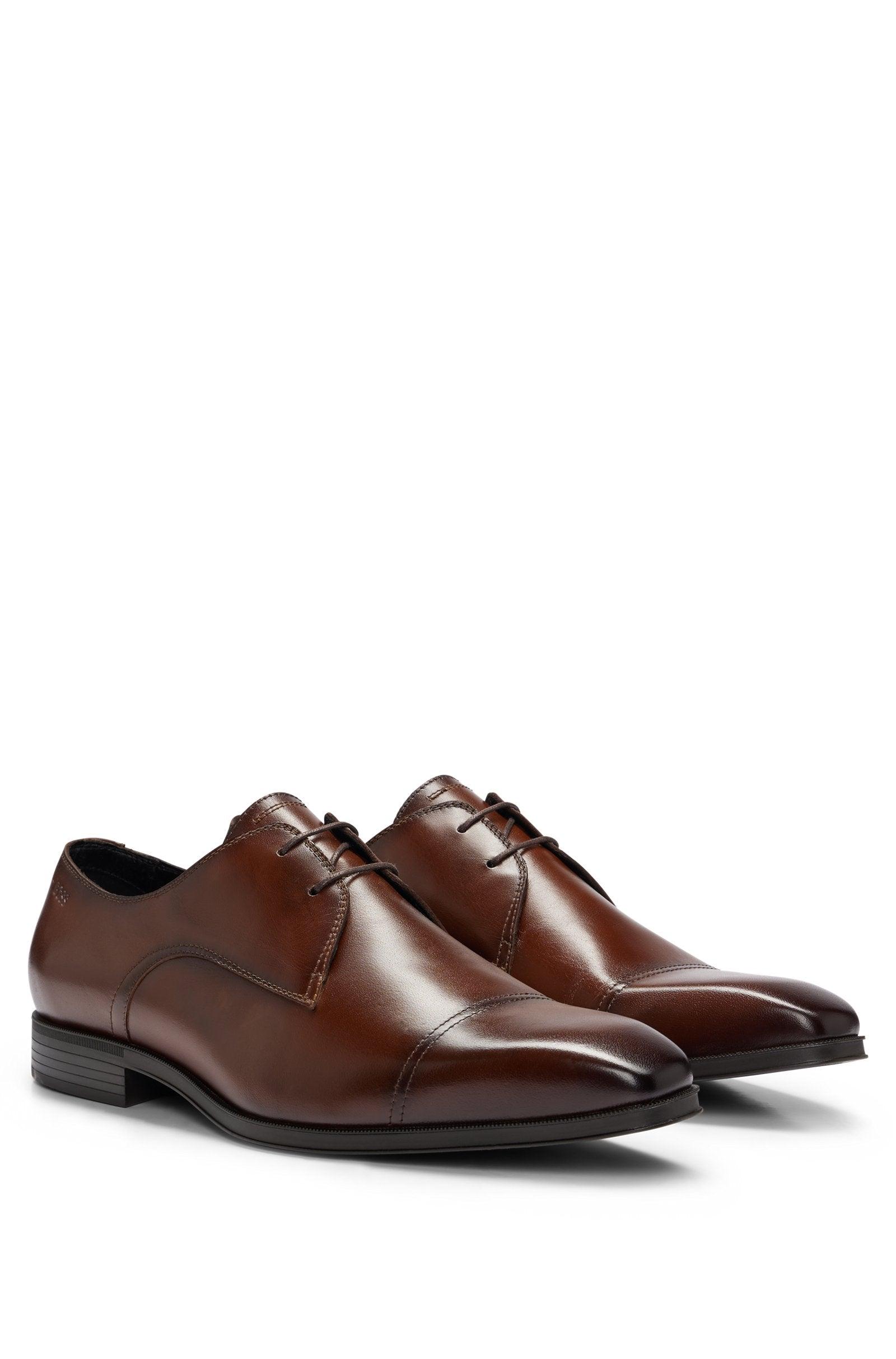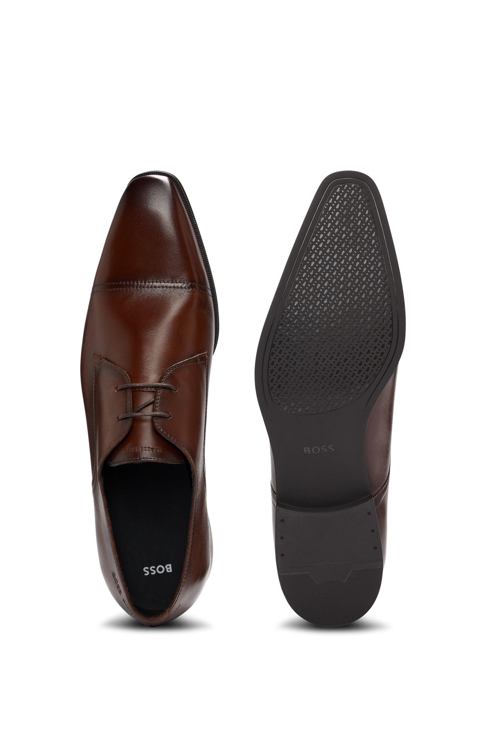 The Boss Theon Derby Brown Dress Shoes are elegantly styled with smooth leather and embossed branding on the topline. With a minimum of 60% leather sourced from certified tanneries, these shoes showcase our commitment to responsible production. Fully lined and packaged in a box, these Derby shoes are the perfect blend of style and sustainability.