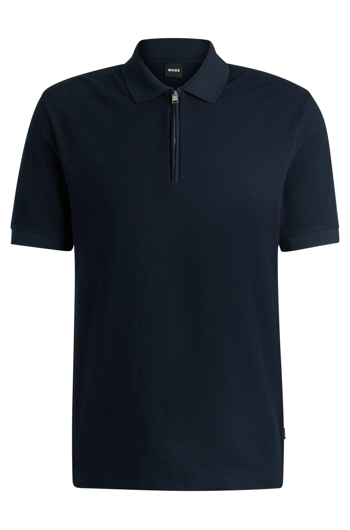 BOSS - Zip-neck knit polo shirt with waffle structure - Dark Blue