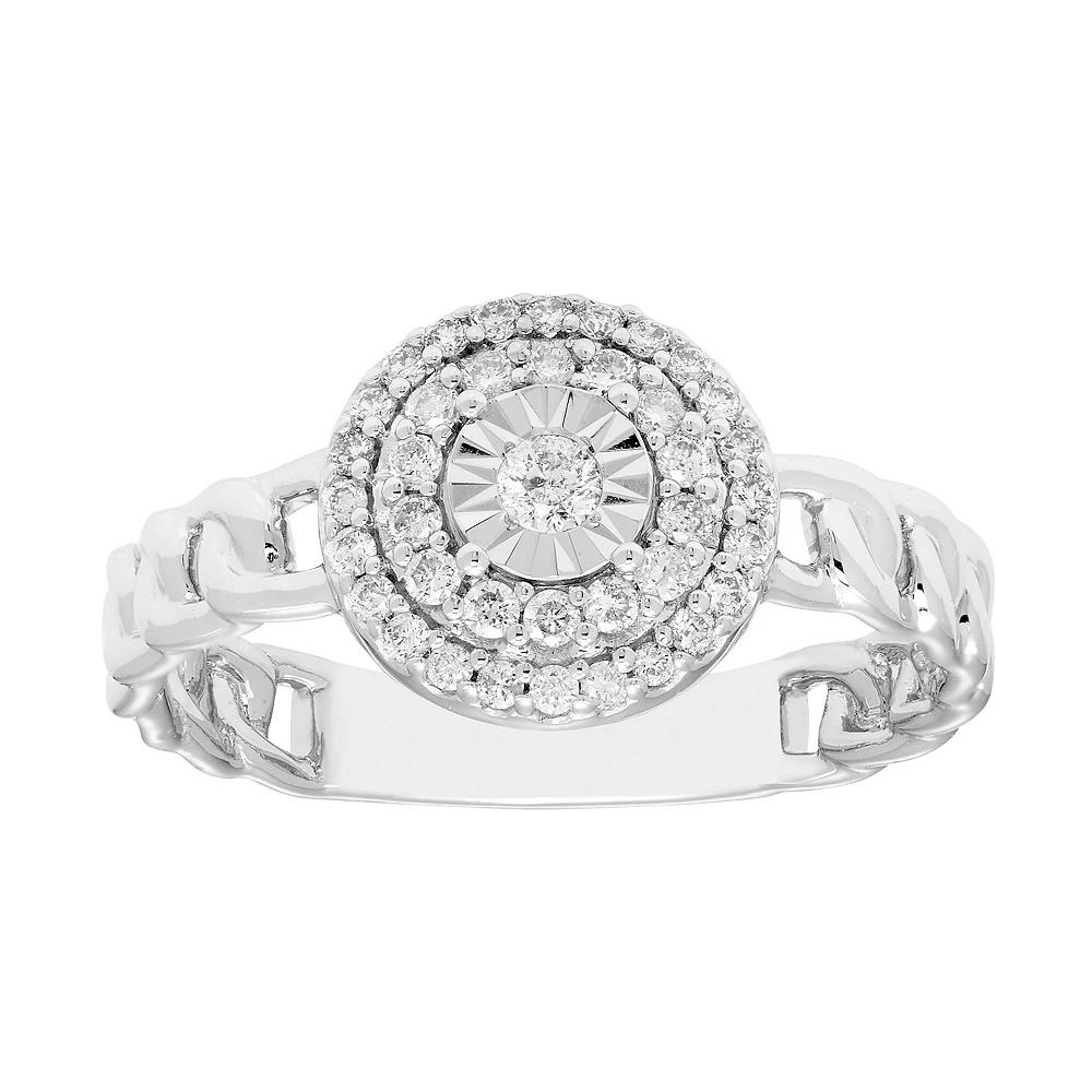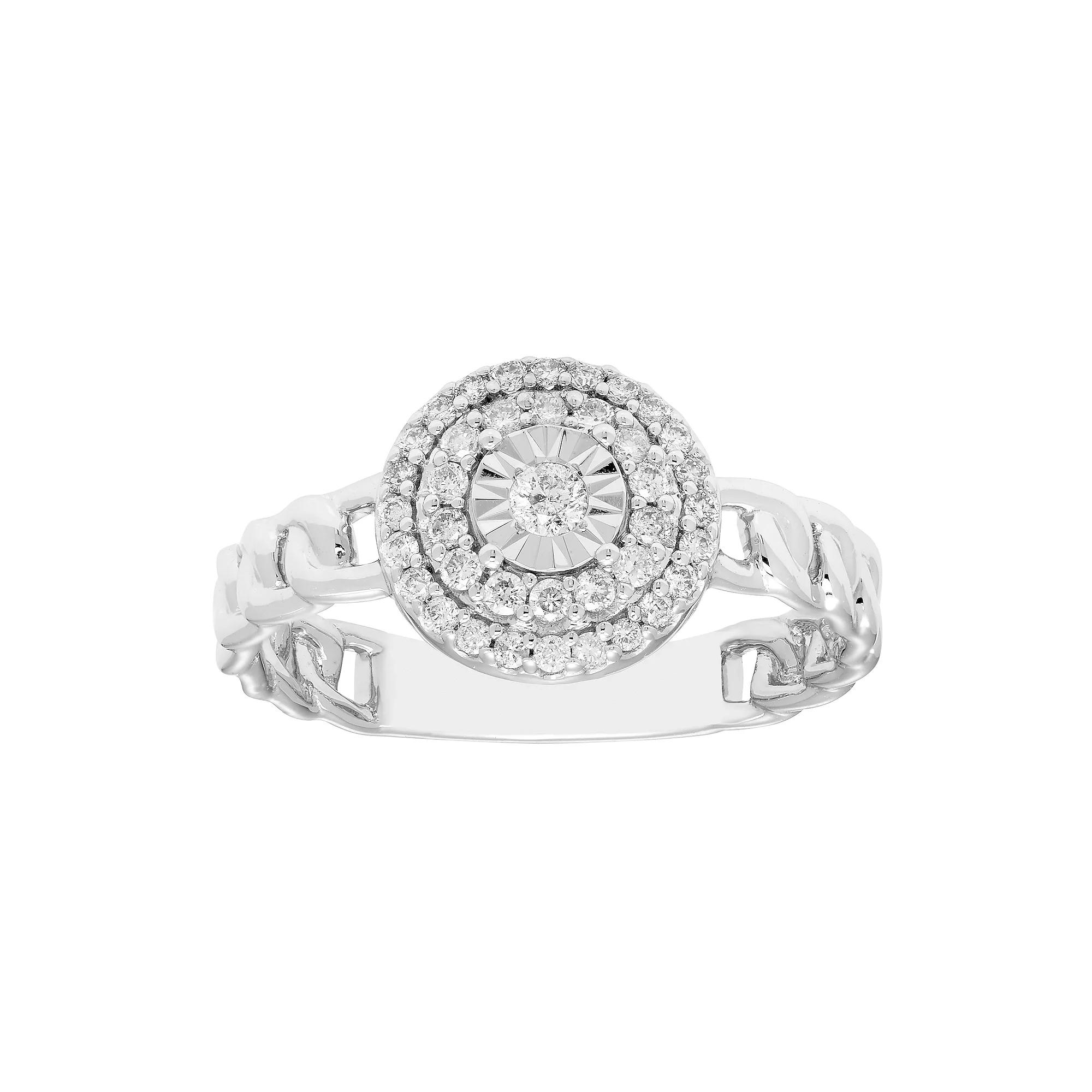 Featuring an illusion-set diamond center stone surrounded by halos of diamond side stones, this Boston Bay Diamonds ring is simply enchanting. Featuring an illusion-set diamond center stone surrounded by halos of diamond side stones, this Boston Bay Diamonds ring is simply enchanting. Width: 10 mm Metal: sterling silver Plating: rhodium Finish: polished Packaging: boxedDIAMOND DETAILS Total weight: 1/4 ct. Shape: round brilliant Setting: bezel, micro prong Diamond weights are approximate. Diamond total weights may vary between .01 and .08 ct. Some diamonds have fewer than 17 facets. Gemstones may have been treated to enhance their appearance. Special care may be required. Please visit our Gemstone Treatment & Special Care Guide for more information. Image(s) may be enlarged to show detail. Please note, due to the high value of this item, a signature may be required upon delivery. Size: 6. Color: White. Gender: female. Age Group: adult.
