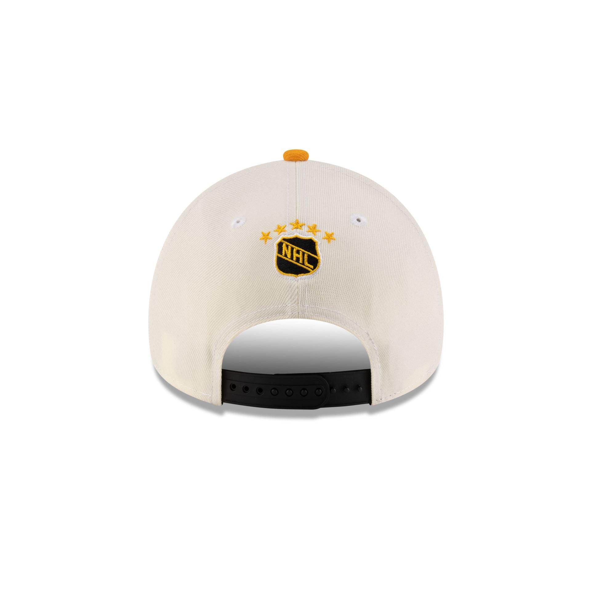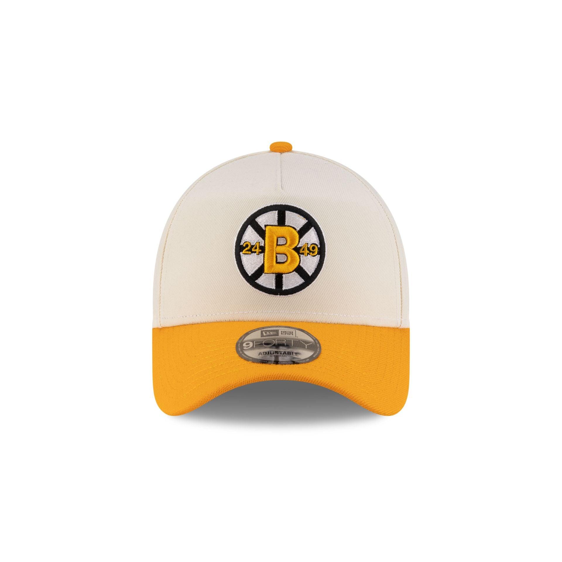 The Boston Bruins Chrome White 9FORTY A-Frame Trucker features an embroidered commemorative Bruins logo at the front panels with the NHL Shield and stars above a snapback closure at the rear and a green undervisor.