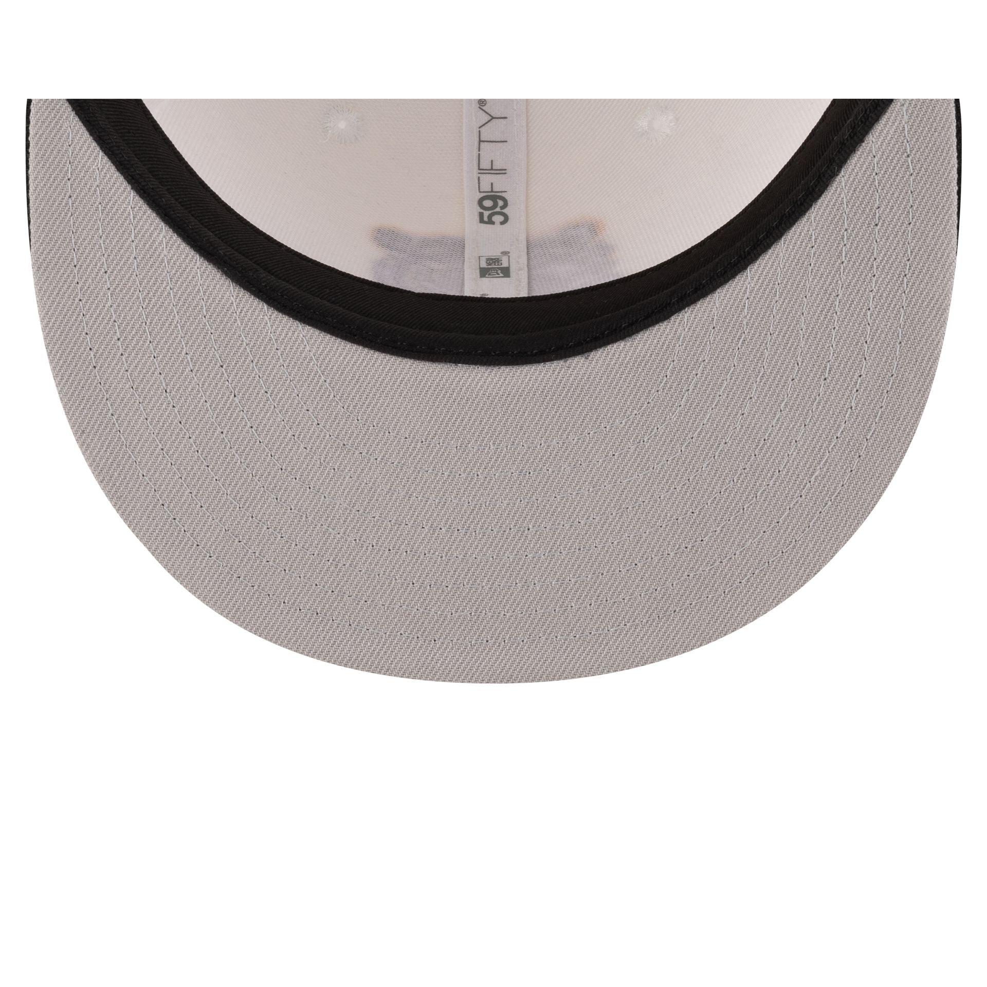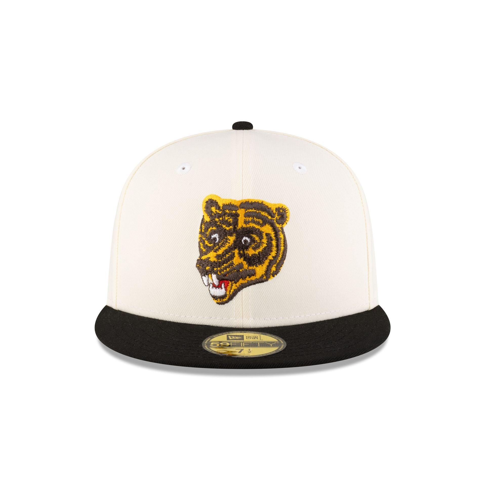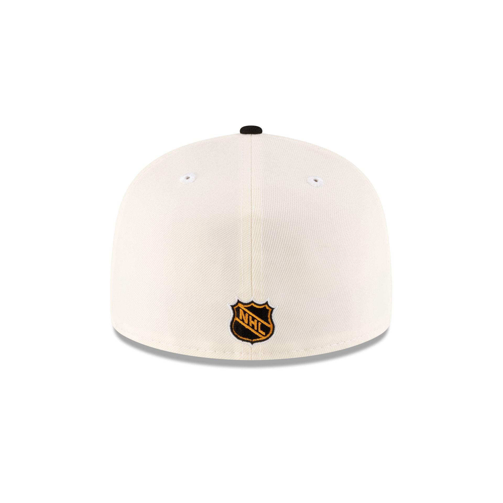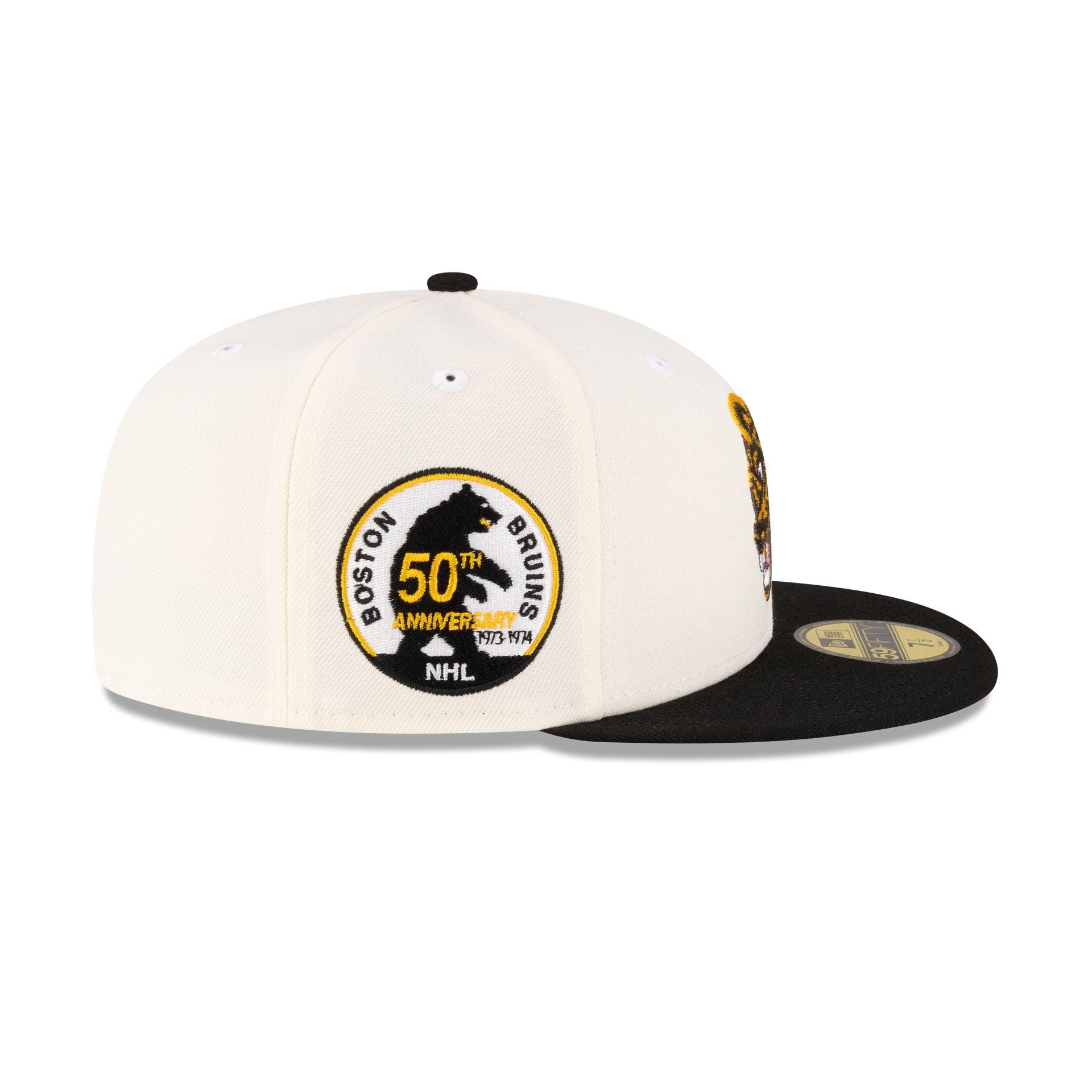 The Boston Bruins Historic Bear 59FIFTY Fitted Cap features an embroidered Bruins Historic bear logo at the front panels with a 50th Anniversary patch at the right-wear side. Additional details include a matching NHL Shield at the rear and a gray undervisor.