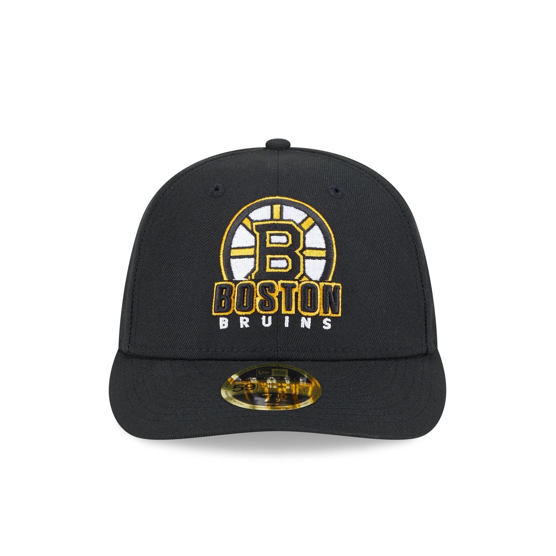 The Boston Bruins NHL Pack Low Profile 59FIFTY Fitted Cap features an embroidered Bruins wordmark over a team logo at the front panels with a matching NHL Shield at the rear. Additional details include a team logo at the right-wear side with a green undervisor.