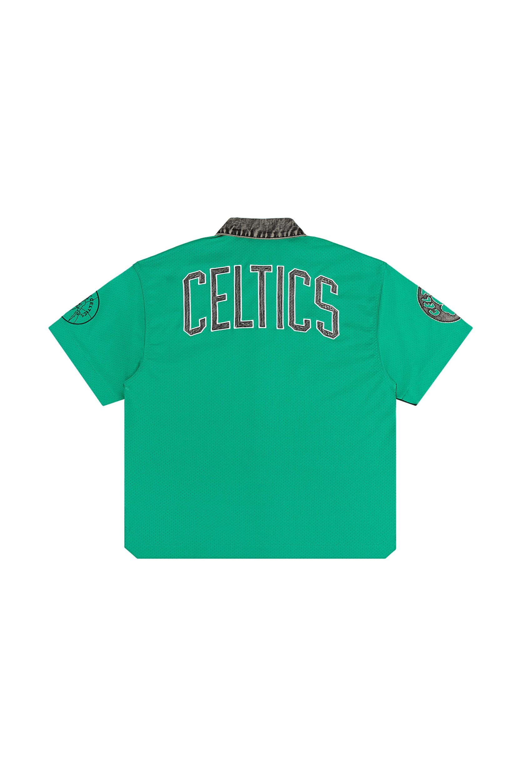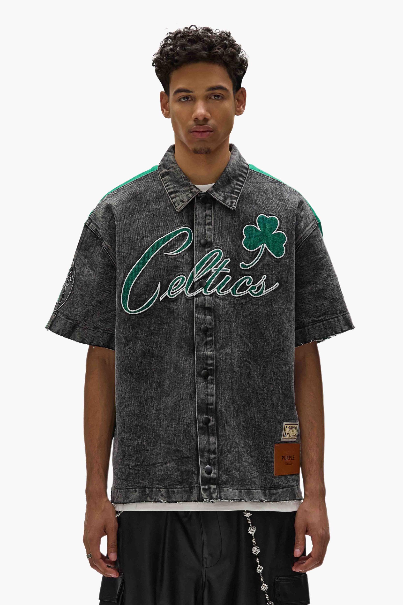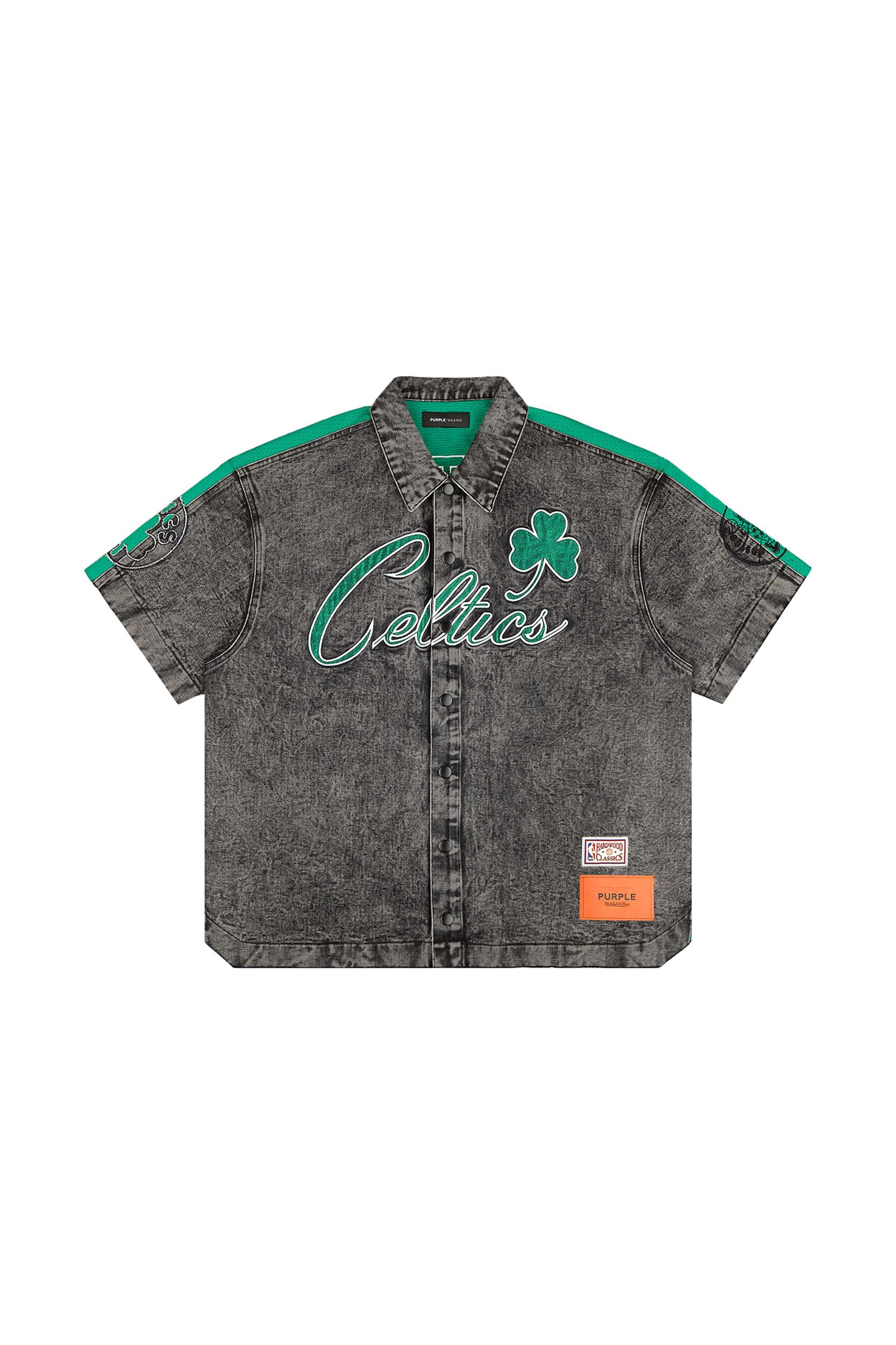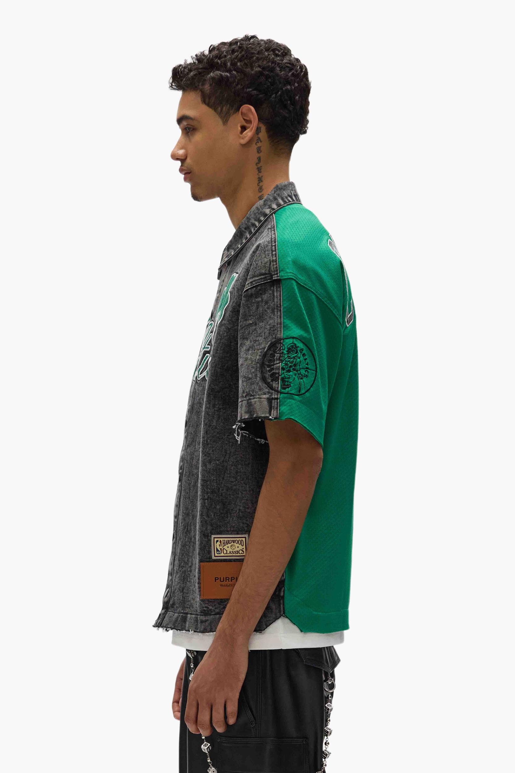 A nod to retro courtside fashion, elevated with premium finishes. This shirt is cut from stone washed denim at the front and heavyweight sport mesh at the back. It has a raw edge finish at the cuff & hem for an elevated look. The Mitchell & Ness x Purple Brand collaboration reimagines classic NBA apparel through a modern lens, combining vintage-inspired silhouettes with premium materials for a fresh take on fan-favorite styles. White Label Front: 100% Cotton, Back: 100% Polyester Oversized Fit Imported Embroidered Fabric Applique Graphics Leather Brand Tag Vintage Wash Denim front Mesh Fabric Back Self-Fabric Collar Full Button Front Officially Licensed Machine Wash, Tumble Dry Low