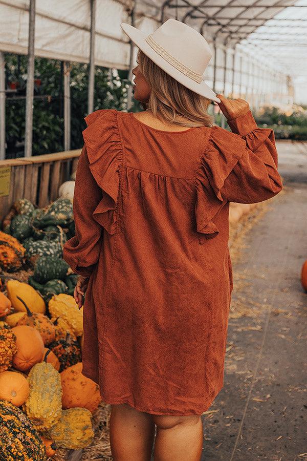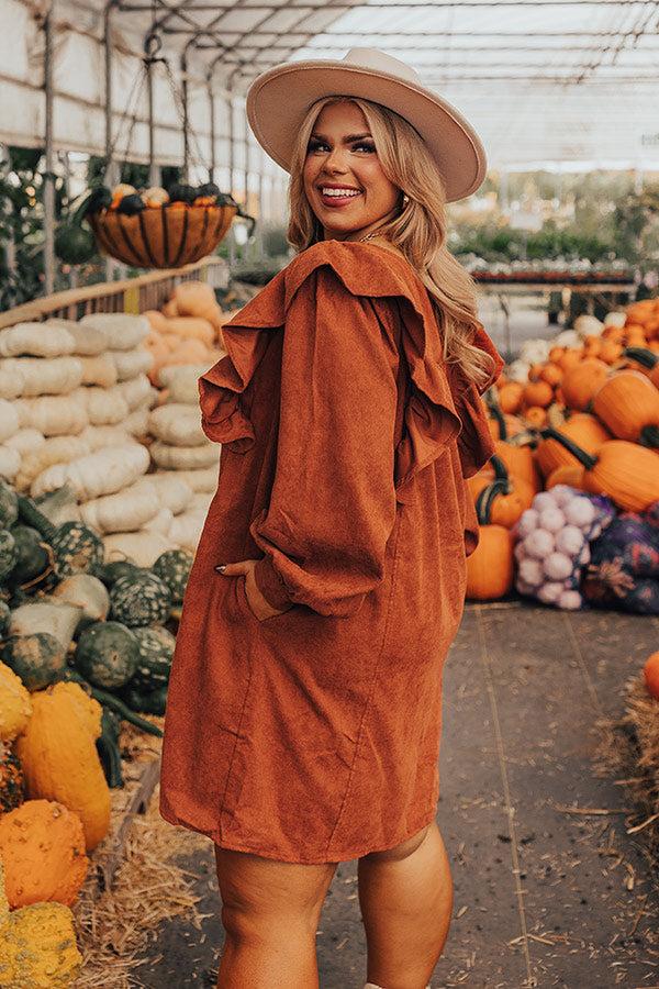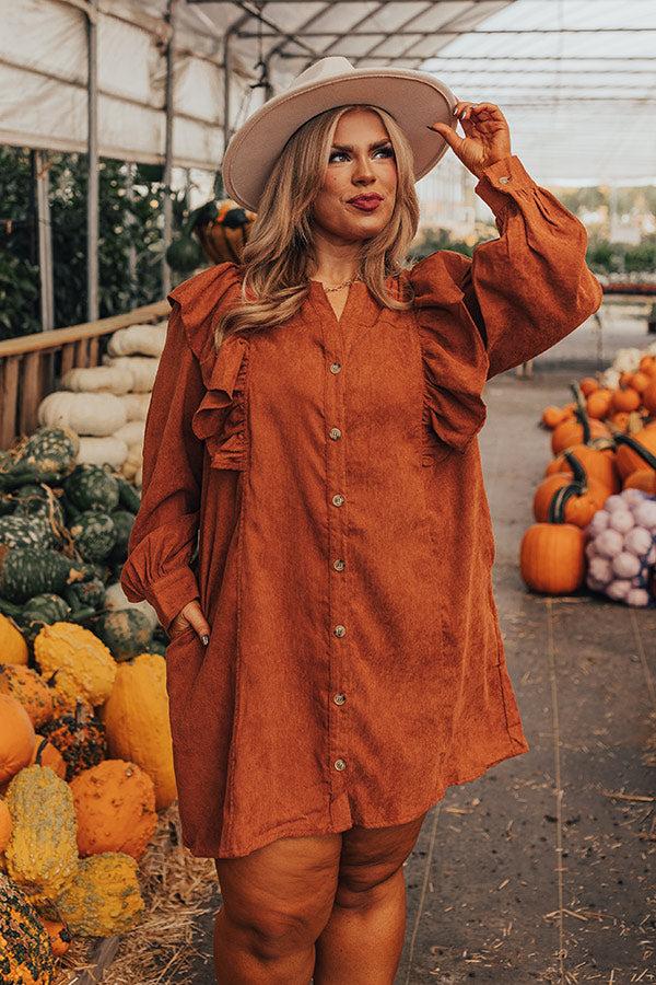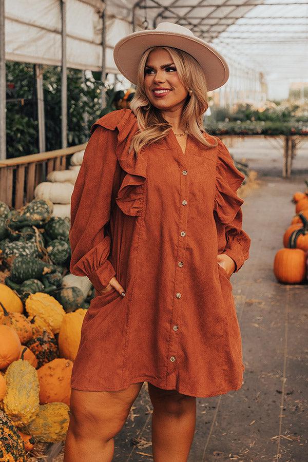– May your fashion dream come true with this trendy dress! – Lightweight camel corduroy material – Button up, v-cut neckline – Long, loose sleeves with button closure cuffs – Two hidden side pockets – Ruffle accent – Relaxed silhouette that falls into a straight hemline