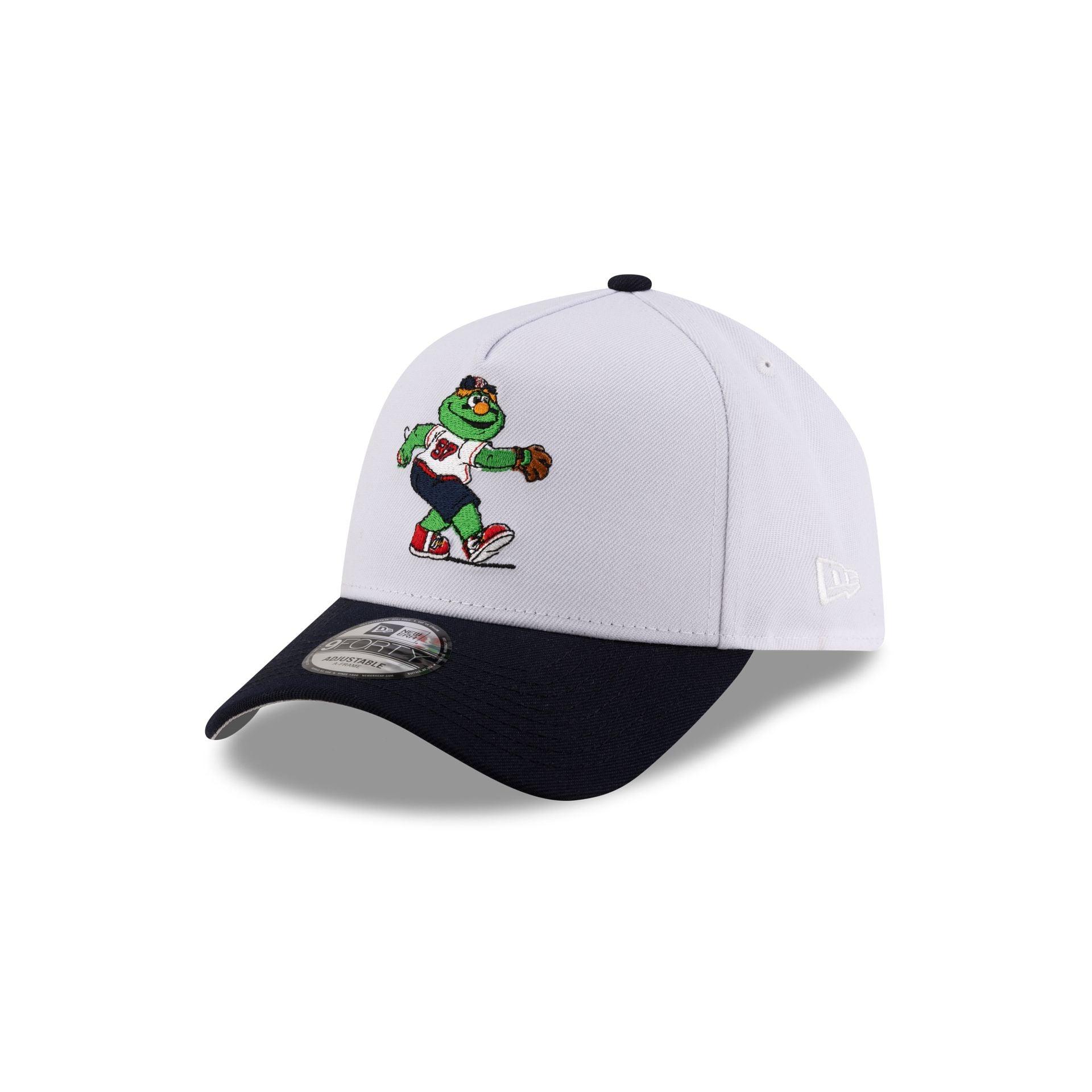 The Boston Red Sox Mascot White 9FORTY A-Frame Snapback features an embroidered Red Sox mascot at the front panels with a 90th Anniversary patch at the right-wear side. Additional details include a snapback closure at the rear and a gray undervisor.
