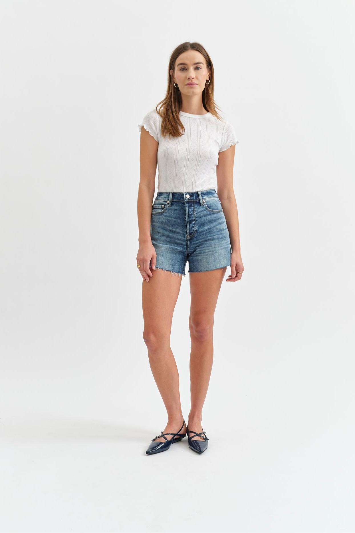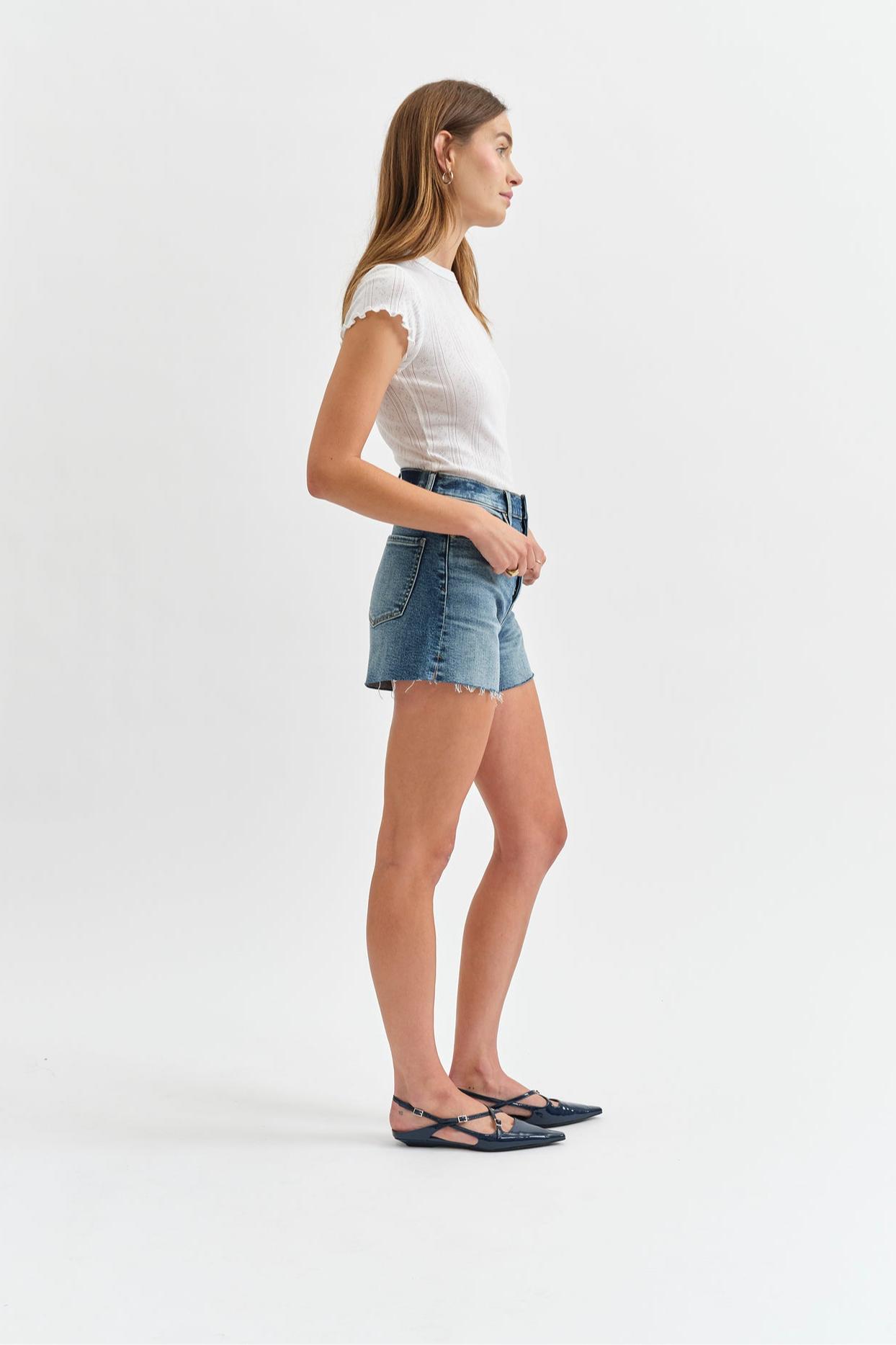 The Bottom Line is a high rise denim short with slightly more coverage than your average cut-off. This versatile short features scissor-cut hems set against a dark wash with dramatic highs and lows. Constructed from our Hug fabric, this short is flexible enough to hug your body, heavy enough to cinch you in.