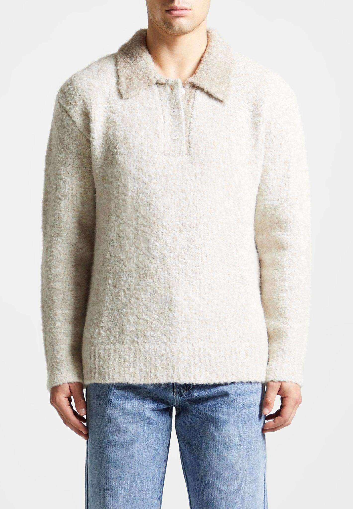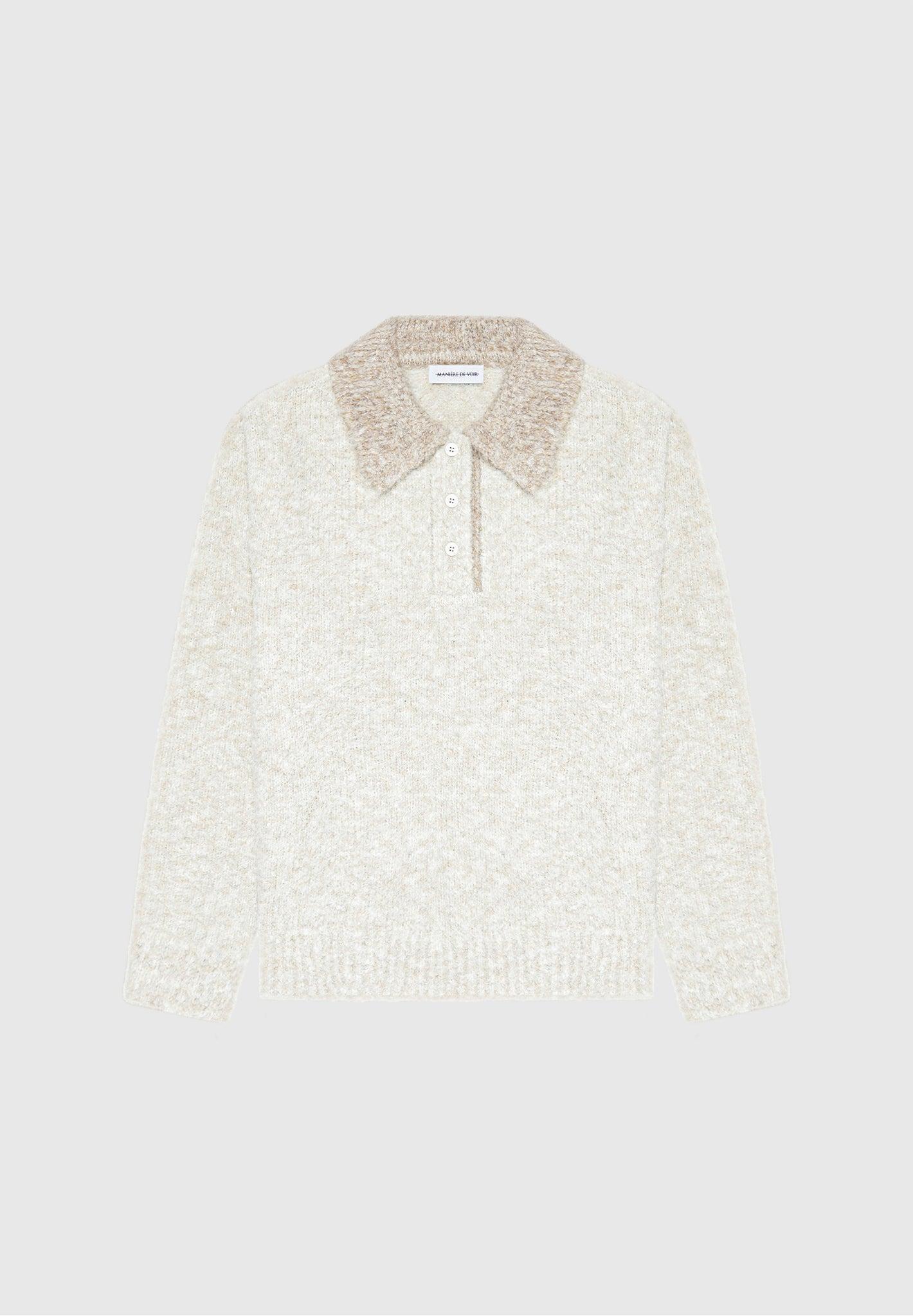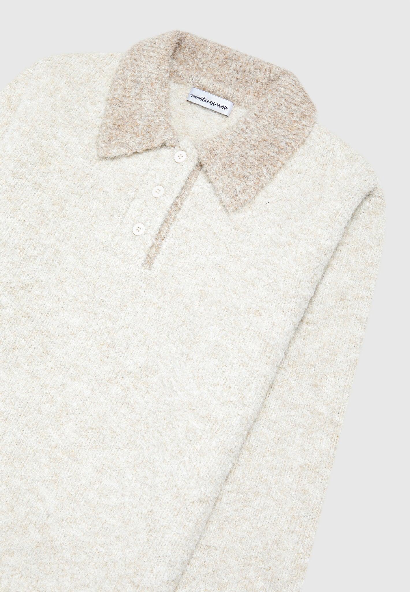 This Boucle Knit Polo Jumper has a cream contrast with a quarter button closure. Its classic design allows for a comfortable, yet fashionable look. It's sure to be an essential piece for any wardrobe. Polo Silhouette Relaxed Fit Quarter Button Closure Classic Collar Silver Manière De Voir Eiffel on Back 10% Wool, 20% Acrylic, 50% Recycled Polyester, 18% Nylon, 2% SpandexAlways check the care label for wash instructions.