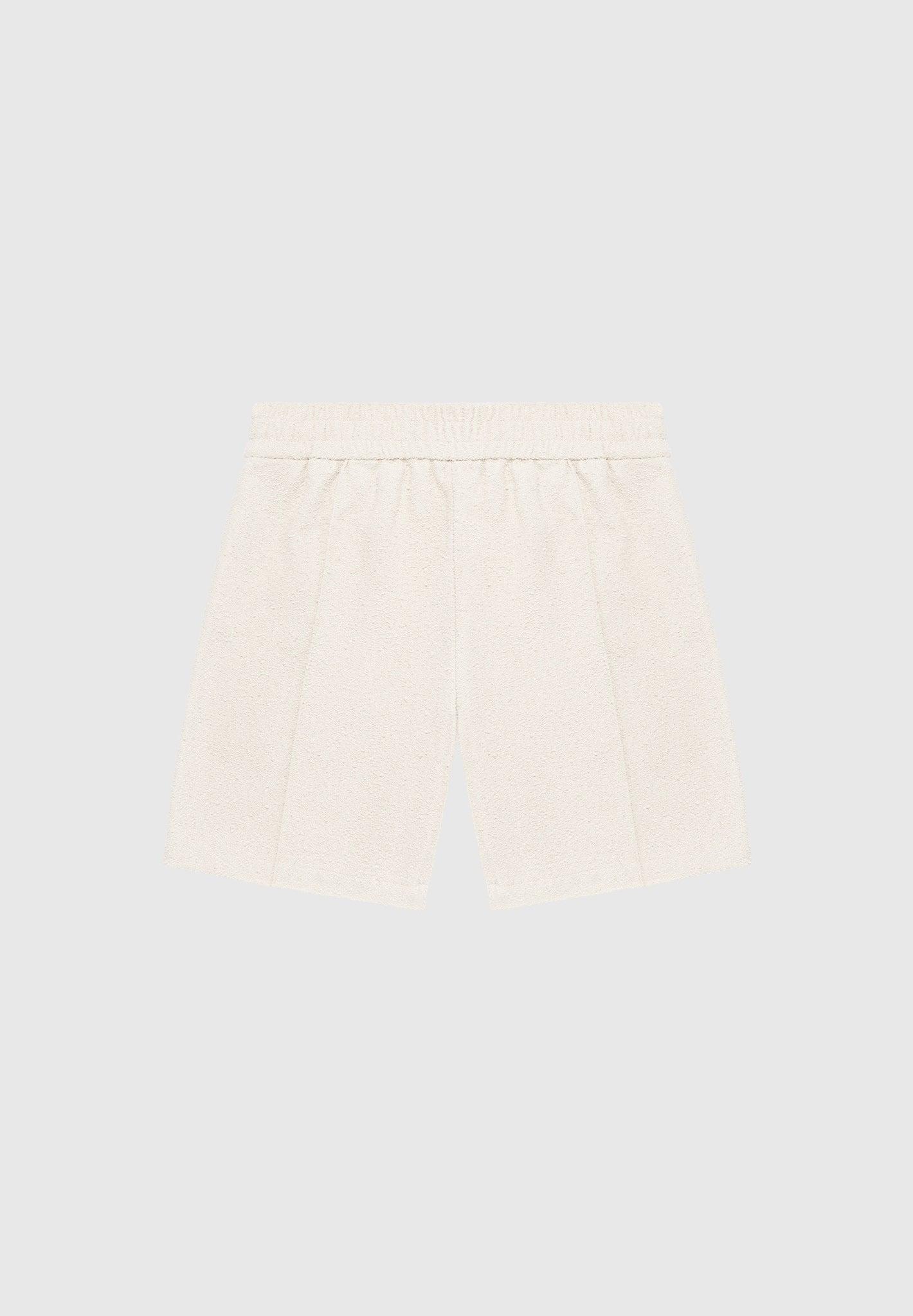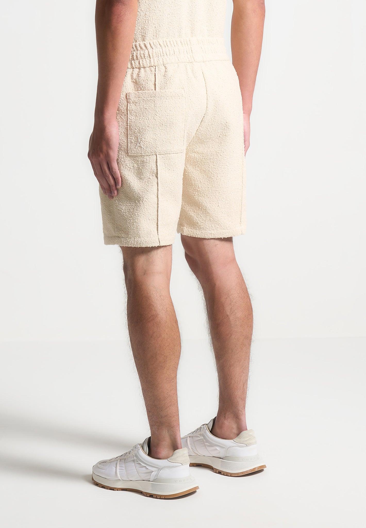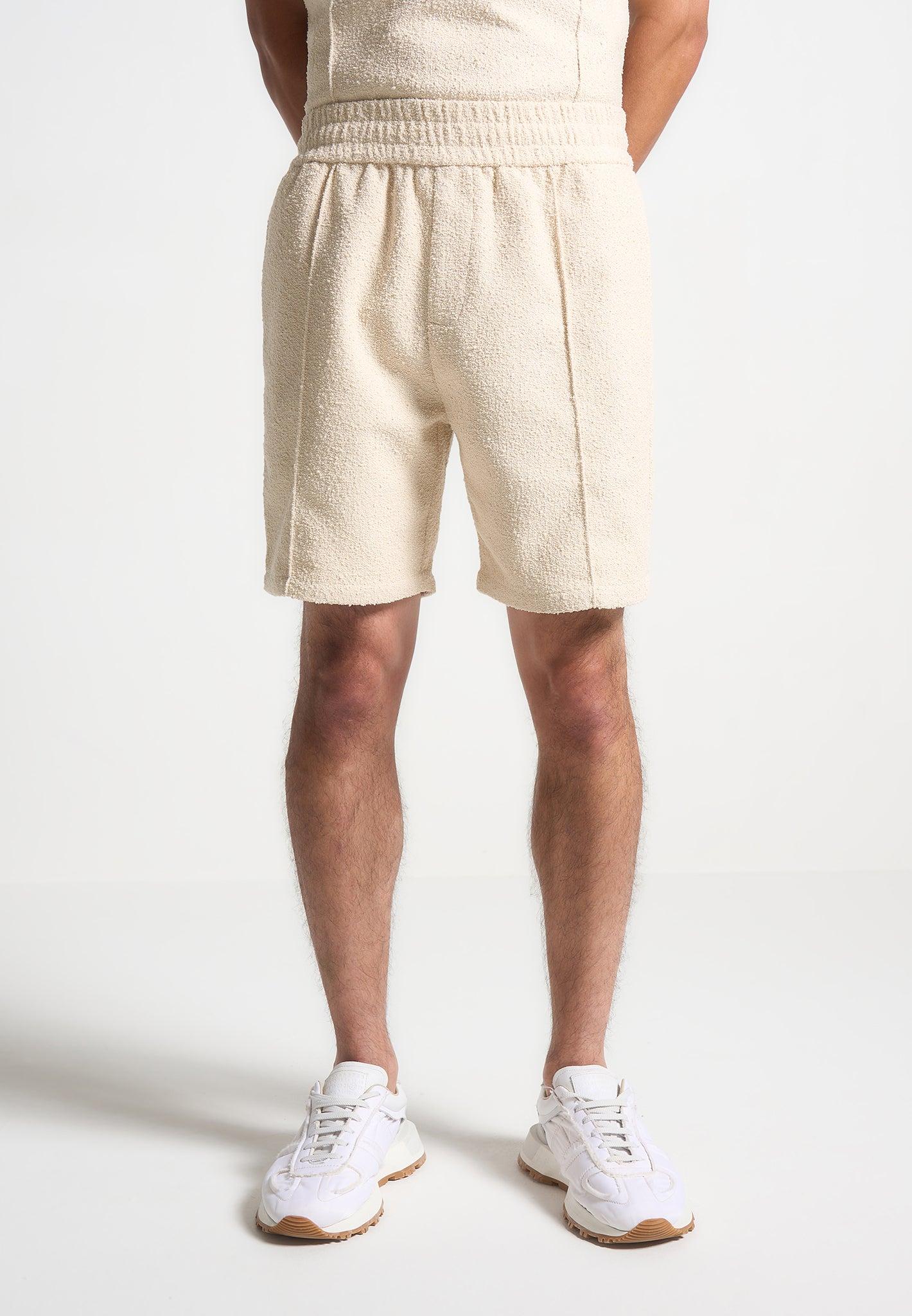 These Boucle Knit Shorts in Beige are made with a textured quality fabric, featuring an elasticated waistband for a comfortable fit. The pleat to crease detail adds a modern touch to these classic shorts. Perfect for any occasion, these shorts combine style and comfort effortlessly. Fabric: Always check the care label for wash instructions. Model is 6'0", 40" Chest, 30" Waist and Wears Size Medium Based On Size M - Front Length cm/in, Chest cm/in, Sleeve Length cm/in Stretch Factor - /3