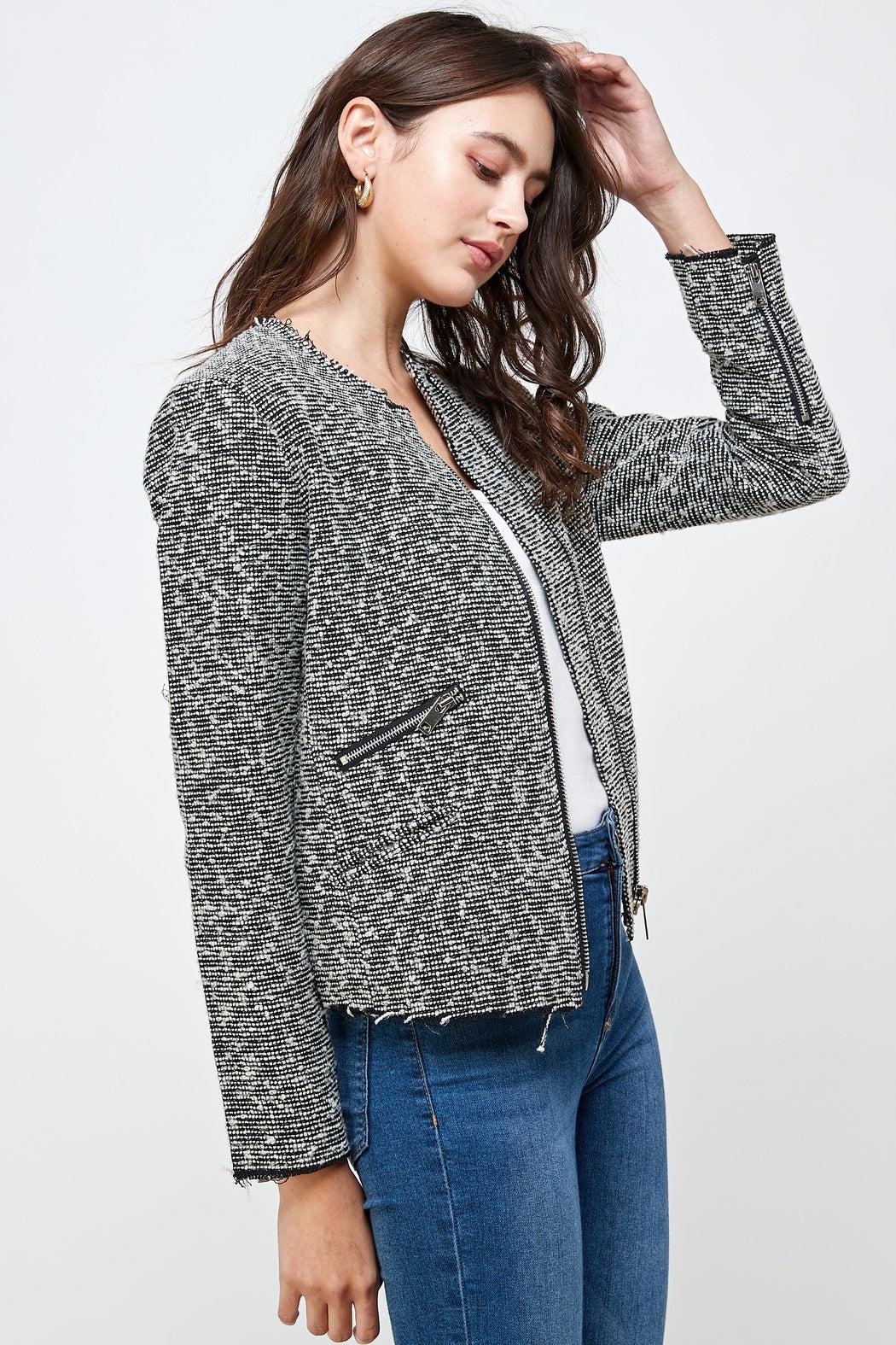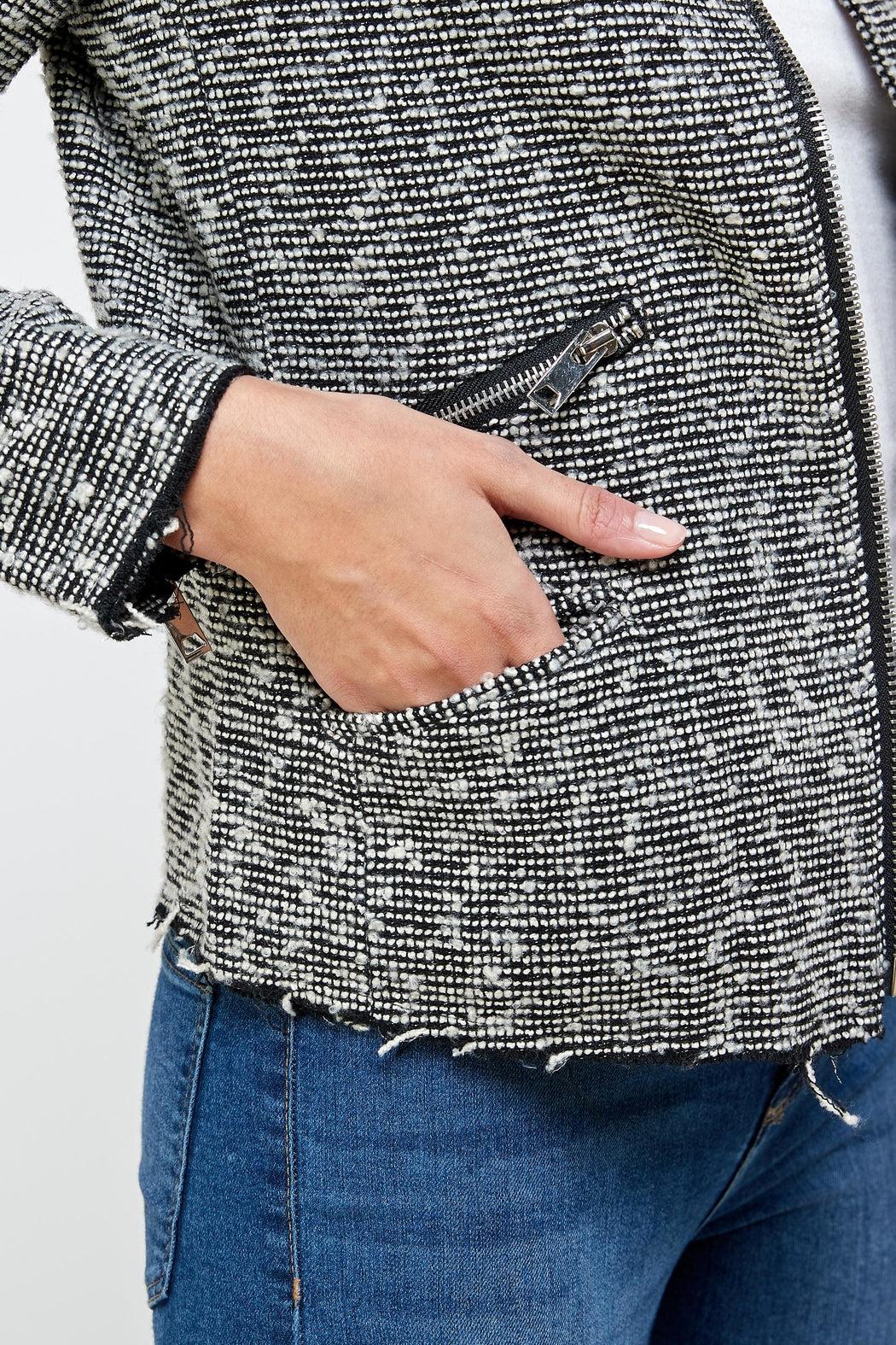 Boucle Tweed Biker Jacket Top Model Height is 5'-8" Model Size is 30-24-35 Model is wearing size Small