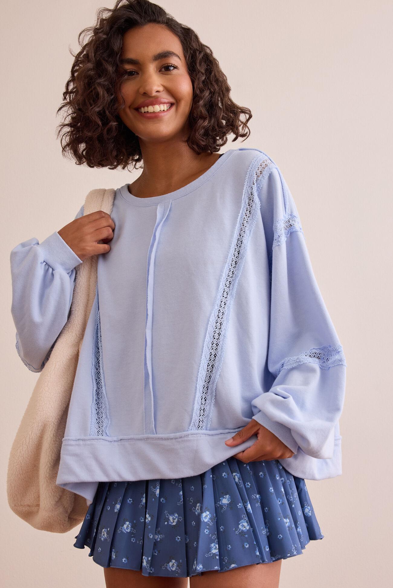 This crewneck elevates your look with beautiful lace piecing and intricate stitching that adds subtle texture. It's a versatile top, blending comfortable wear with refined, romantic details for a truly sophisticated touch.