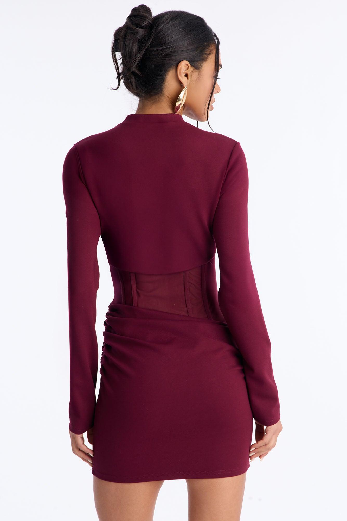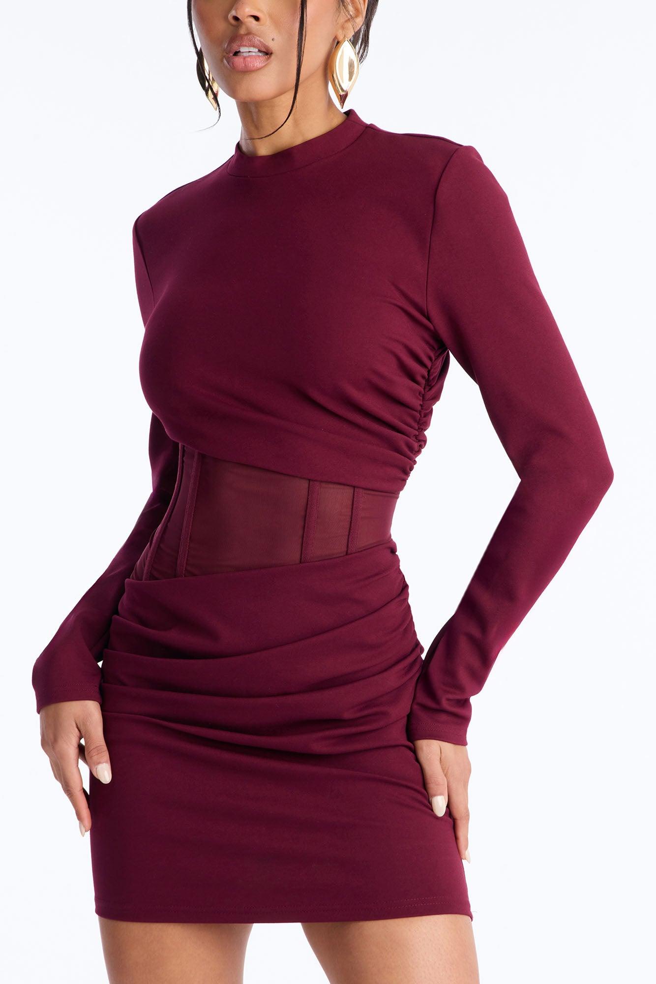 Bound Beauty Mesh Corset Long Sleeve Mini Dress - Wine Female