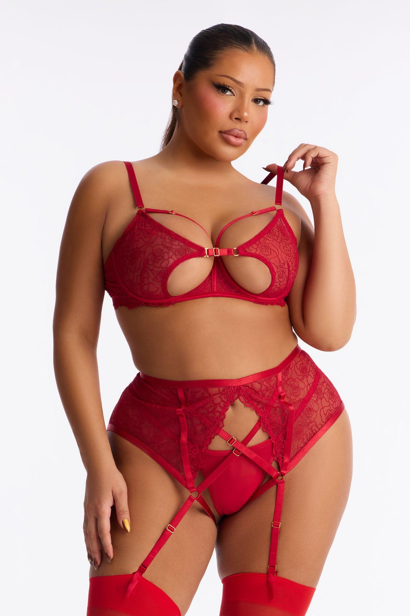 Available In Red. 3 Piece Bra Set Floral Embroidered Mesh Scalloped Lace Trim Adjustable Straps Unlined/Underwire Strappy Cut Outs Matching Garter Belt Attached Garter Straps G-String Panty Final Sale Embroidery : 100% Polyester Satin : 97% Polyester 3% Spandex Imported