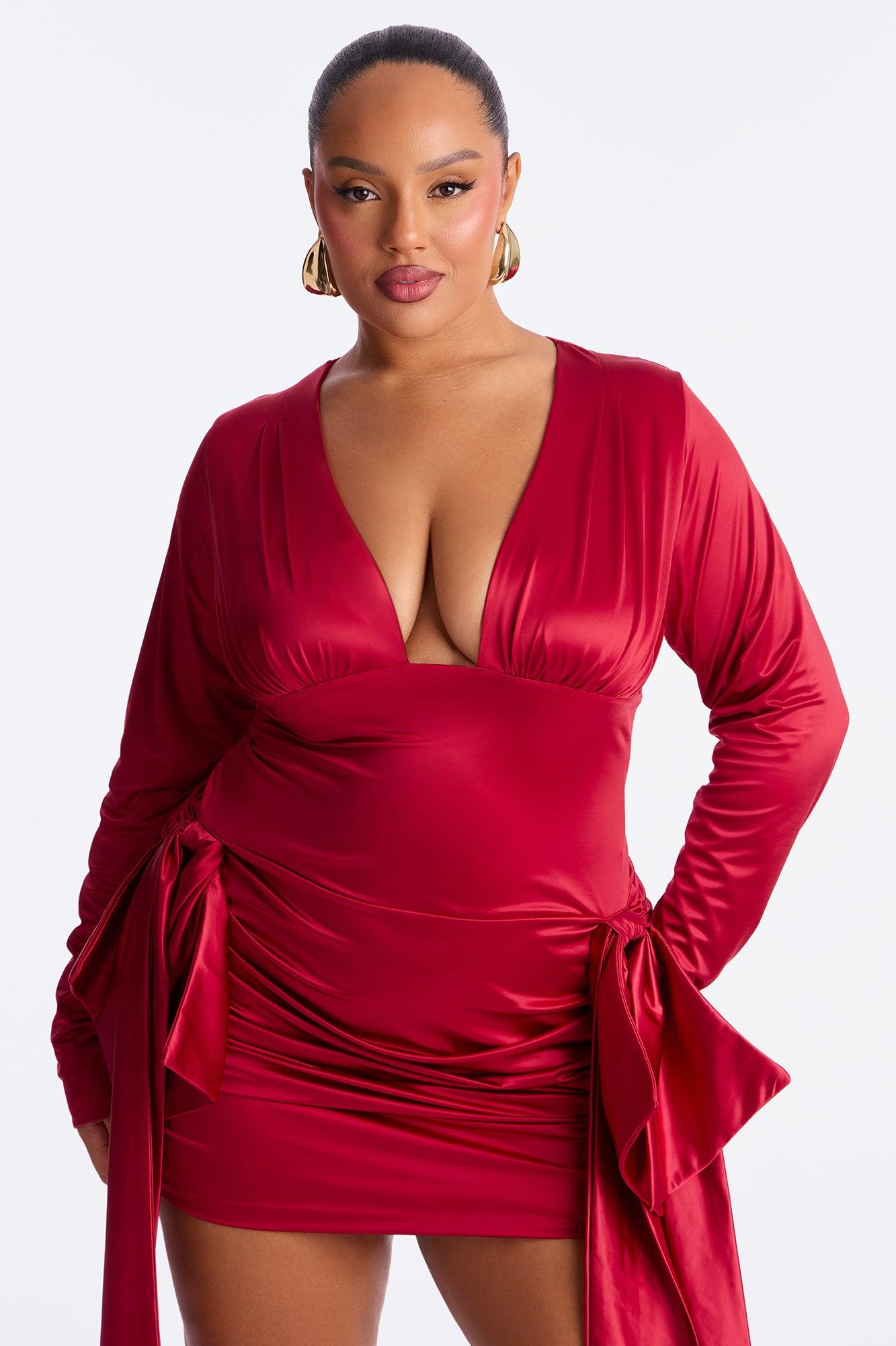 Available In Black/Pink And Red. Stretch Satin Mini Dress Deep V-Neckline Long Sleeve Ruched Bows Draped Side Zipper Lined Stretch Length Measured Flat = 31" Self : 82% Nylon 18% Spandex Lining : 85% Polyester 15% Spandex Contrast : 82% Nylon 18% Spandex Imported