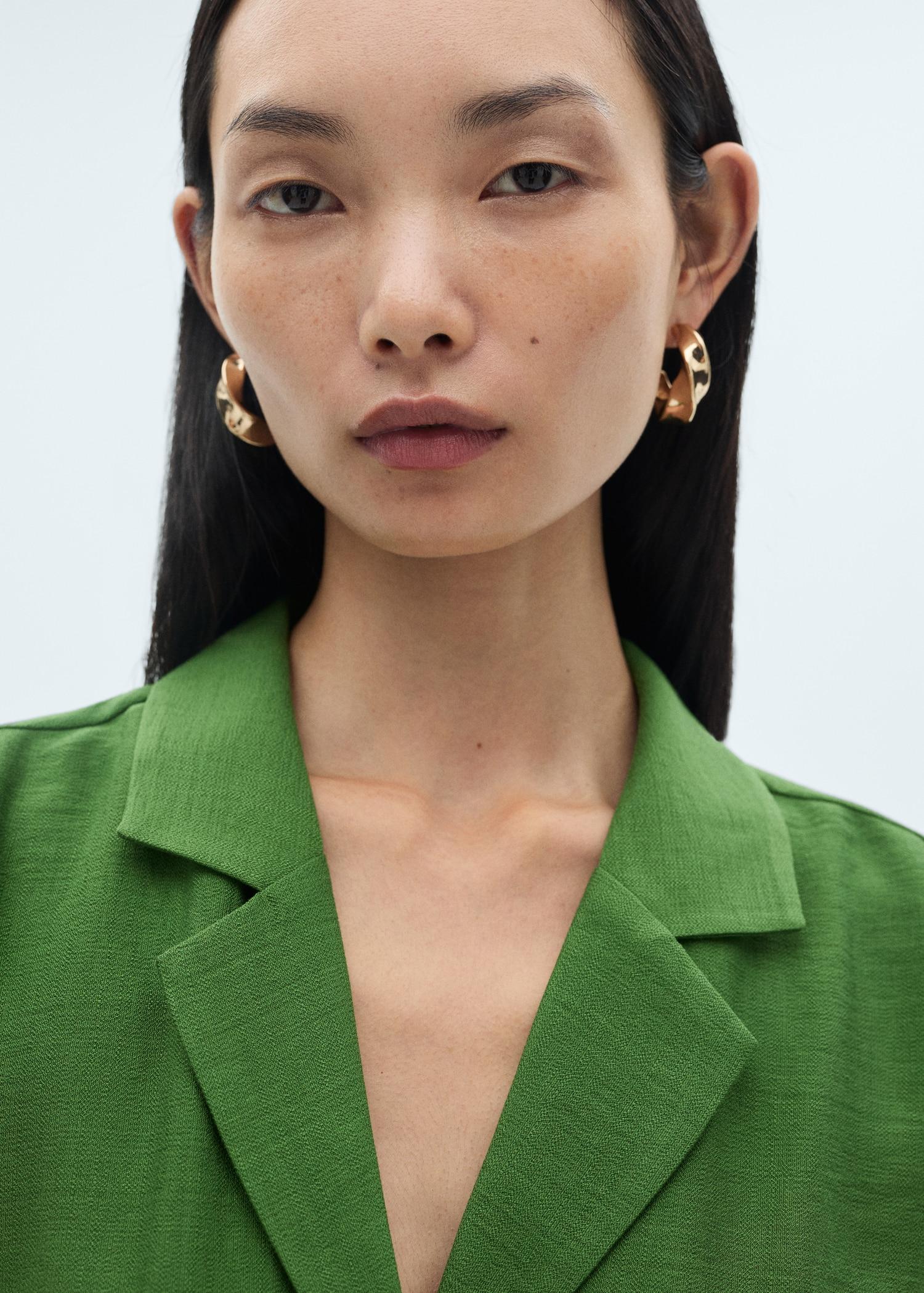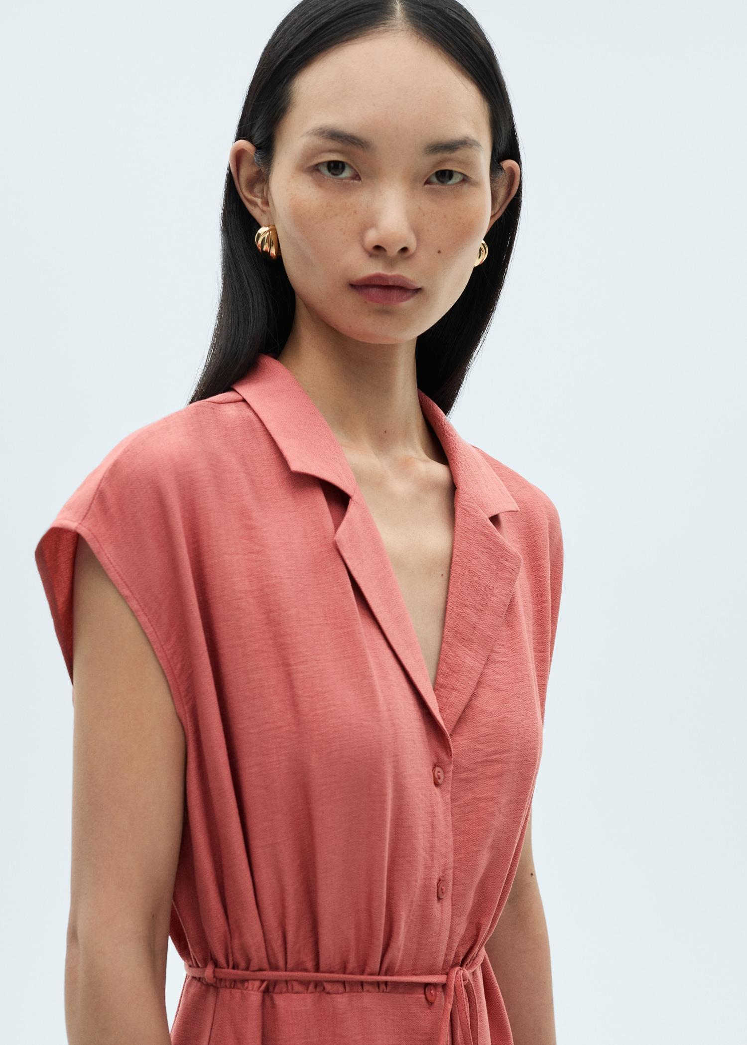Light fabric. Straight design. Midi design. Shirt-style collar. Lapel with notch. Short sleeve. Button fastening on the front section. Ribbon with bow. Without inner lining. Side length 34.45 in. Back length 45.67 in