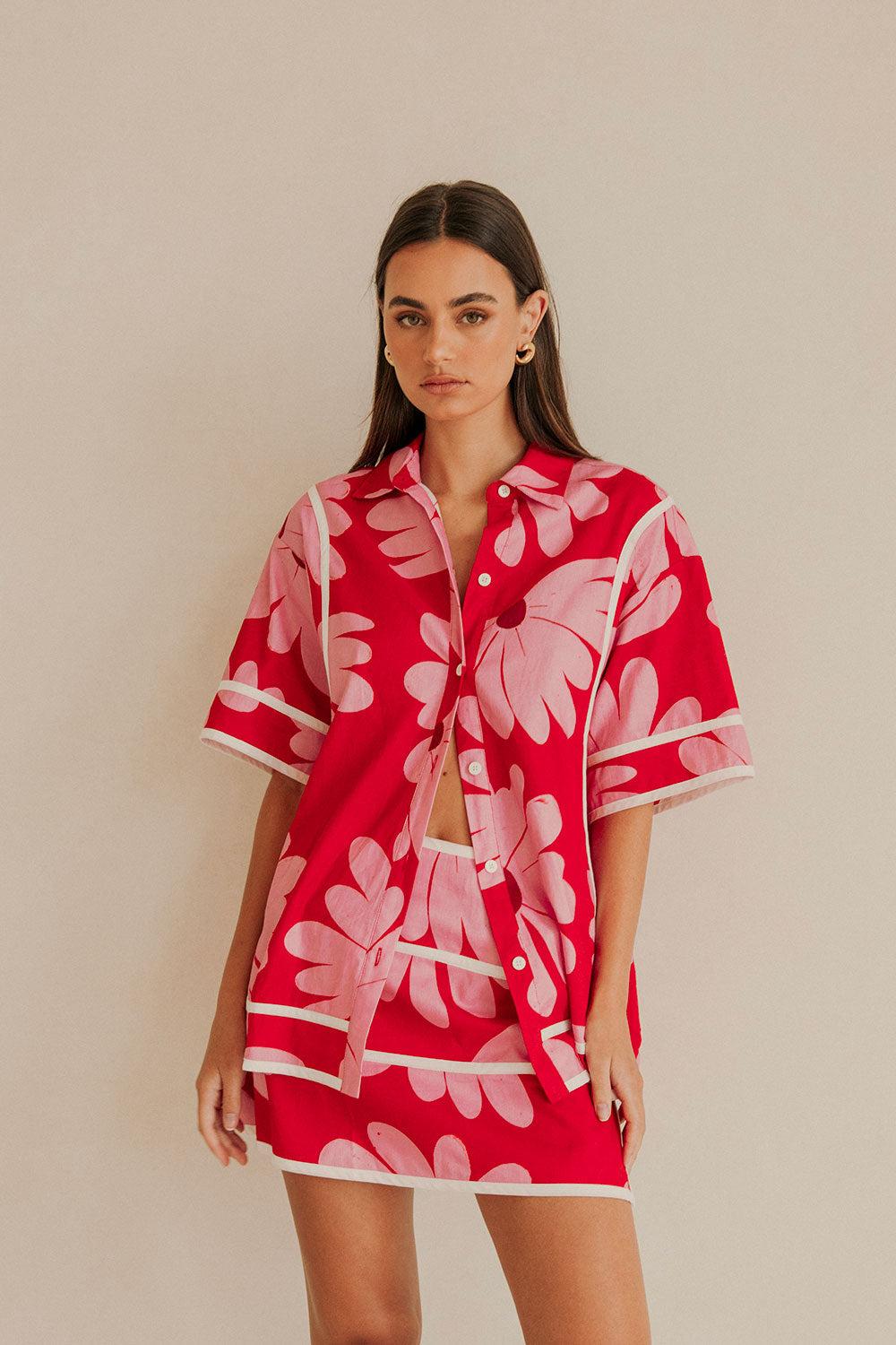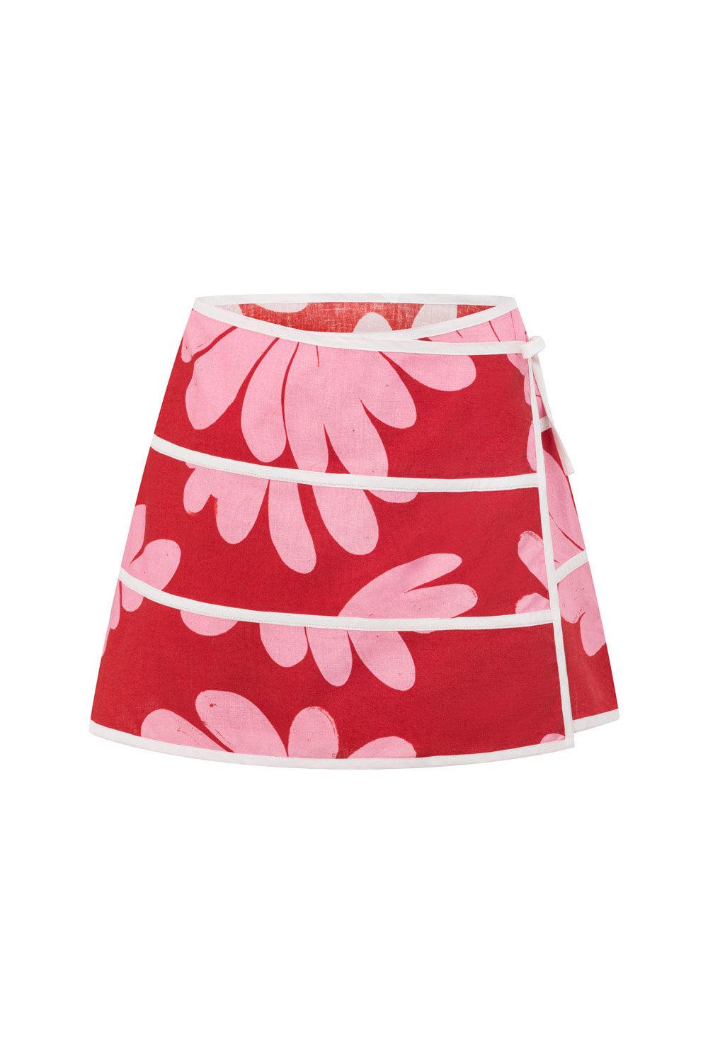 A must-have summer set! The Bowie Skirt is made from a high quality linen cotton blend fabric with our exclusive Daisy Red print. It is a high waisted wrap style featuring a tie closure at side with white bind trim details. Get the look with the Bowie Top! Designed exclusively by Sabo.