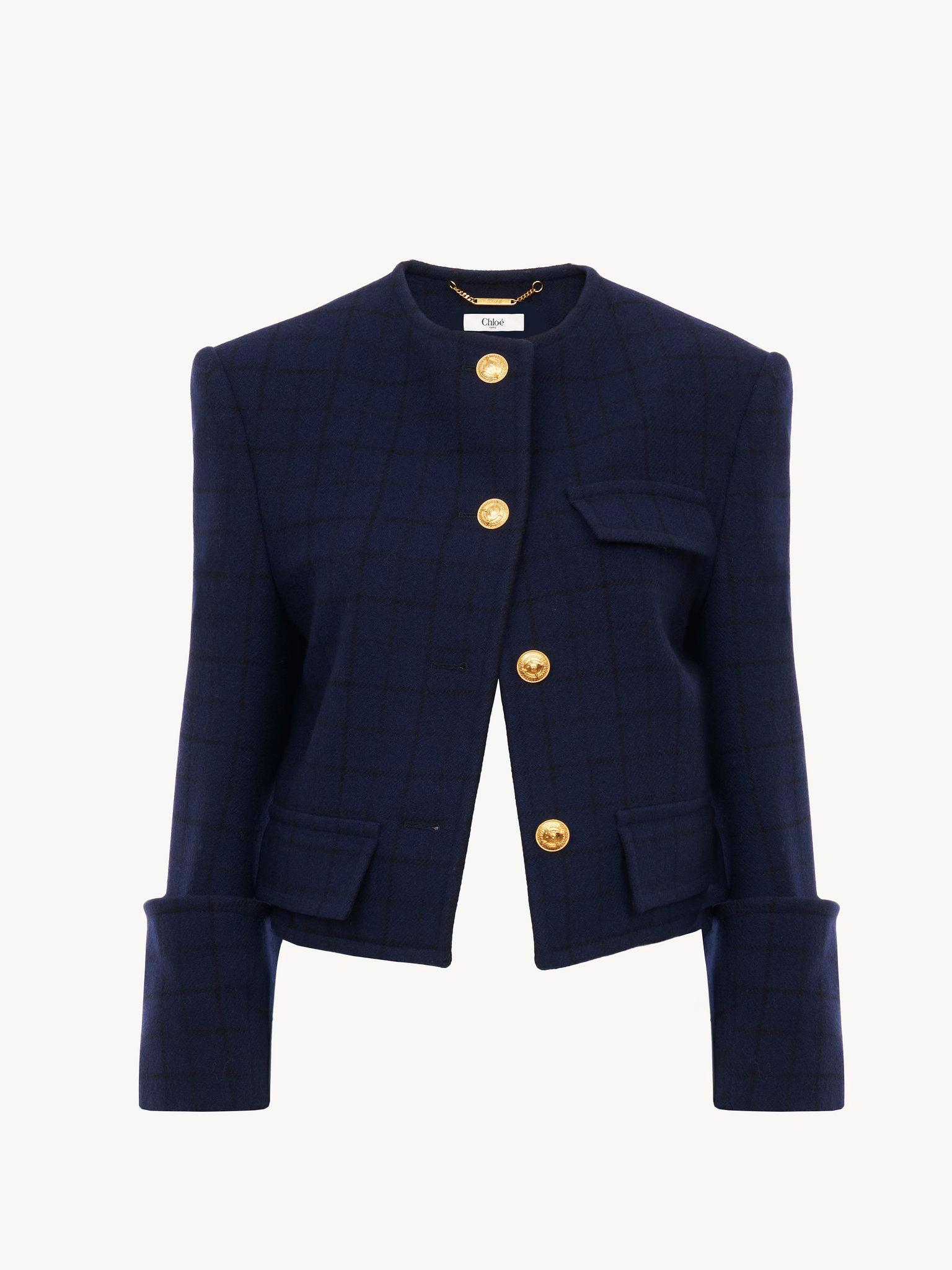 Boxy collarless jacket in wool check