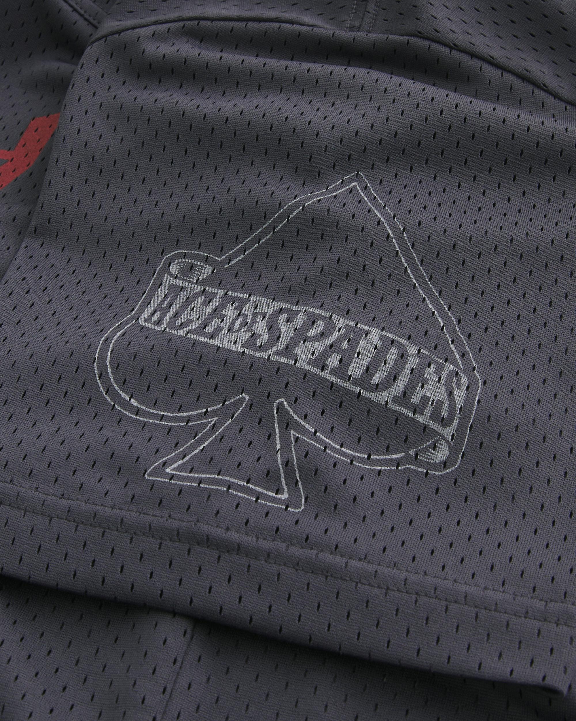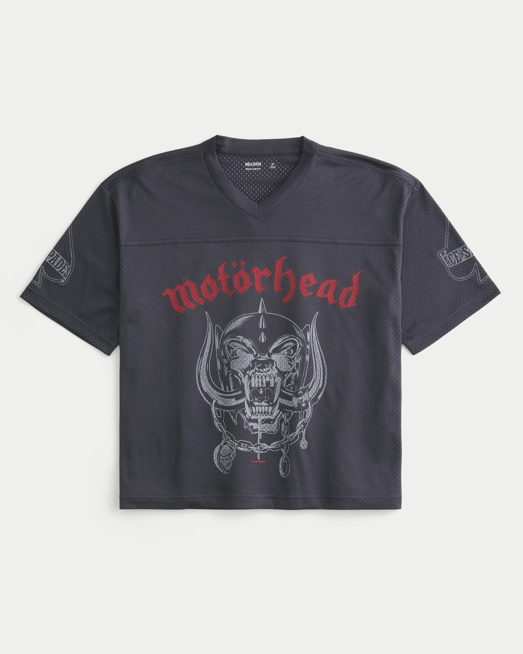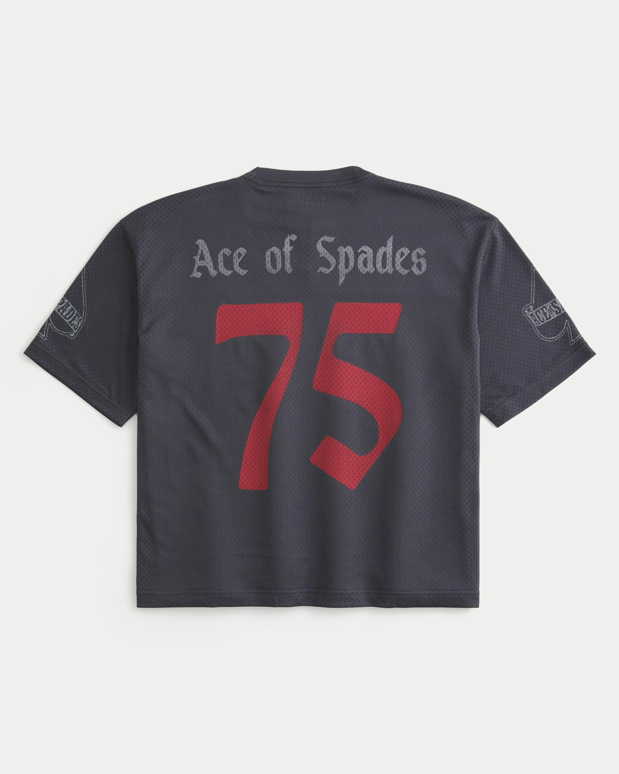A classic jersey in soft mesh fabric, featuring official licensed Motörhead Ace of Spades print graphics at the front and back. Short sleeves, v-neckline. Boxy Crop Fit.