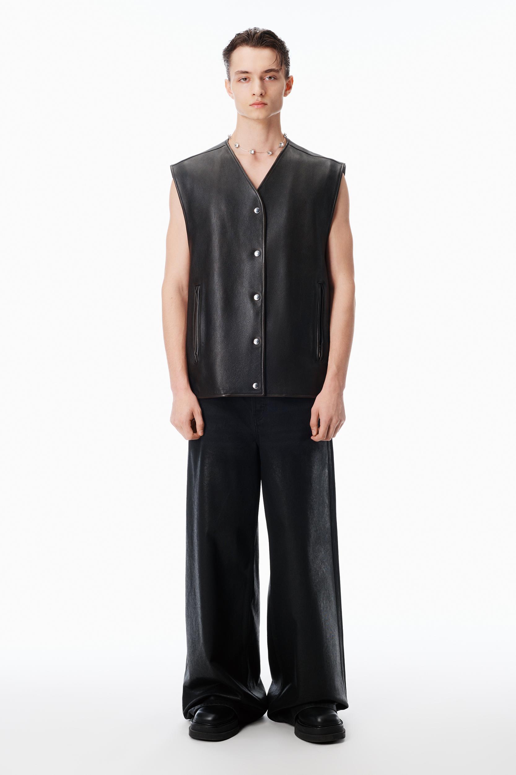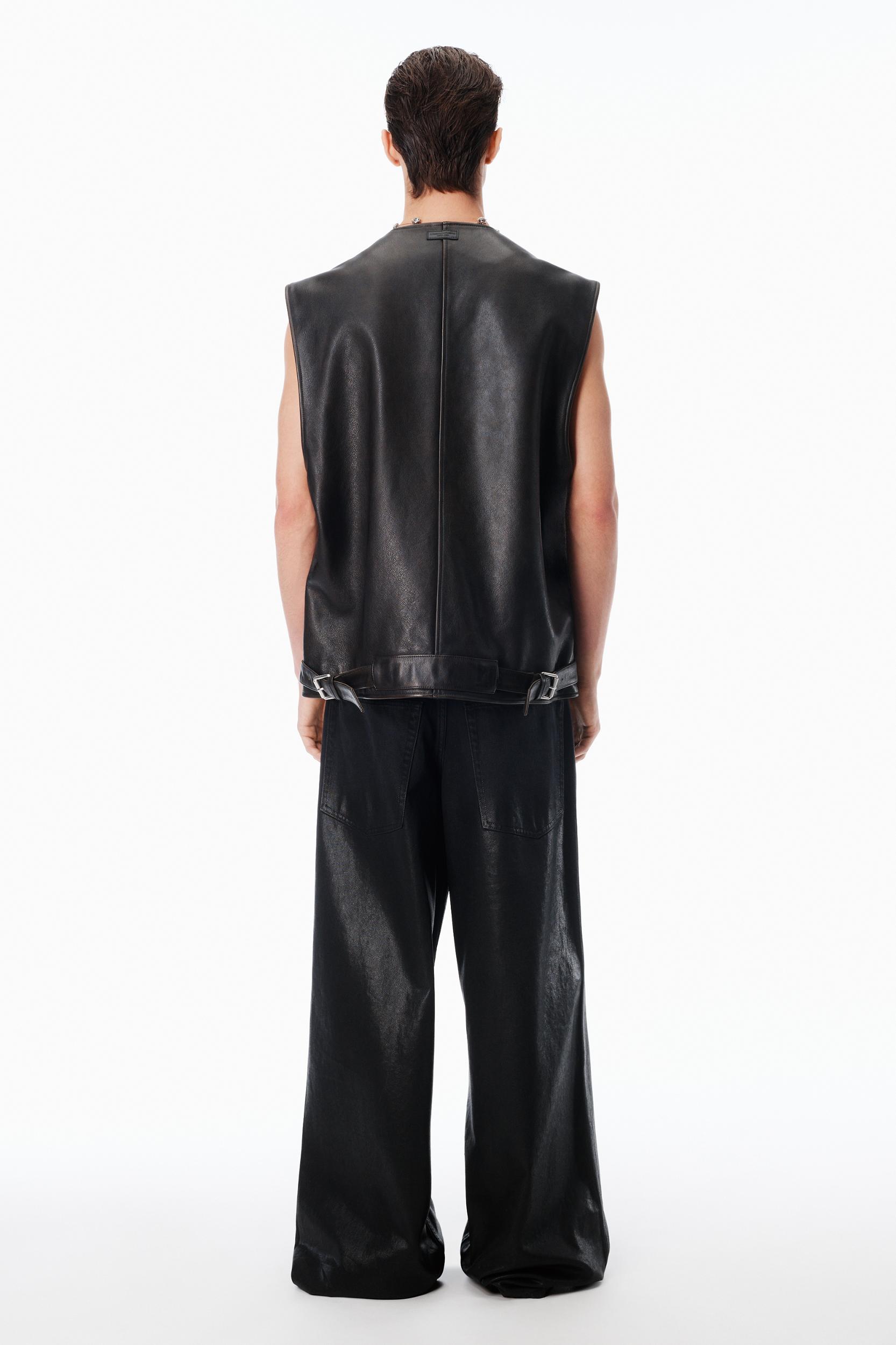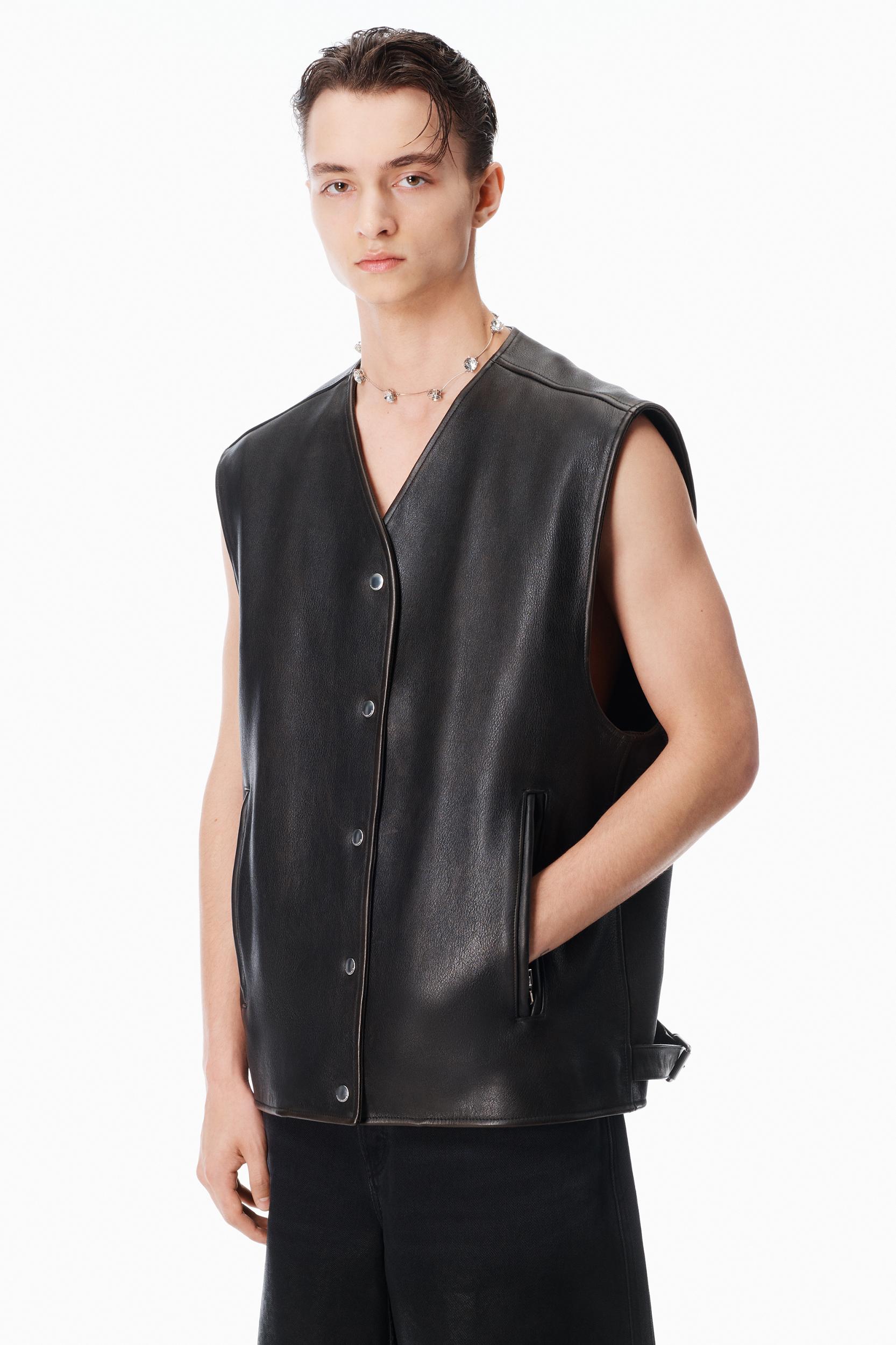 Black rustic cow leather cut into an oversized moto vest. Detailed with a V-shaped neckline, snap front closure, zip welt pockets, and an adjustable double-buckle back hem, finished with a self logo patch at the back neck.