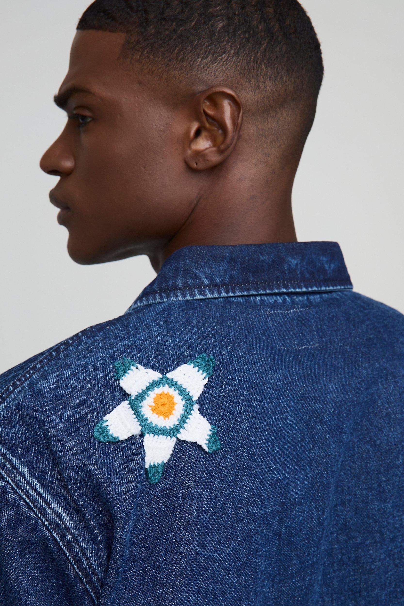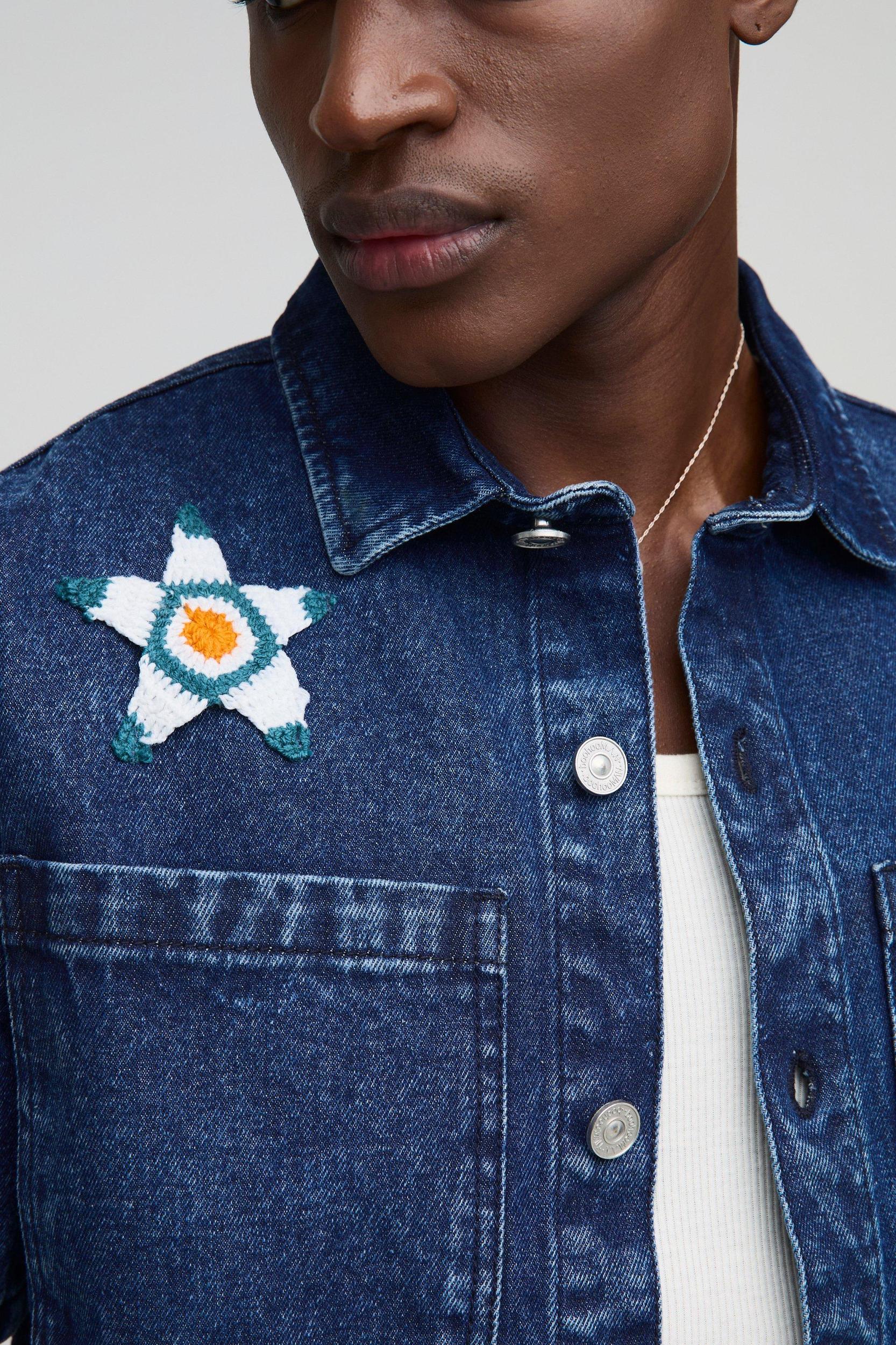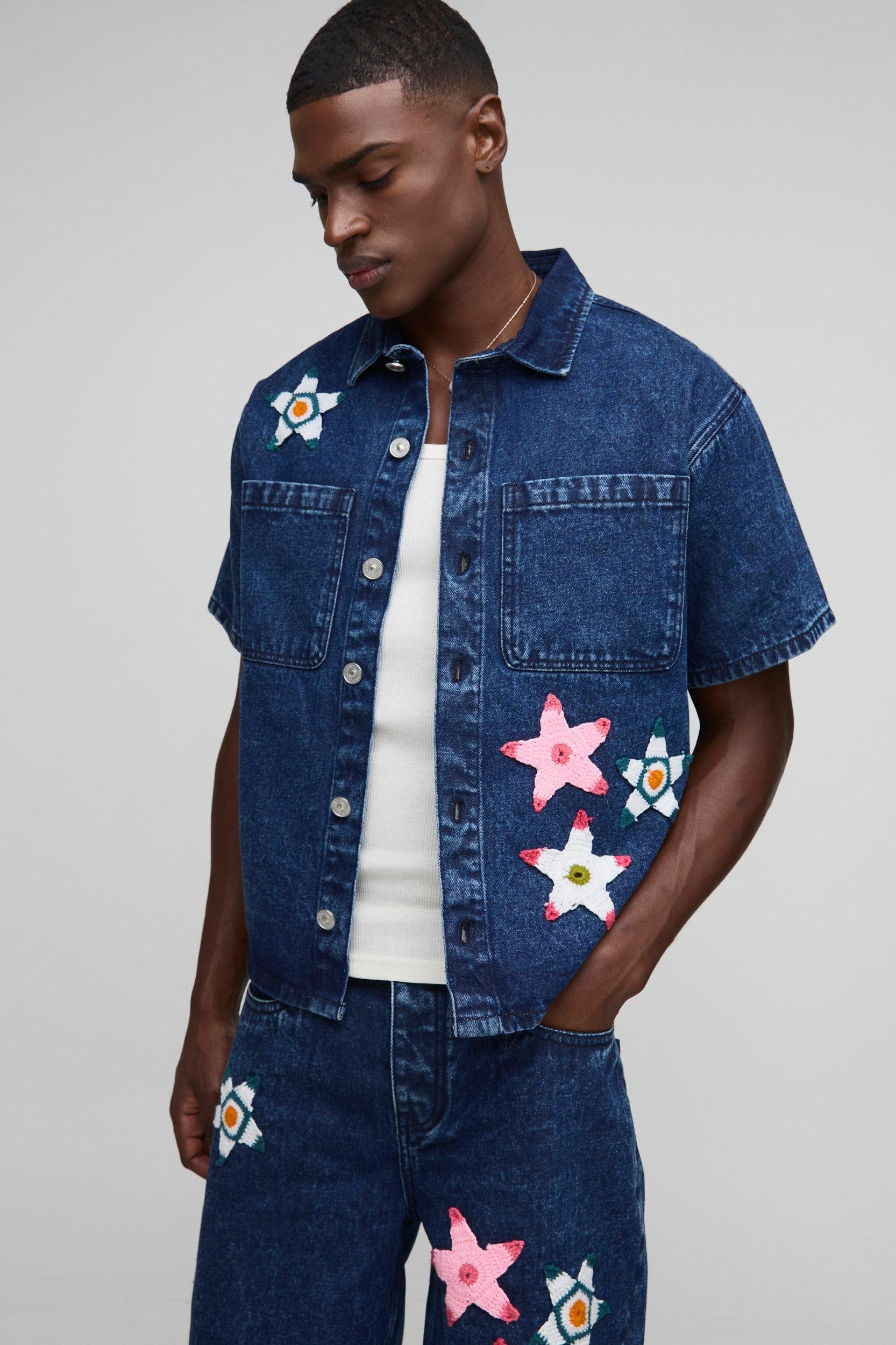 Boxy Revere Star Crochet Applique Denim Shirt | boohooMAN USA