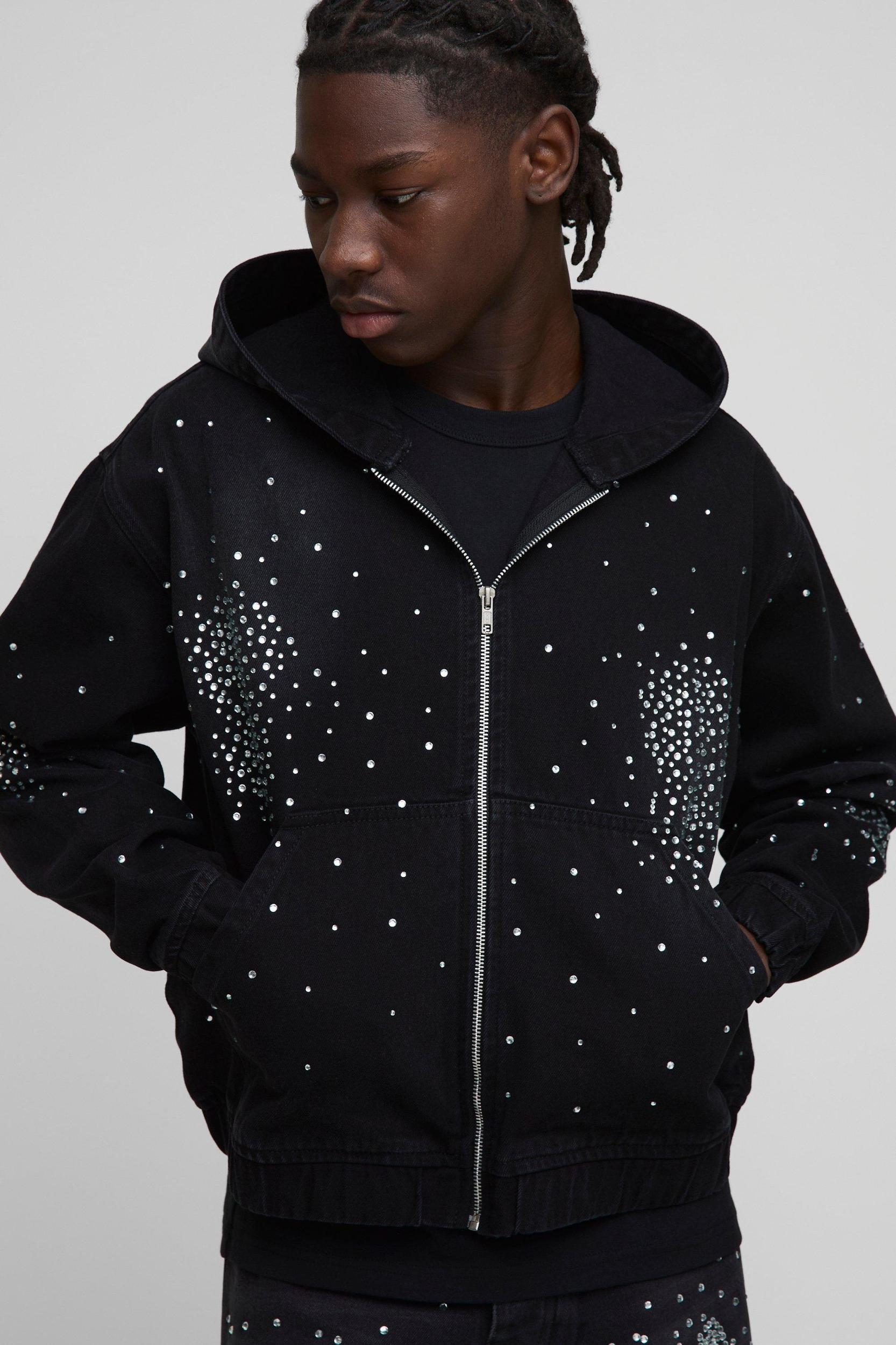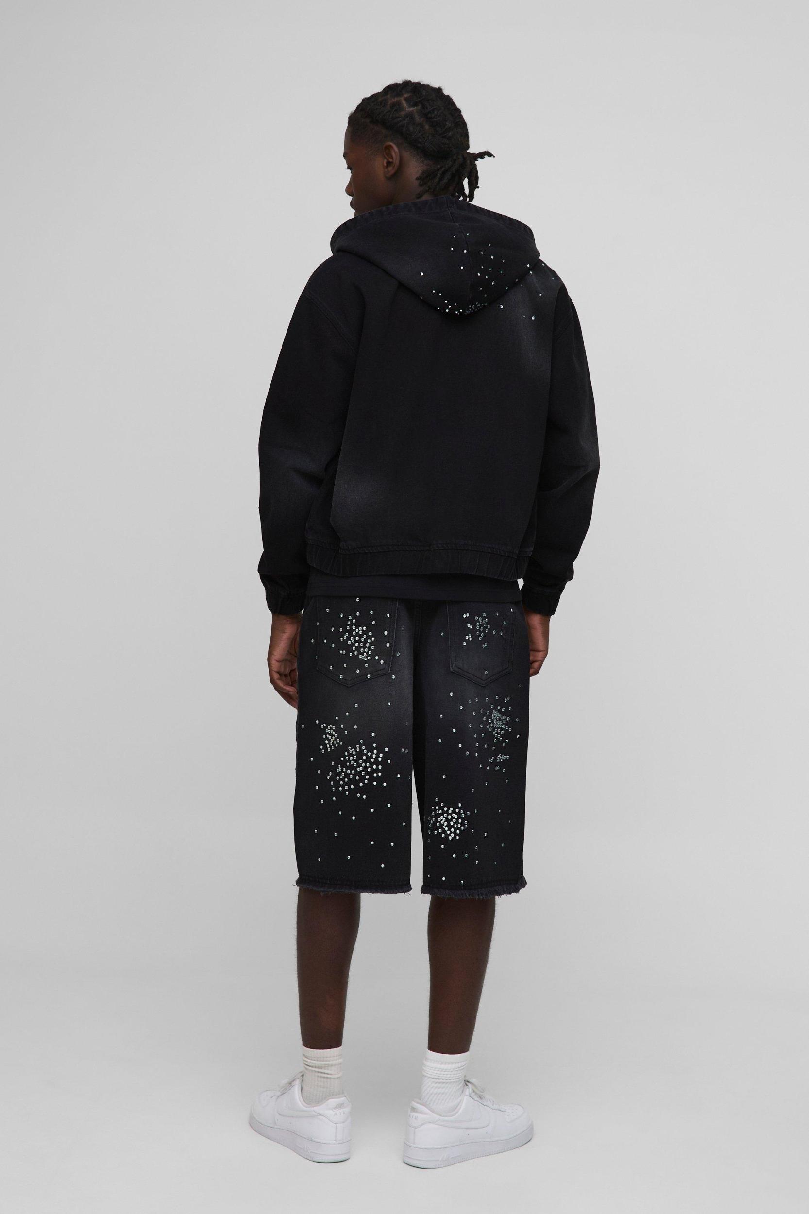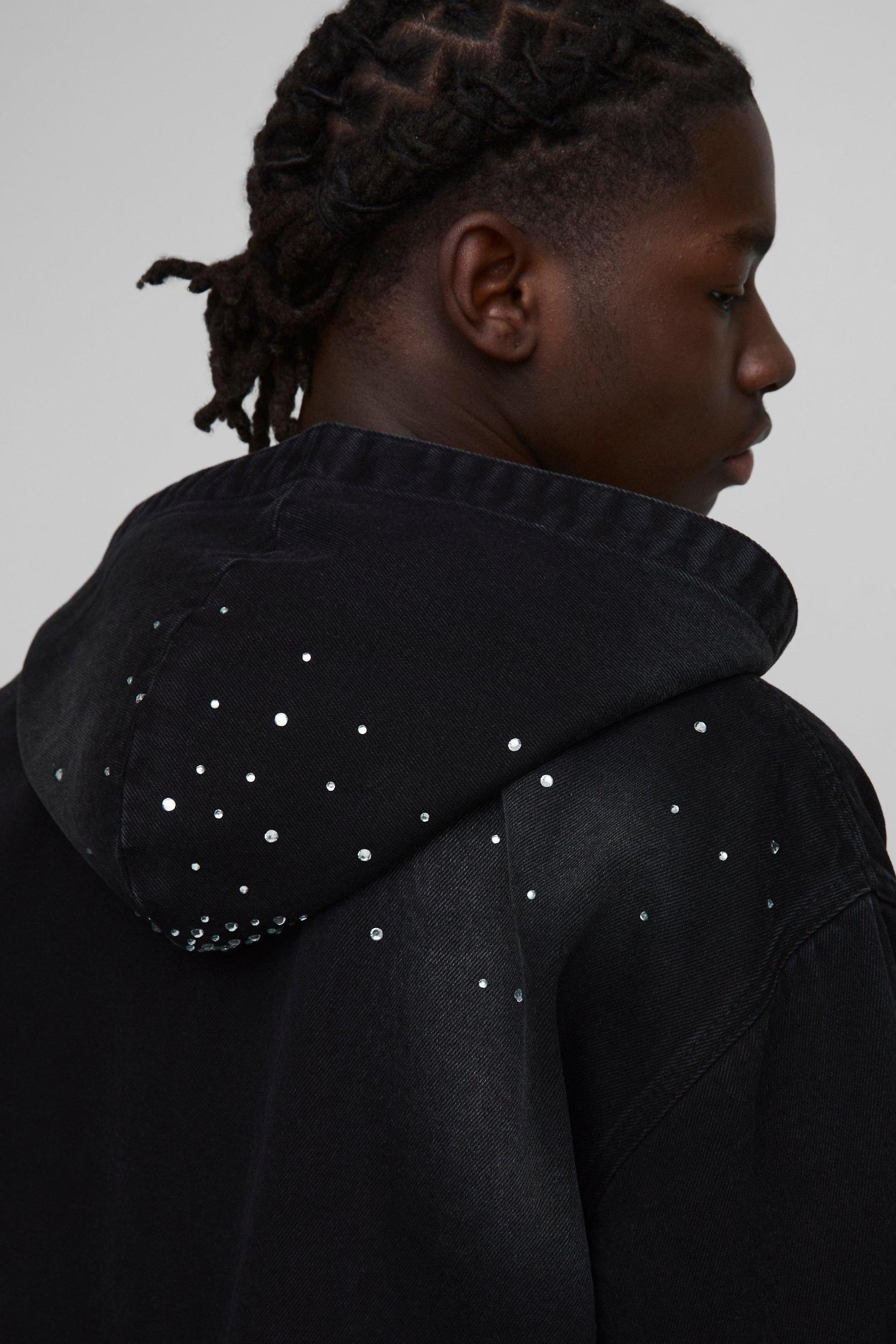 Boxy Rhinestone Washed Black Denim Hoodie | boohooMAN USA