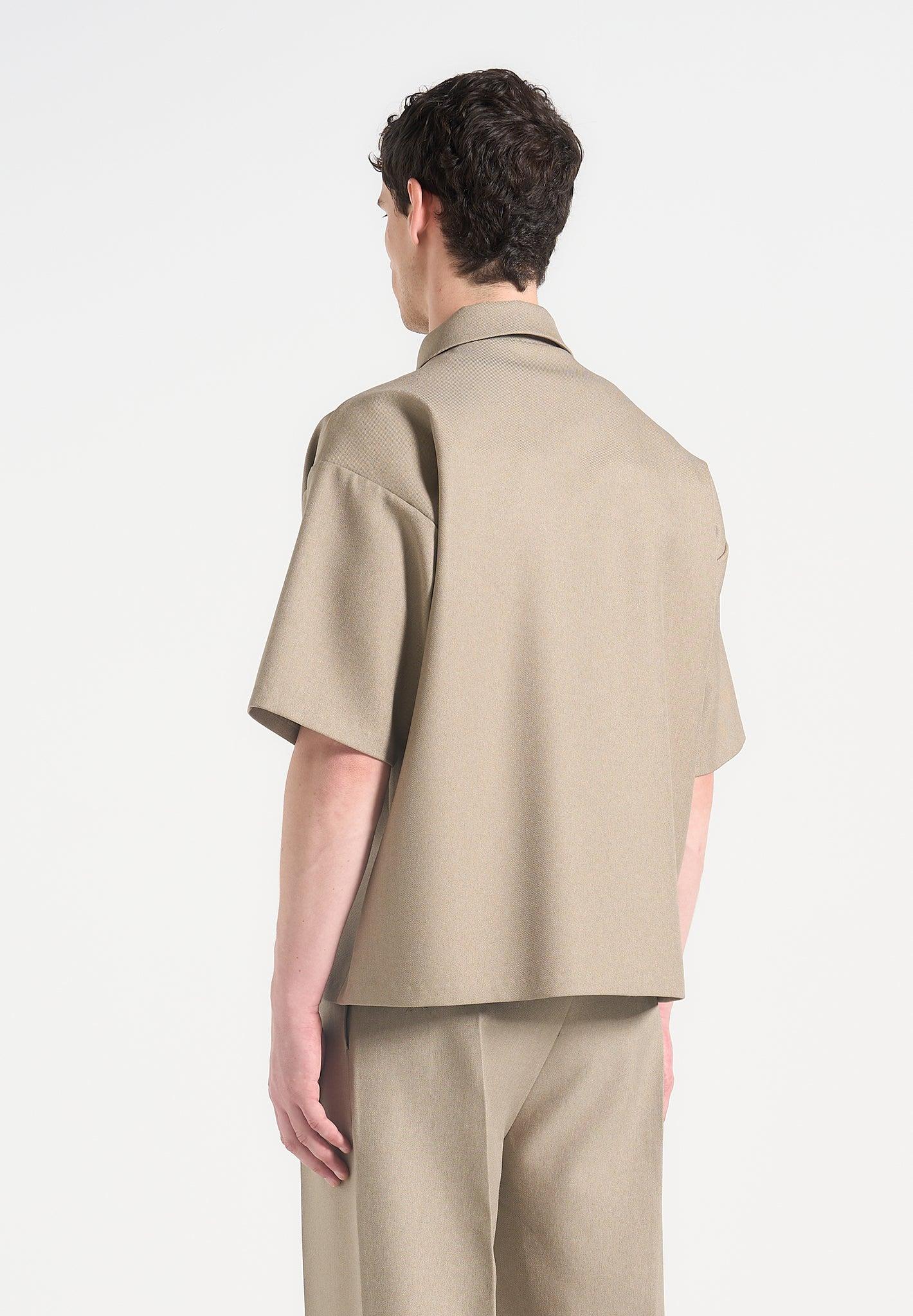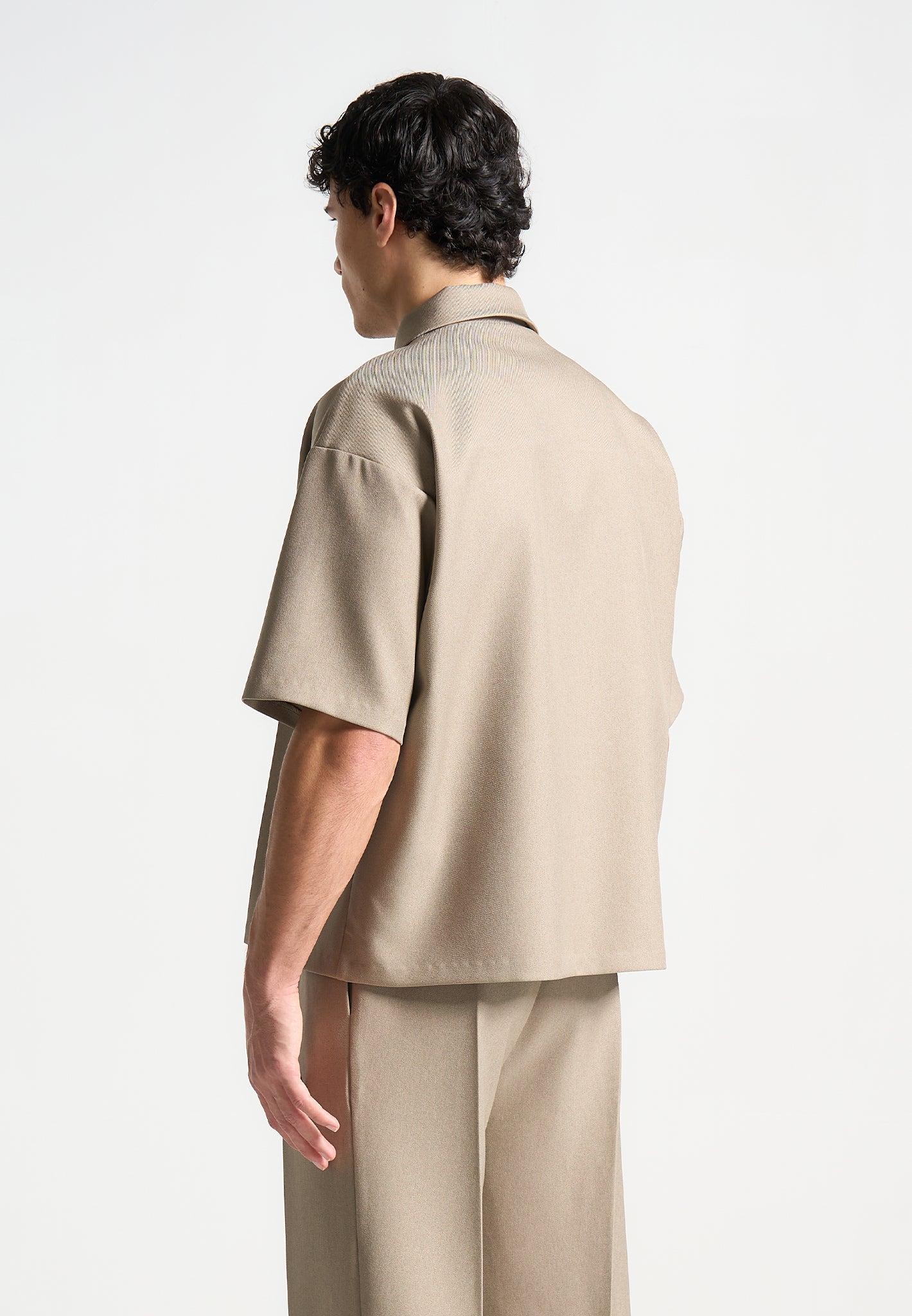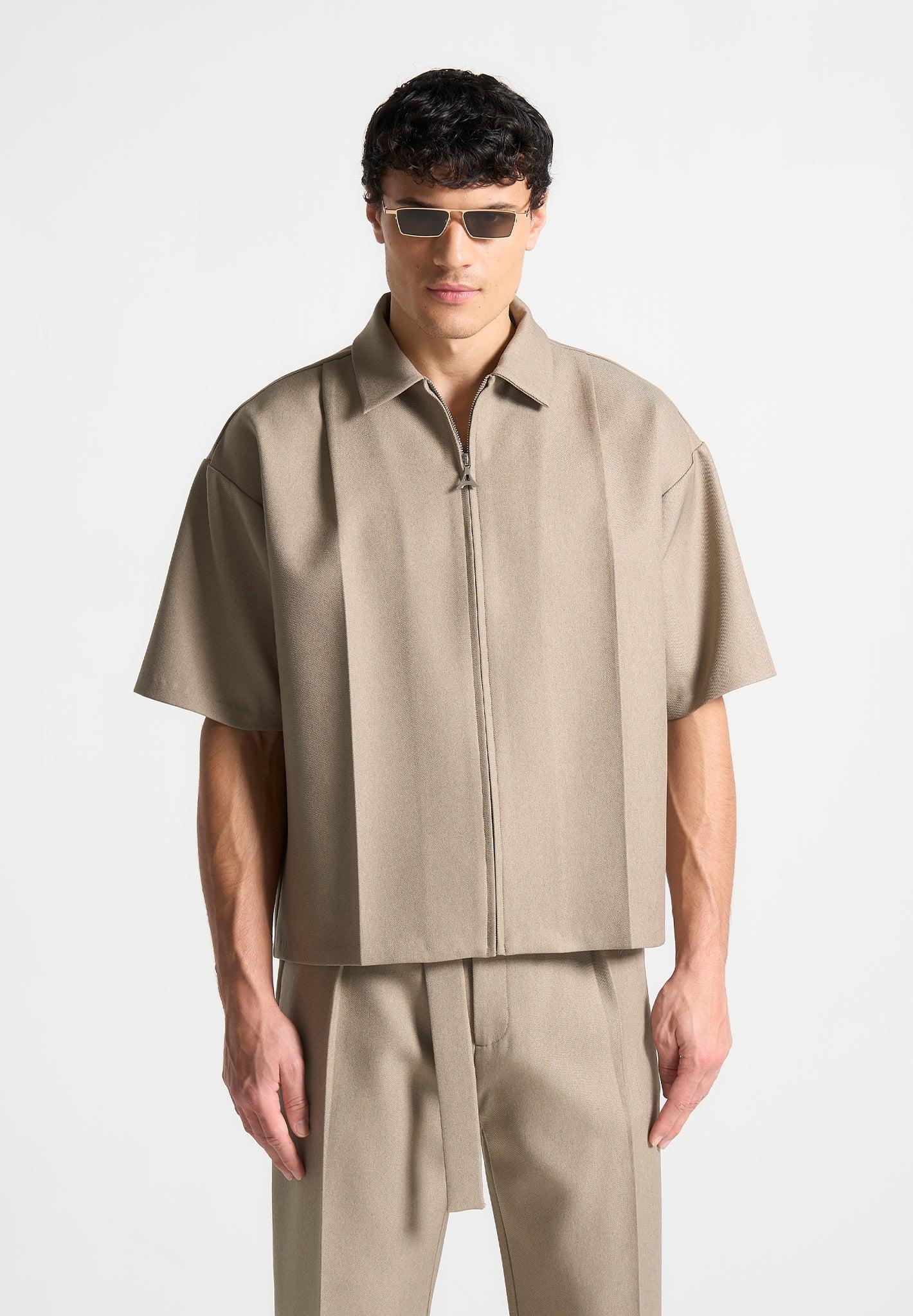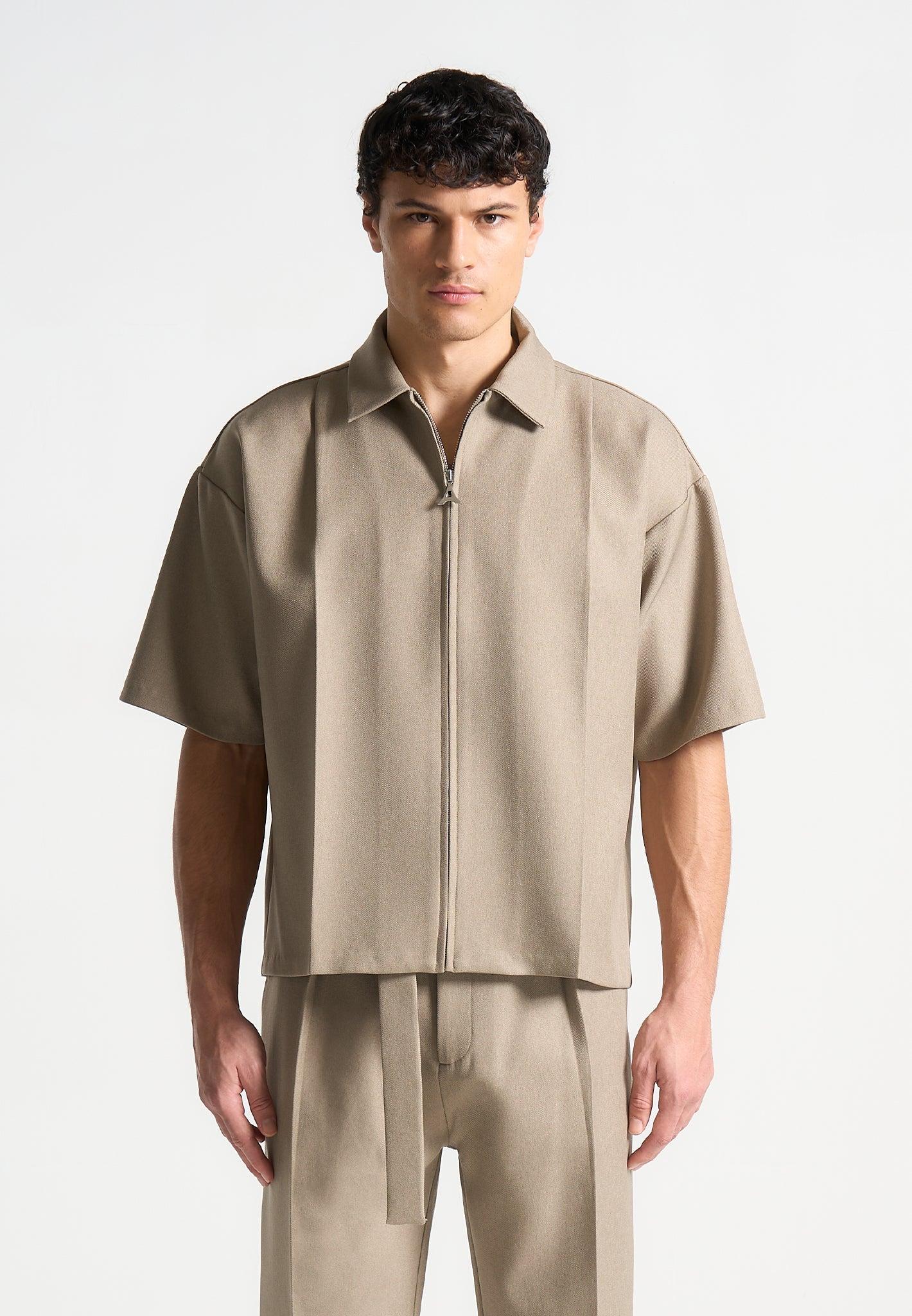 This Boxy Shirt is a versatile addition to any wardrobe. The concealed frontal zip provides a sleek and modern look, while the crease detail adds a refined touch. The neutral tone and classic collar make it easy to dress up or down, perfect for any occasion. Fabric: Always check the care label for wash instructions. Model is 6'0", 40" Chest, 30" Waist and Wears Size Medium Based On Size M - Front Length cm/in, Chest cm/in, Sleeve Length cm/in Stretch Factor - /3