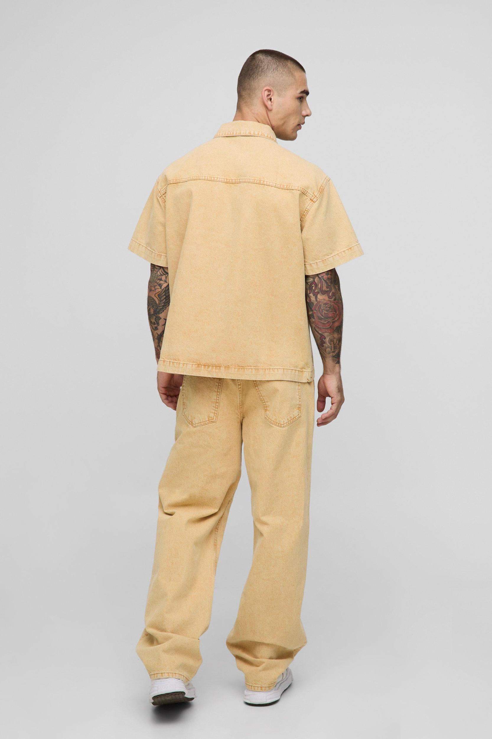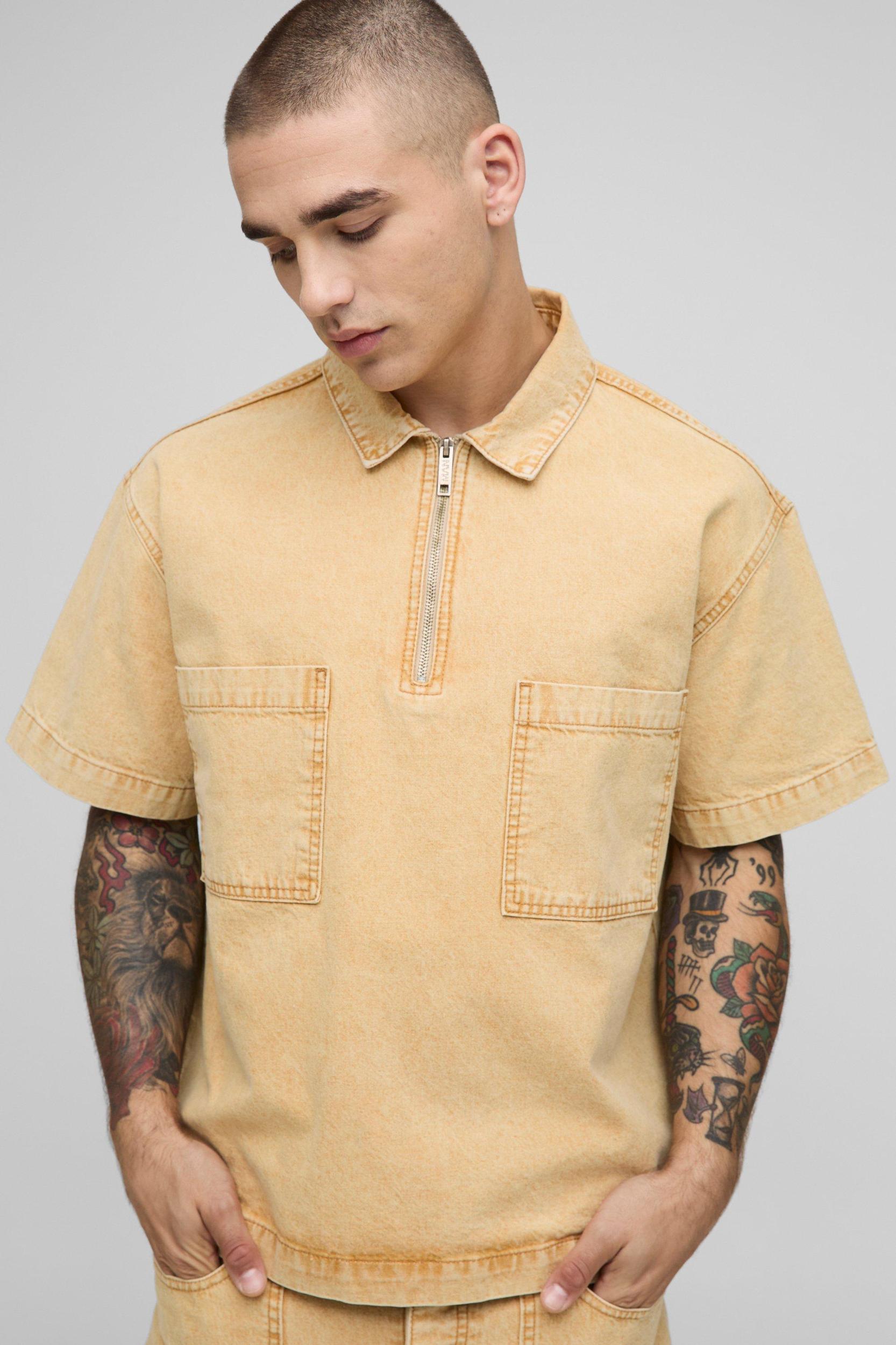 Boxy Short Sleeve 1/4 Zip Tinted Denim Shirt | boohooMAN USA
