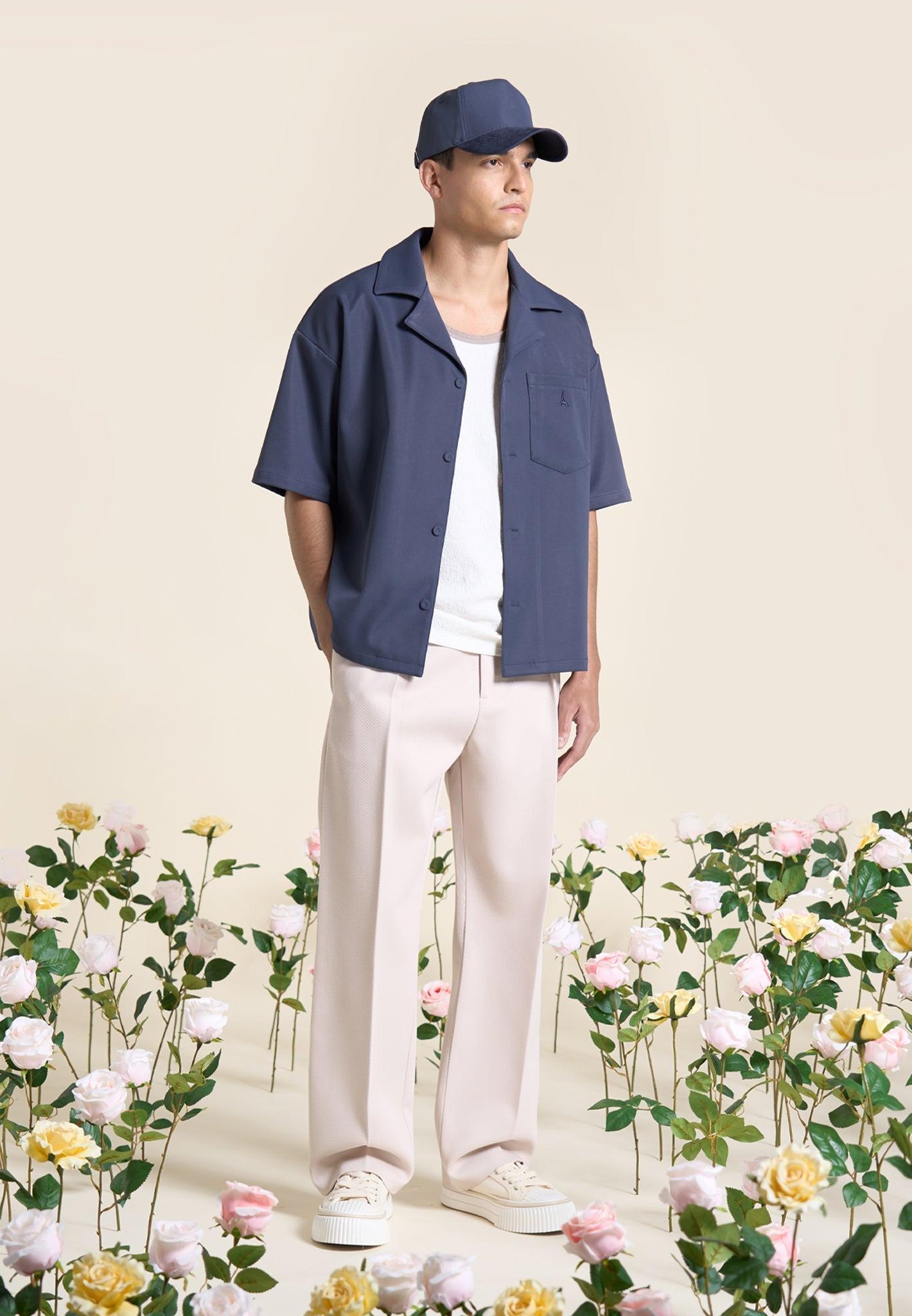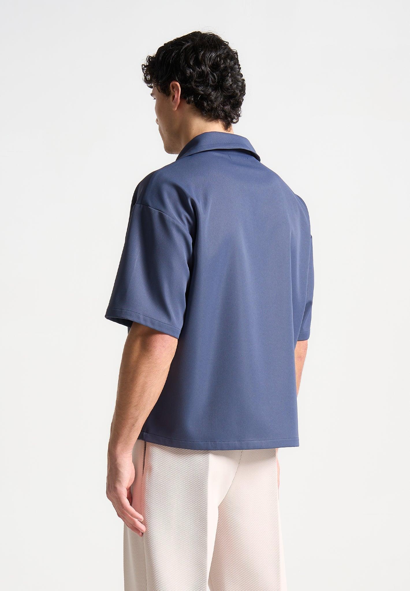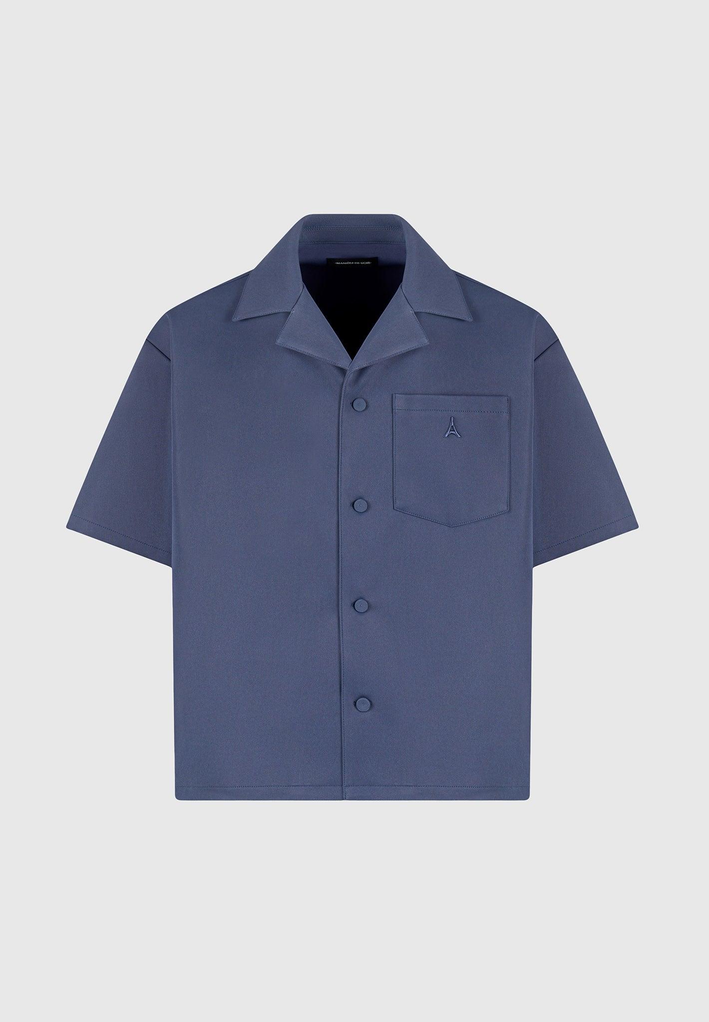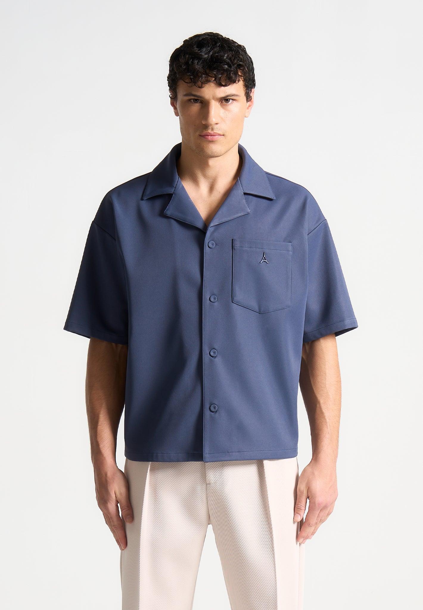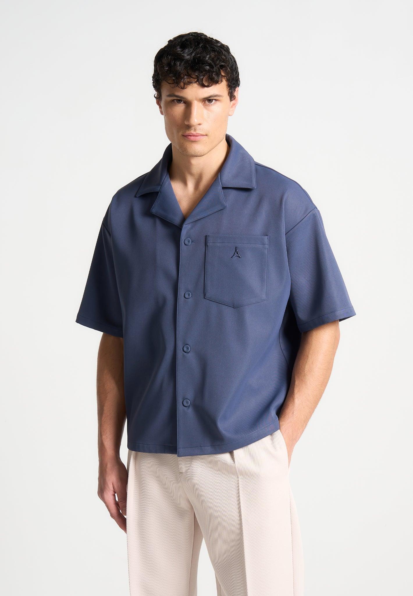 Elevate your wardrobe with our Boxy Twill Revere Shirt in Steel Blue, meticulously tailored with a boxy fit to suit any body type. The tonal embroidery on the front pocket adds a refined touch, complemented by the tonal fabric covered buttons and revere collar to complete the ensemble. Fabric: Always check the care label for wash instructions. Model is 6'0", 40" Chest, 30" Waist and Wears Size Medium Based On Size M - Front Length cm/in, Chest cm/in, Sleeve Length cm/in Stretch Factor - /3