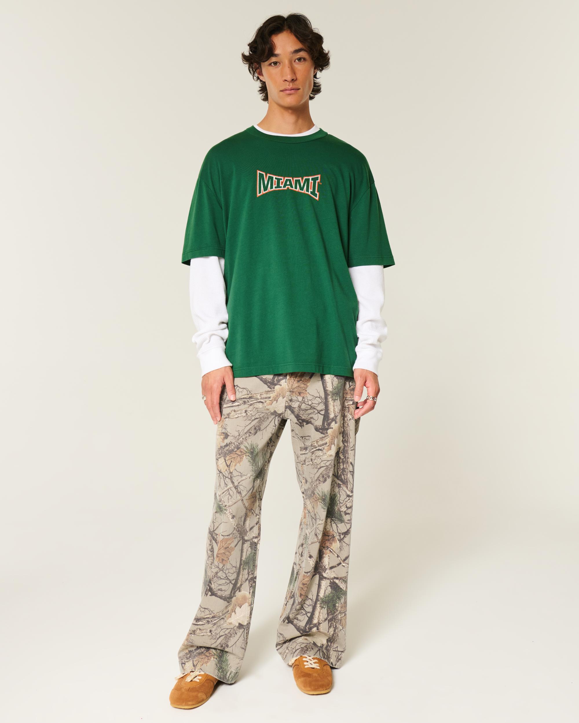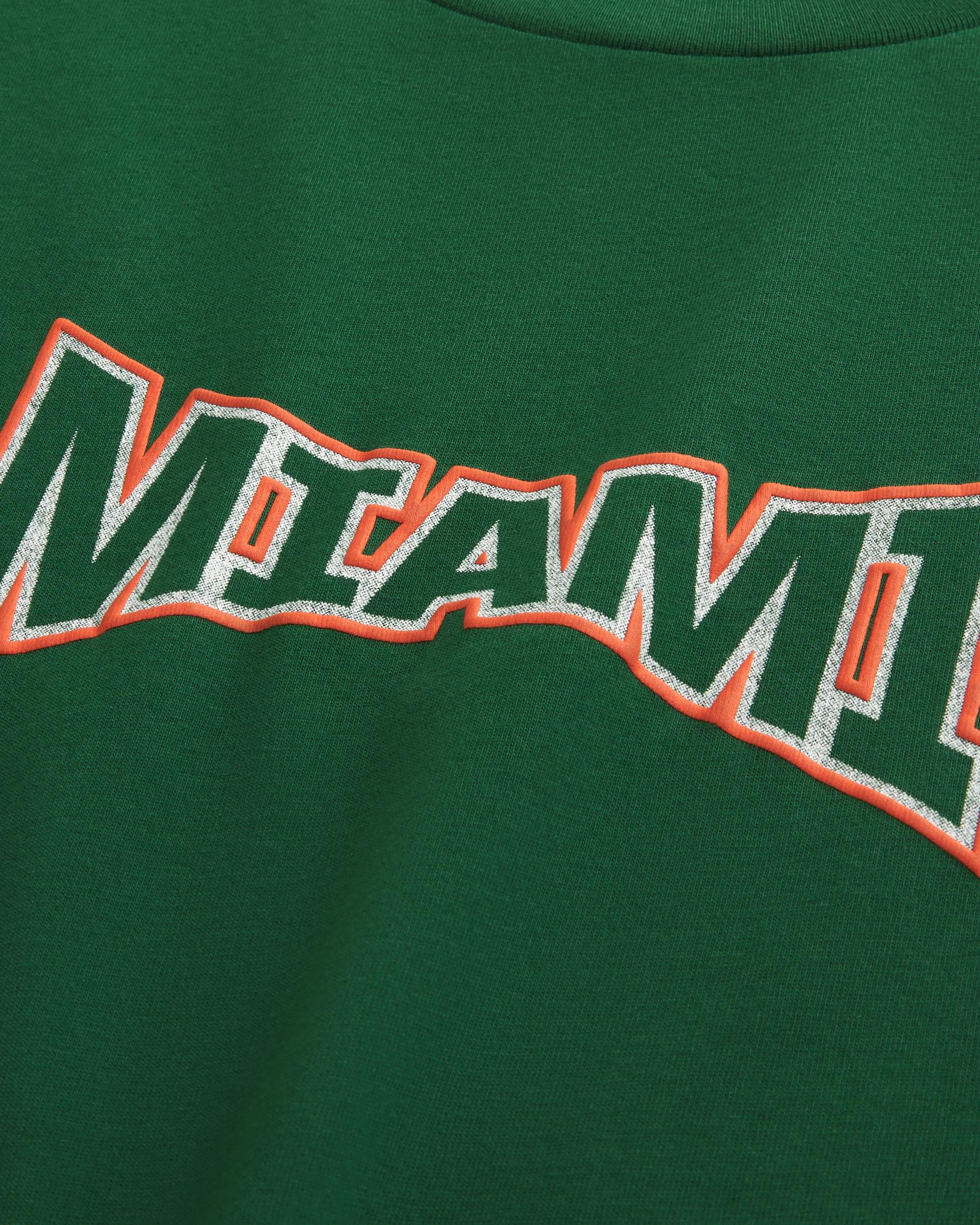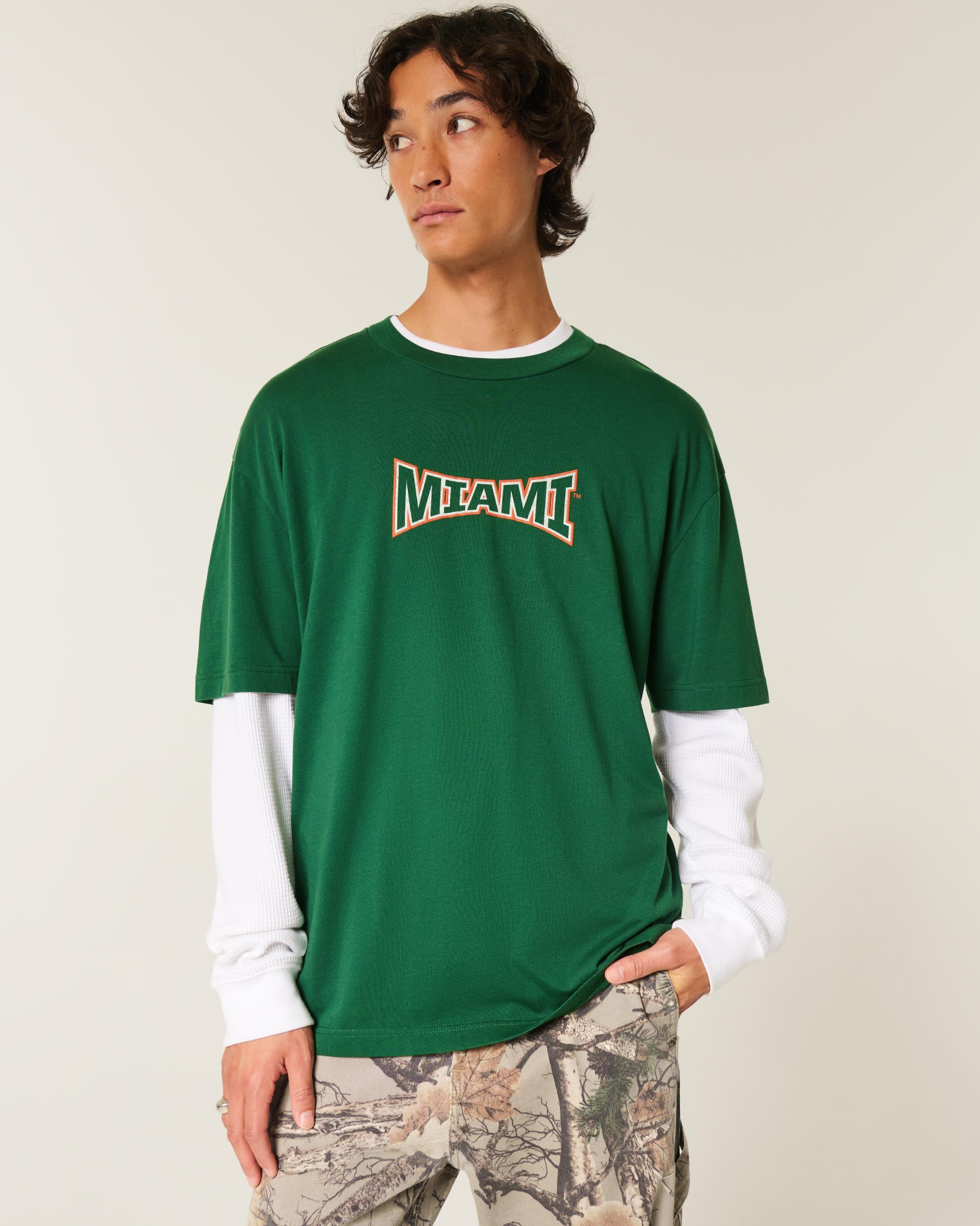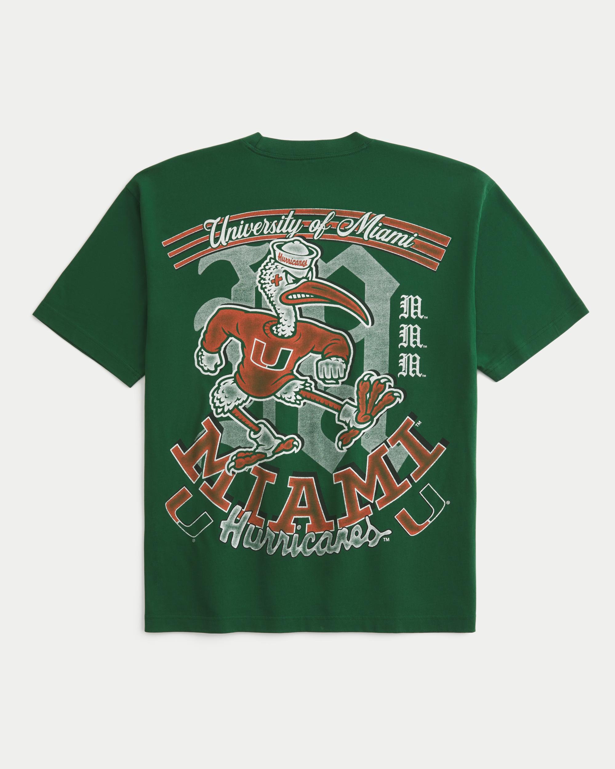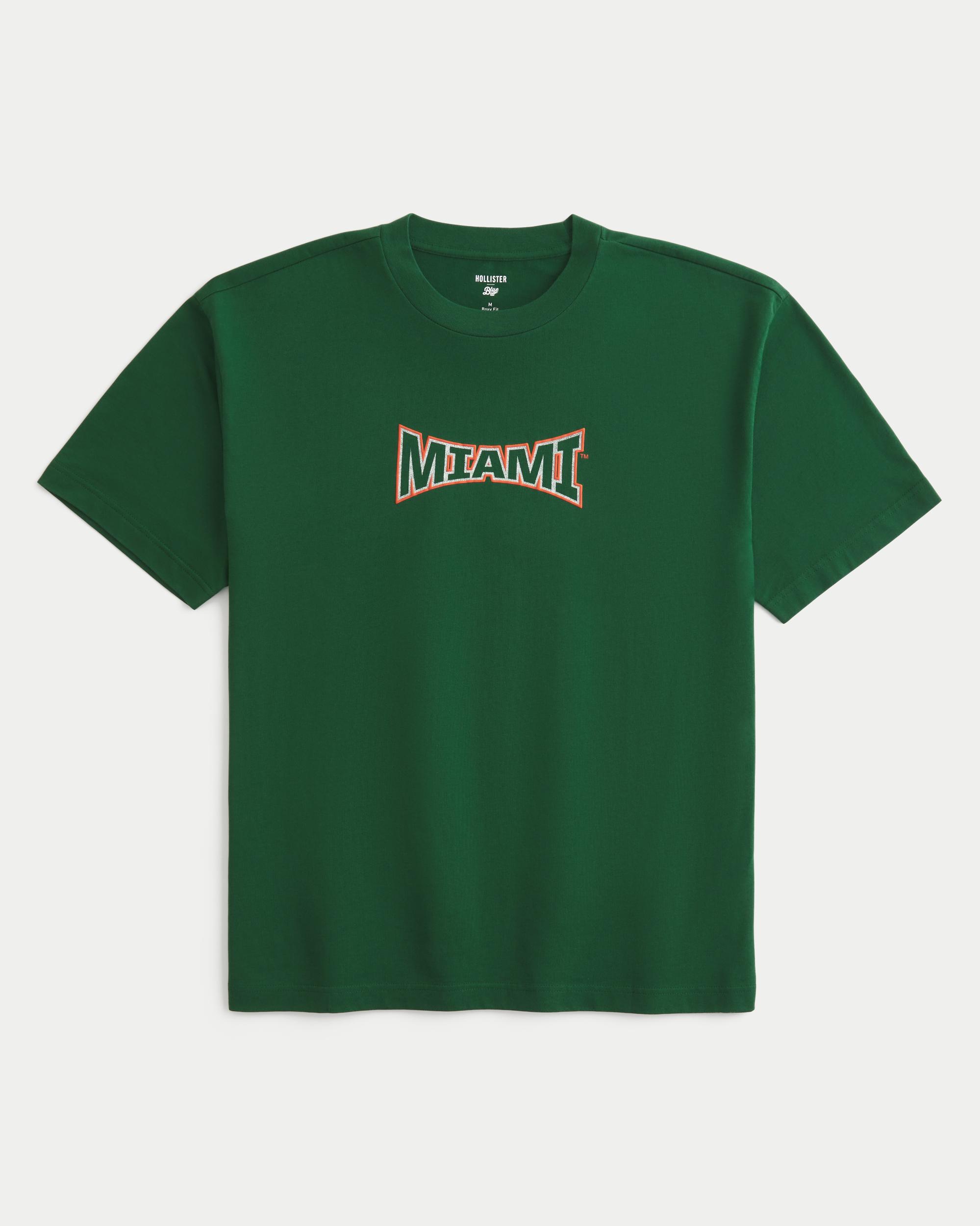 A super soft tee featuring official licensed University of Miami print graphics at the front and back. Crew neckline, short sleeves. Boxy Fit.
