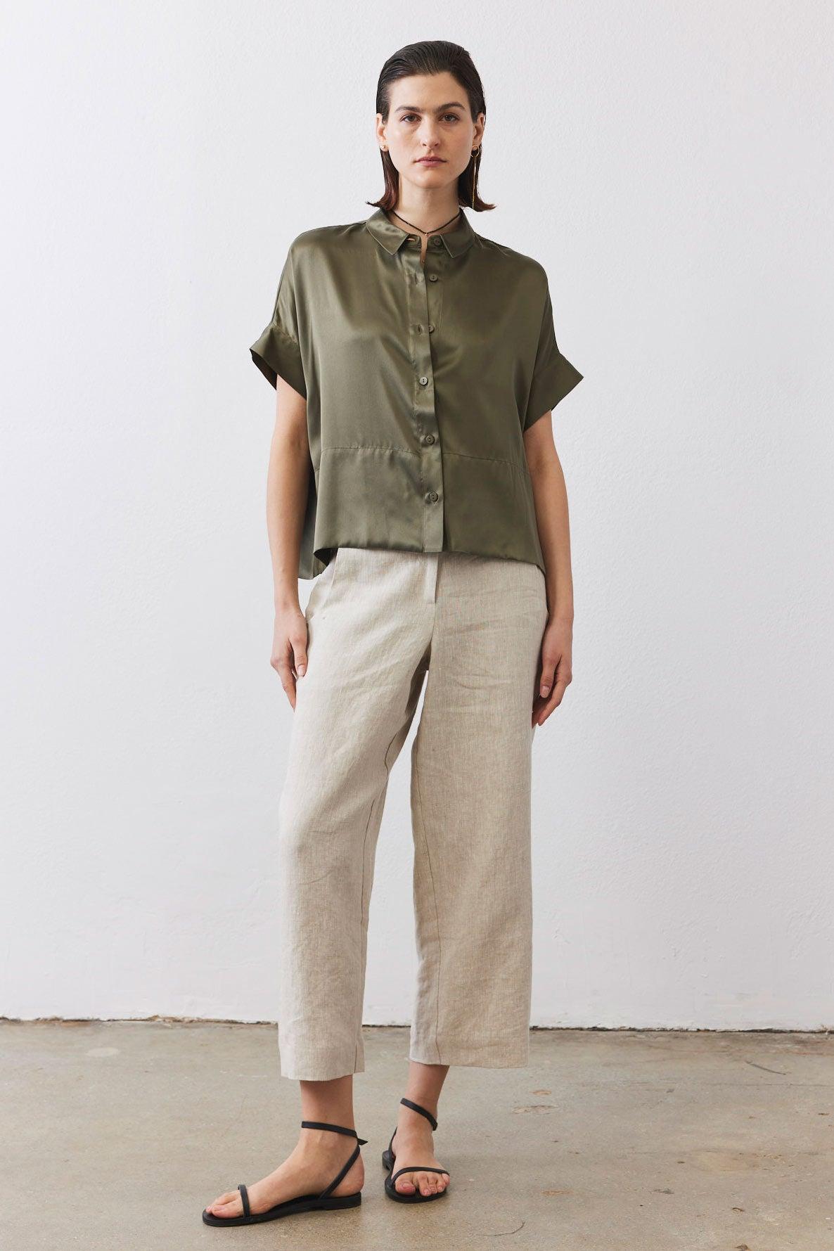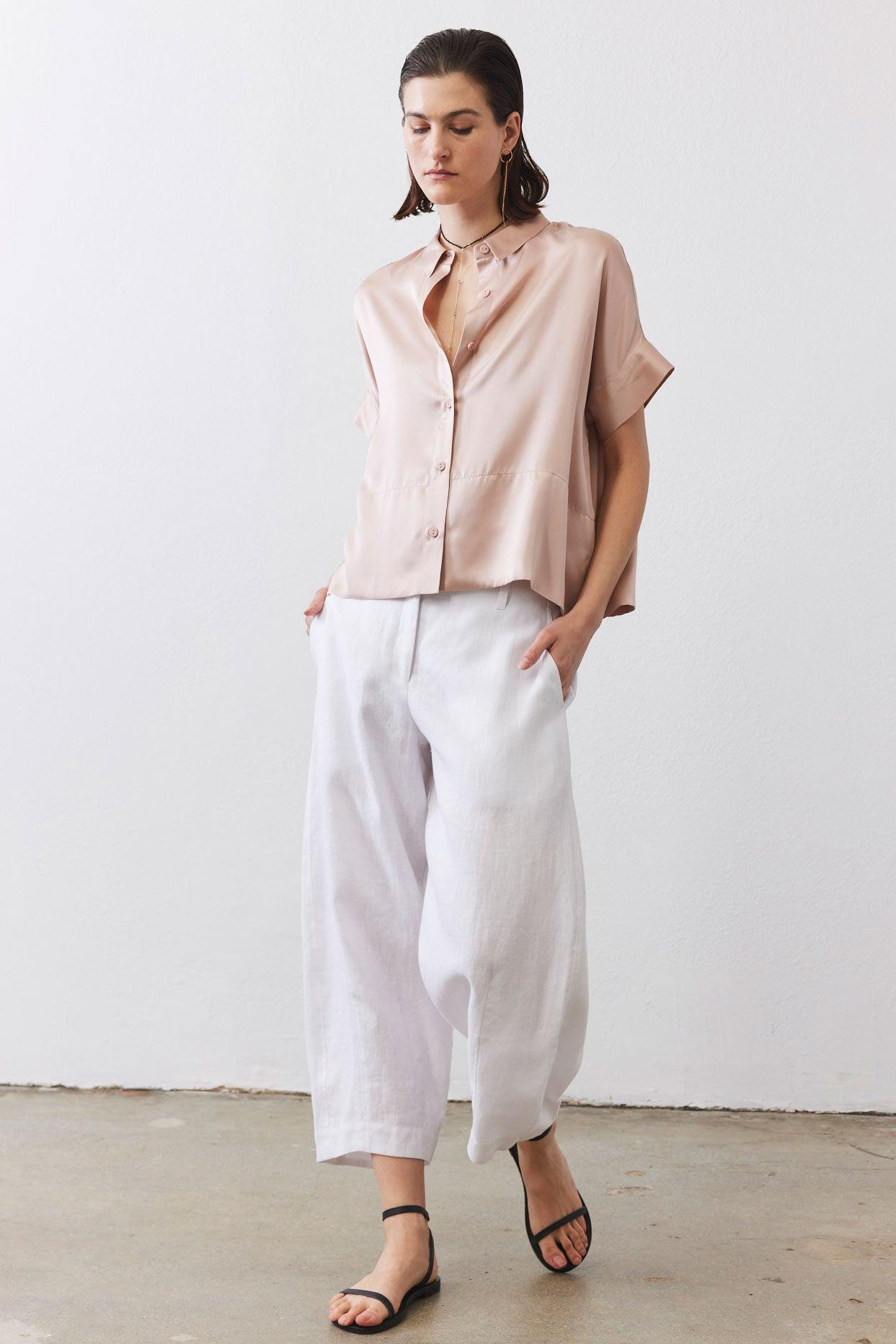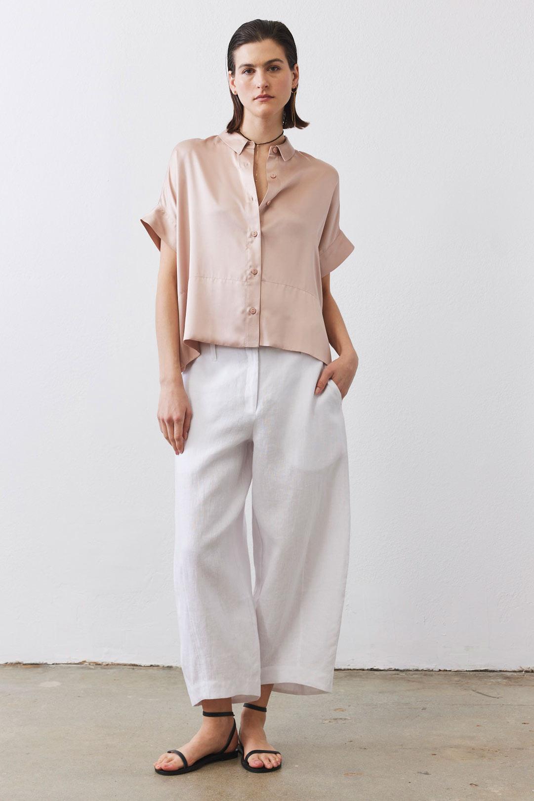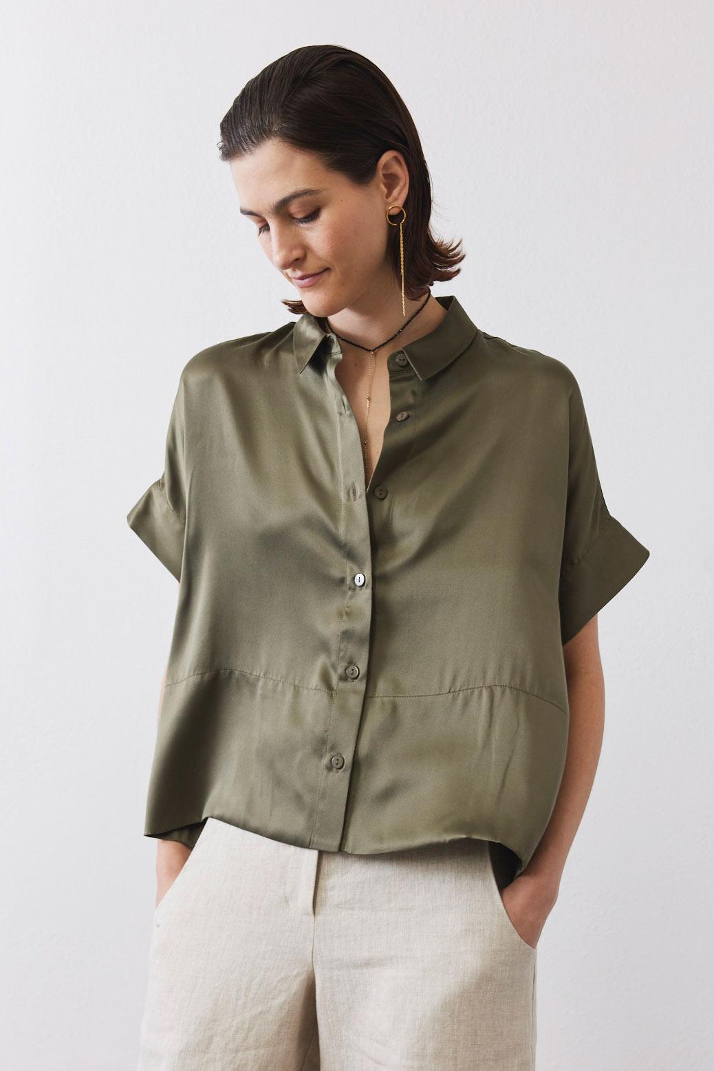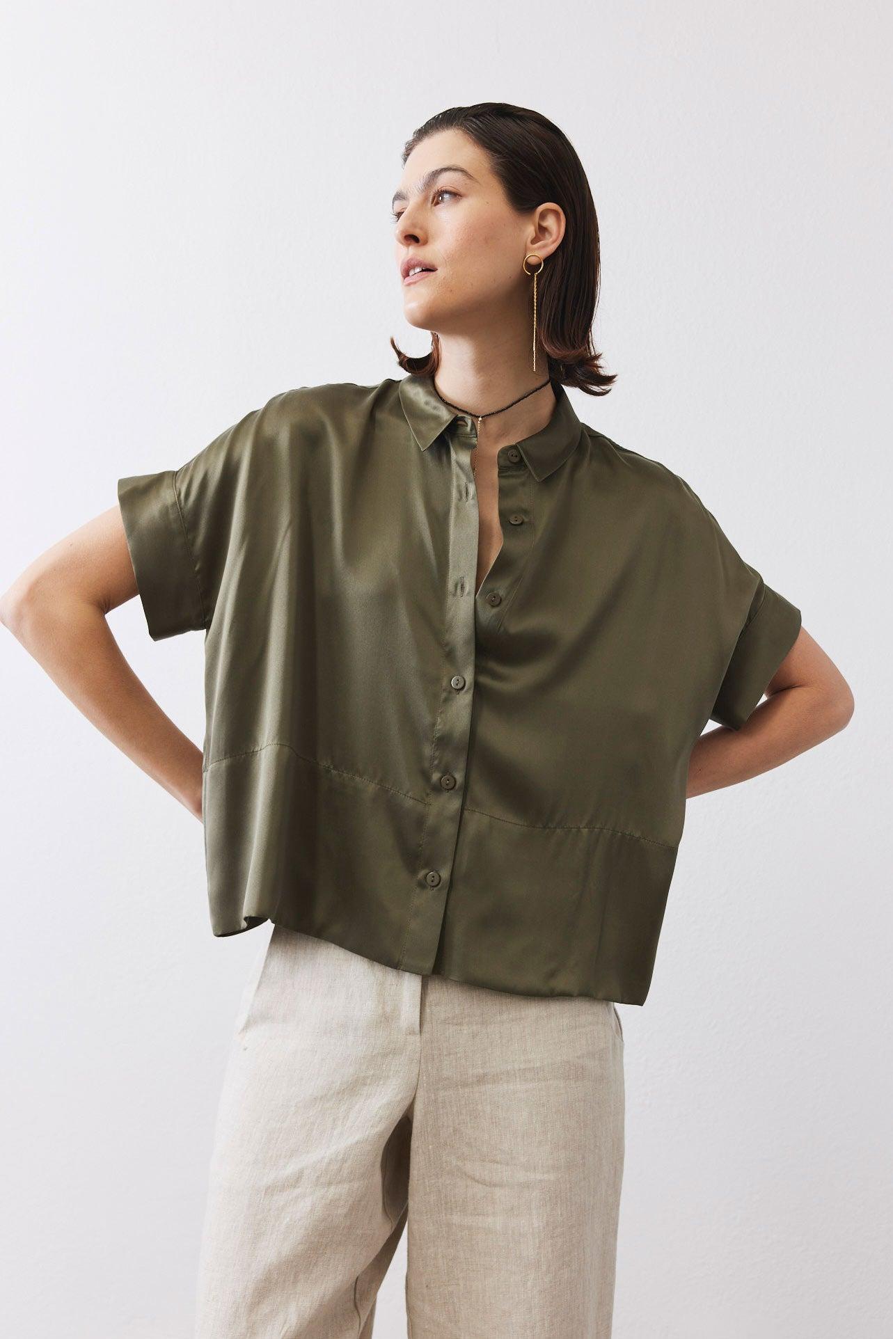 A silky, short-sleeve button-up with a relaxed fit and cinched waist for a subtly structured silhouette. Lightweight and effortlessly chic, perfect for day-to-night styling. Classic collar Short sleeves Button down Slightly cinched detailing on waist