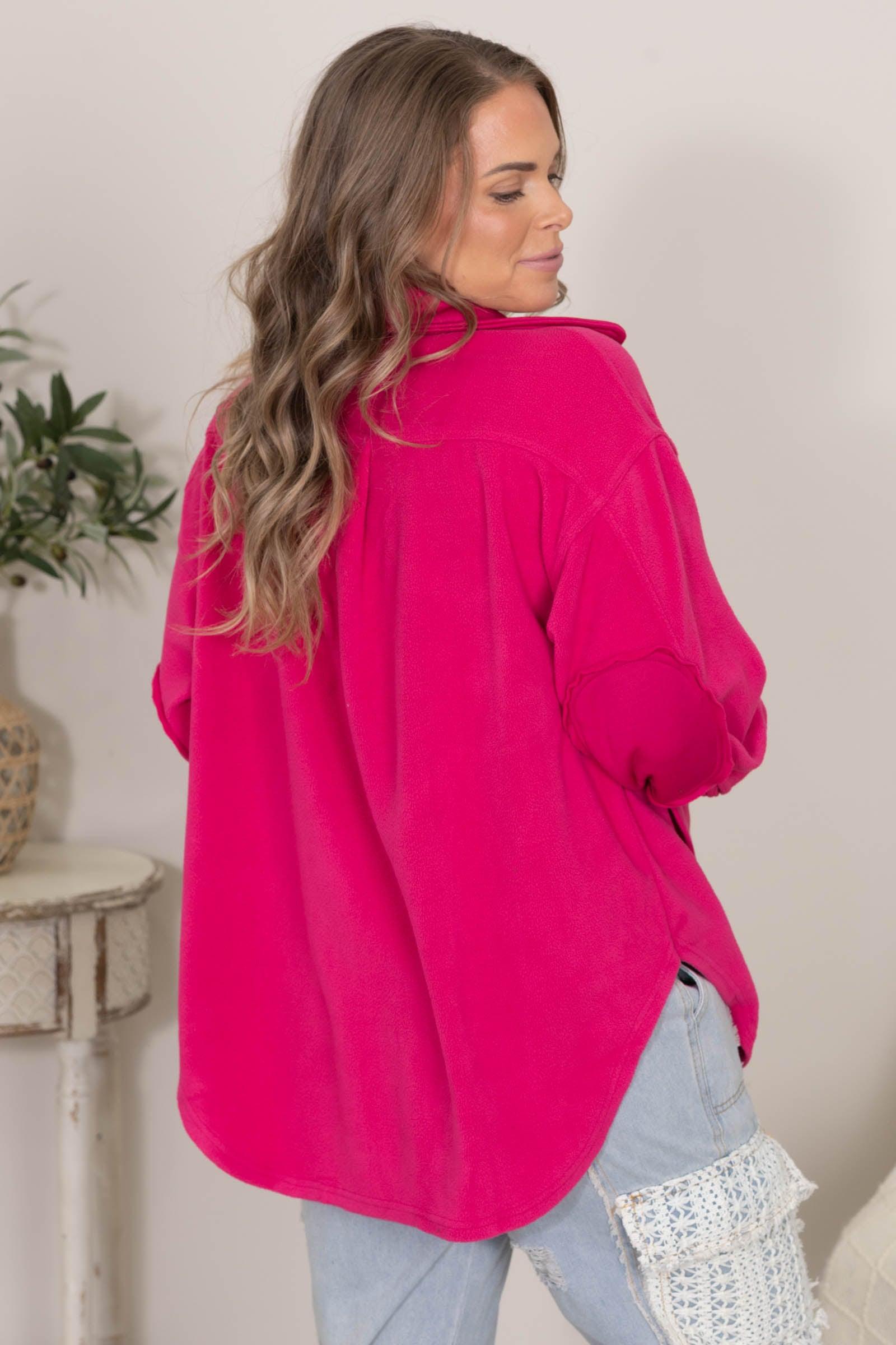 Product Details Colors: Hot Pink/ Bright Blue Print: Solid Neckline: Button Down Sleeve: Long Sleeve Hemline: Round Brand: Zenana Material and Care 100% Polyester Hand Wash Cold Hang/Line Dry Size and Fit Small: Bust 48" Waist 48" Length 30.5" Medium: Bust 50" Waist 50" Length 31" Large: Bust 52" Waist 52" Length 31.5" X Large: Bust 54" Waist 54" Length 32" Erica is wearing a size small