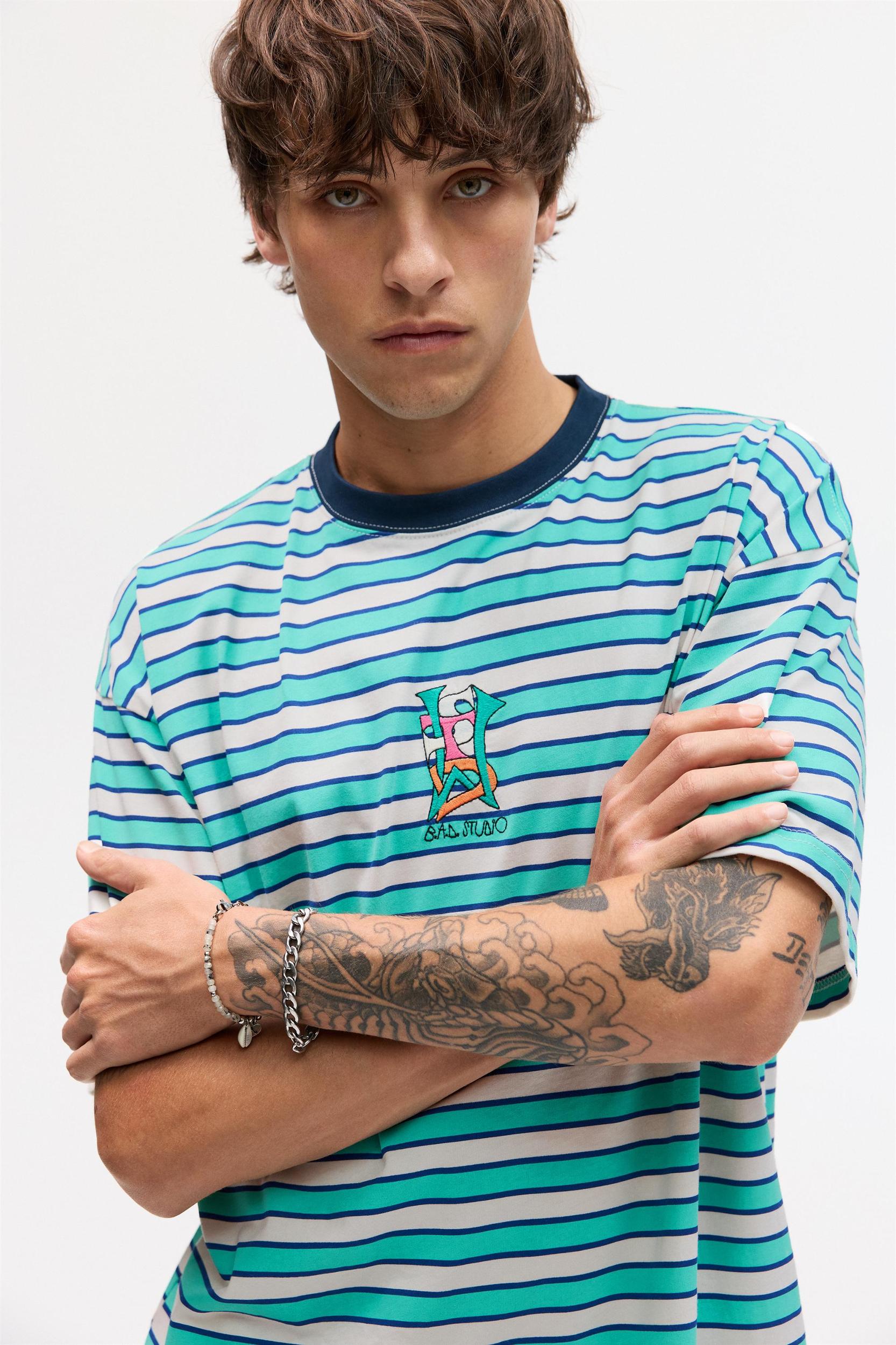 Bráulio Amado license T-shirt with short sleeves, a crew neck, a striped design and an embroidered graphic on the front.