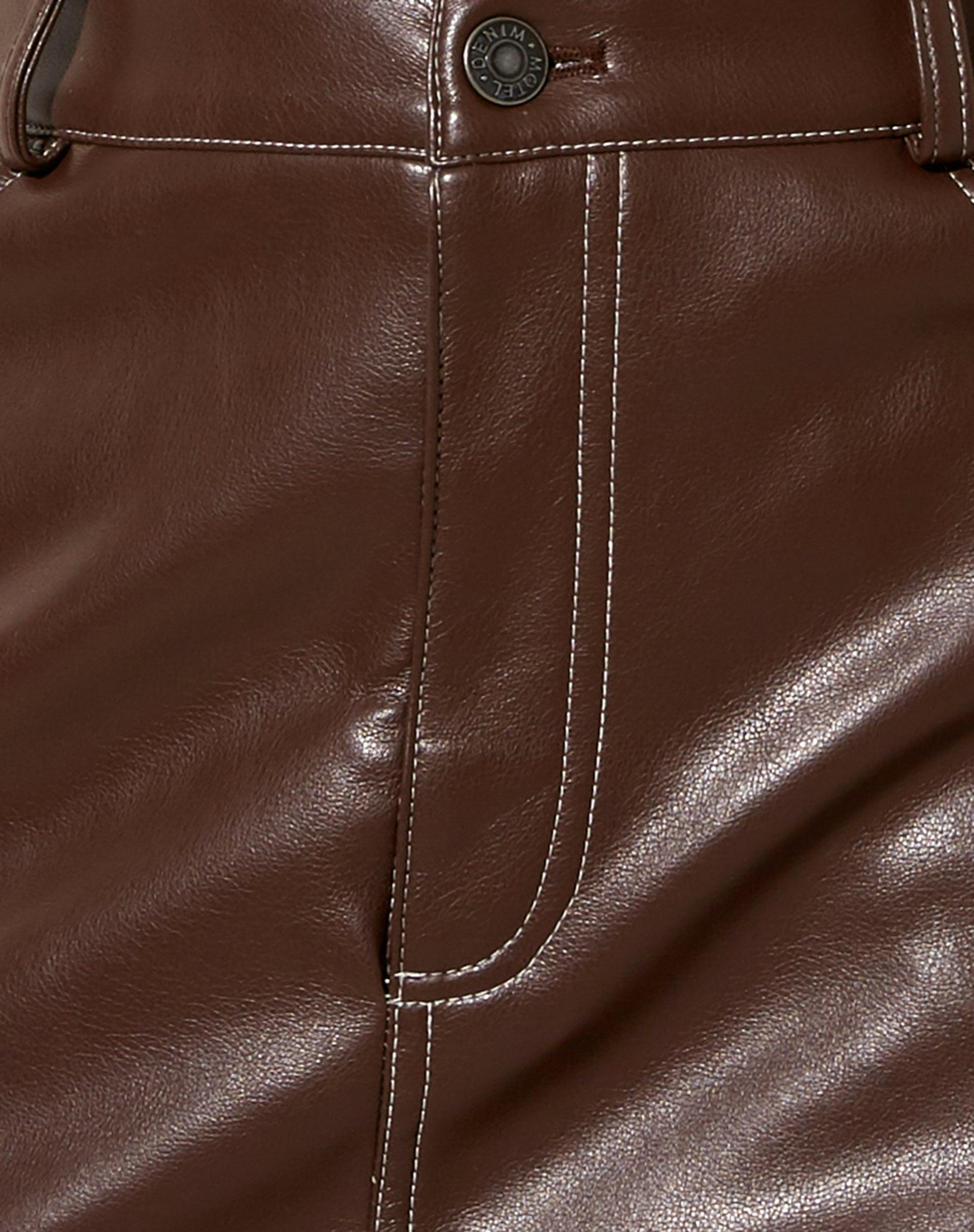 The Braima skirt is a wardrobe staple. Featuring a high waisted mini fit with button fastening and belt loops in a PU chocolate brown with ivory stitching. Simply style with a basic white crop and the matching Kancana shirt. MODEL WEARS:S - MODEL HEIGHT:5'8 - FABRIC CONTENT: 55% PU 45% POLYESTER