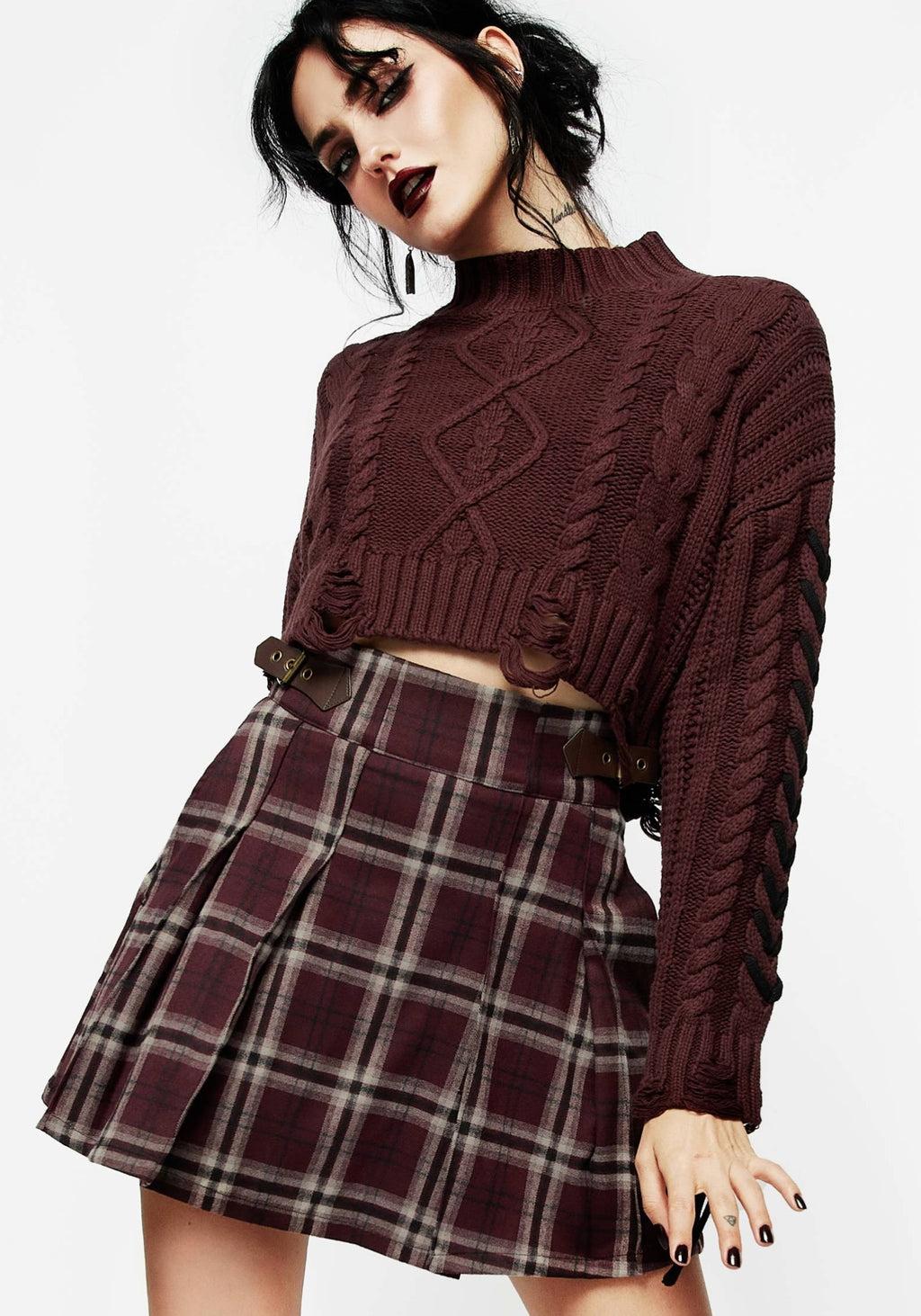 Grab life by the thorns- Burgundy red check pleated mini skirt with buckles - Flared skirt in a mini-length - Pleats add volume for maximum drama - Brown faux leather buckles with antique gold hardware at hips - Functional antique gold zip fastening at back - Two handy side pockets - Woven check fabrication in a cosy burgundy & cream with green accents - By the pricking of my thumbs, something warm-toned & versatile this way comes 89% polyester, 9% viscose, 2% elastane