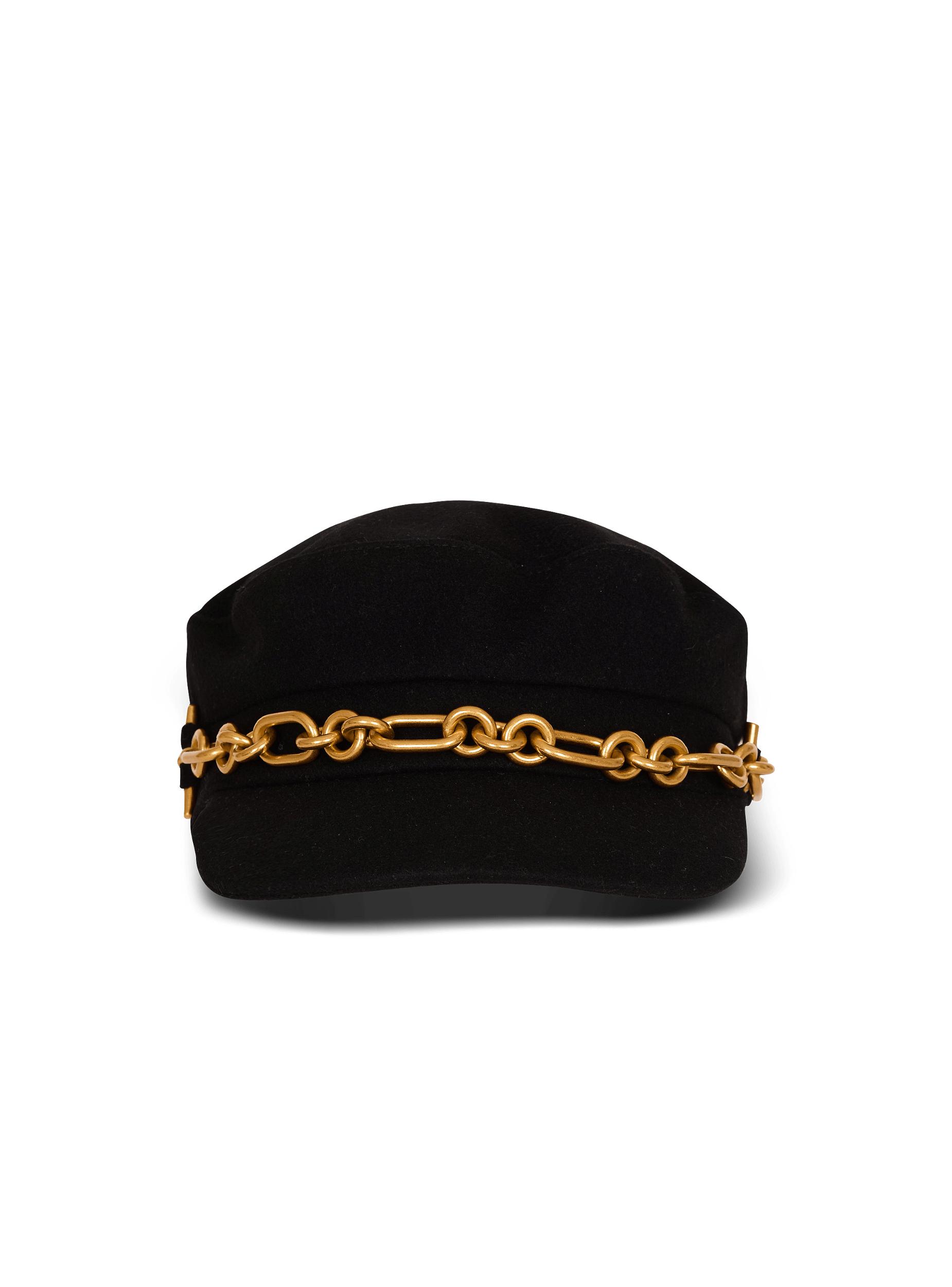 Brandebourg wool capStraight visorGolden metal chain at the backCotton liningMain material: 80% virgin wool 20% polyamideMade in BulgariaItem: FF1XB290WD09