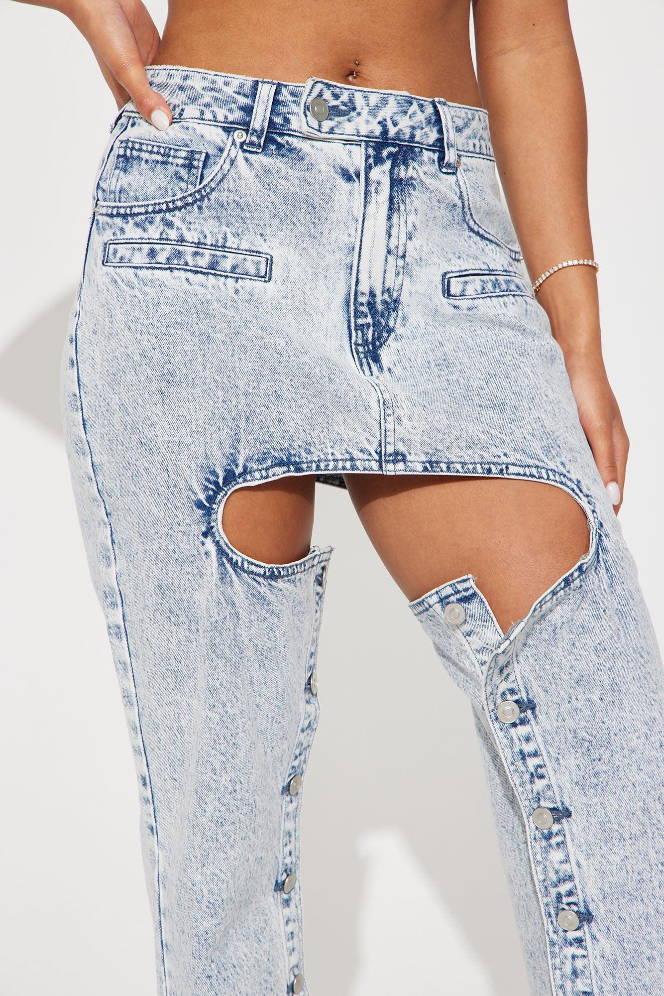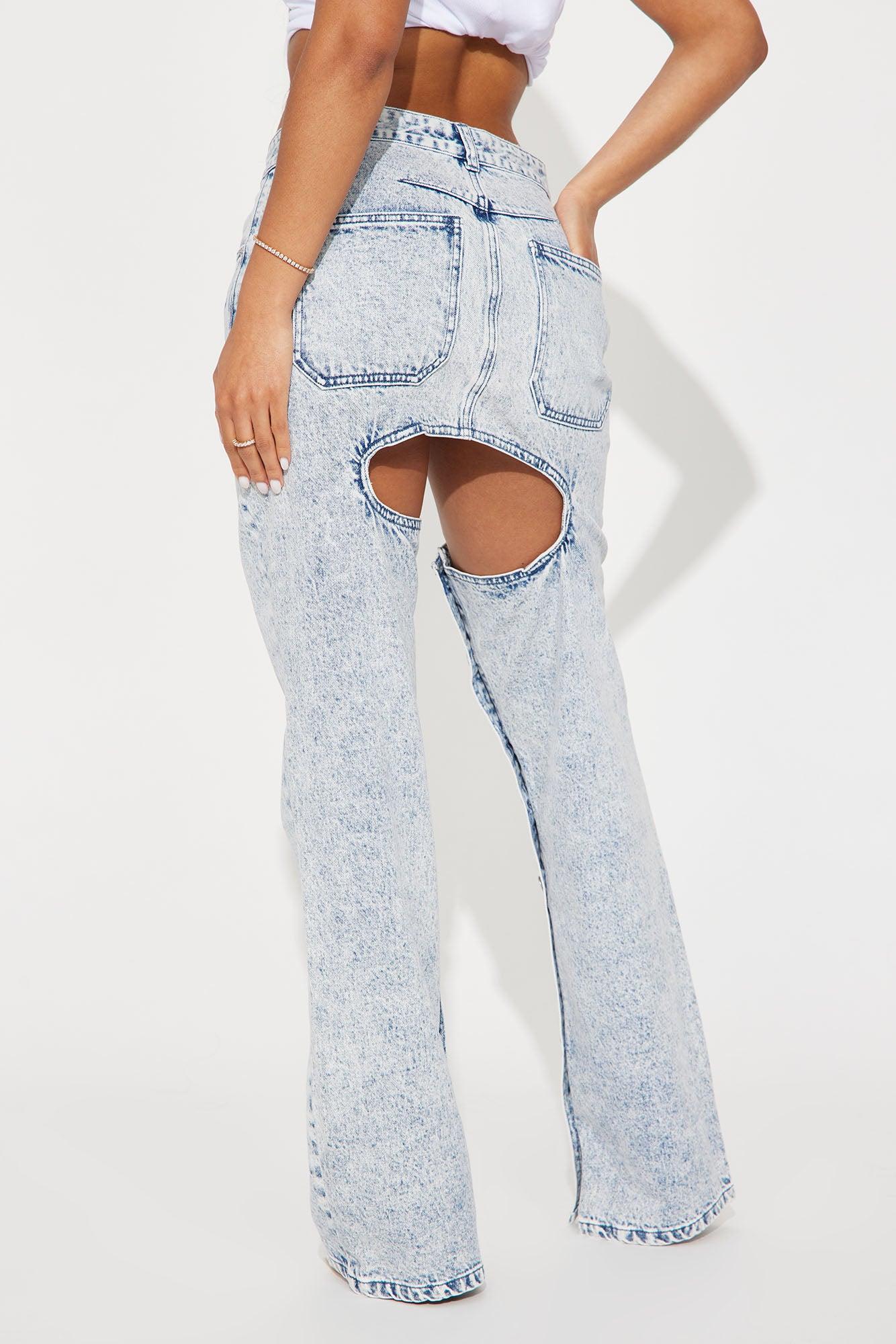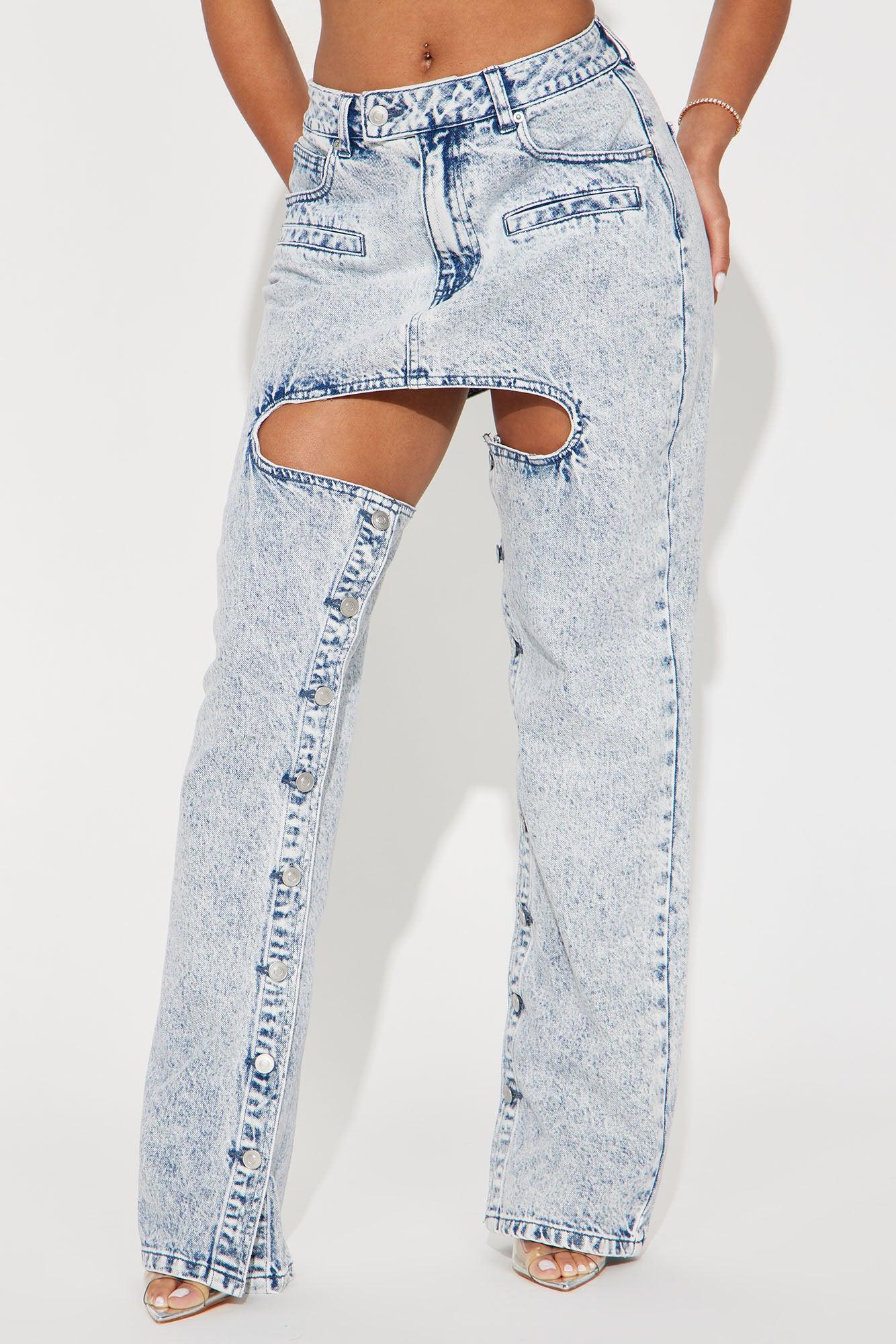 Available In Black Wash And Acid Wash. Straight Leg Jean 5 Pocket Cut Out Detail Button Up Leg 11" High Rise 32" Inseam Non Stretch Disclaimer: Due To The Specialized Wash Process, Each Garment Is Unique. 100% Cotton Imported California Proposition 65 WARNING: Cancer and Reproductive Harm - www.P65Warnings.ca.gov.