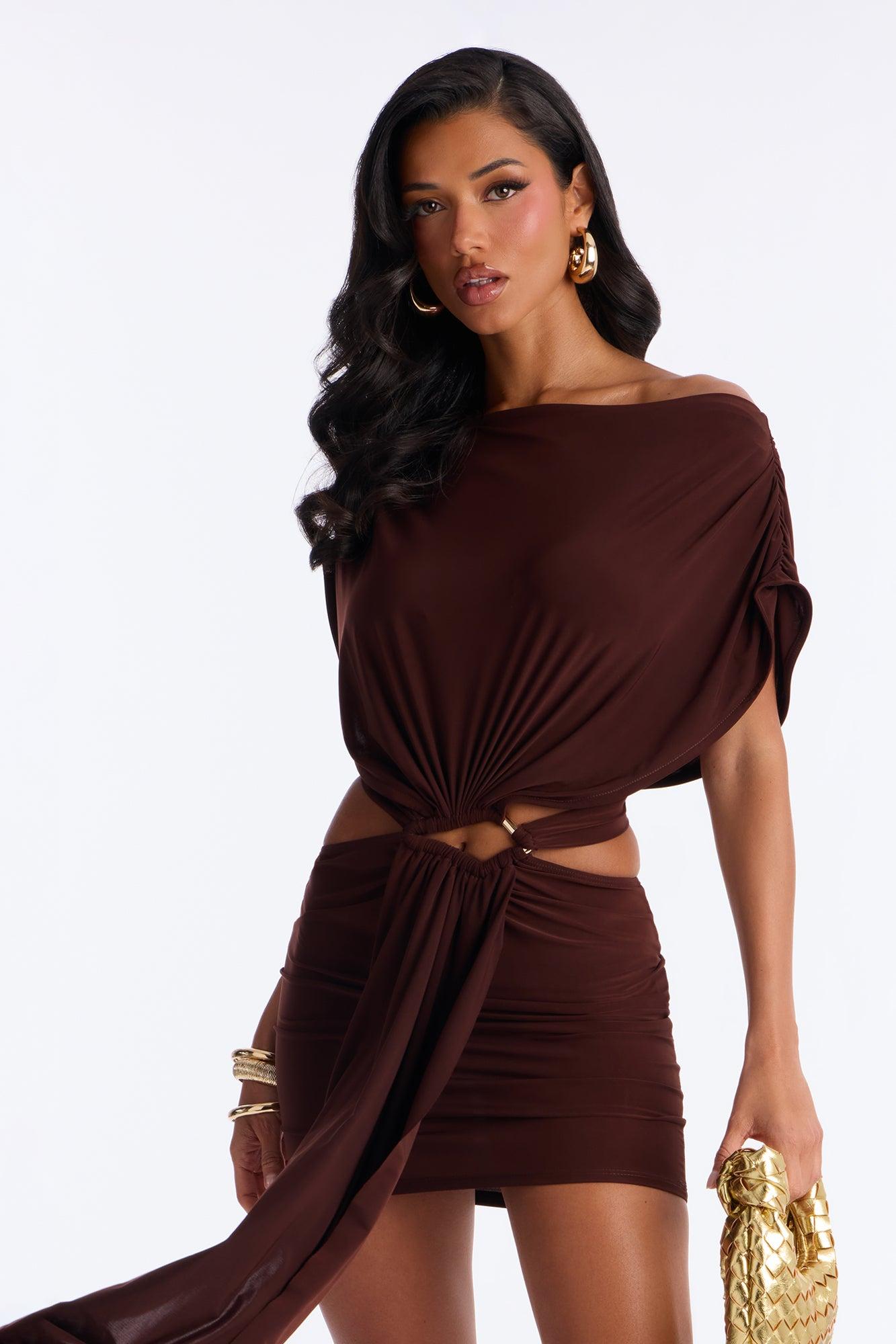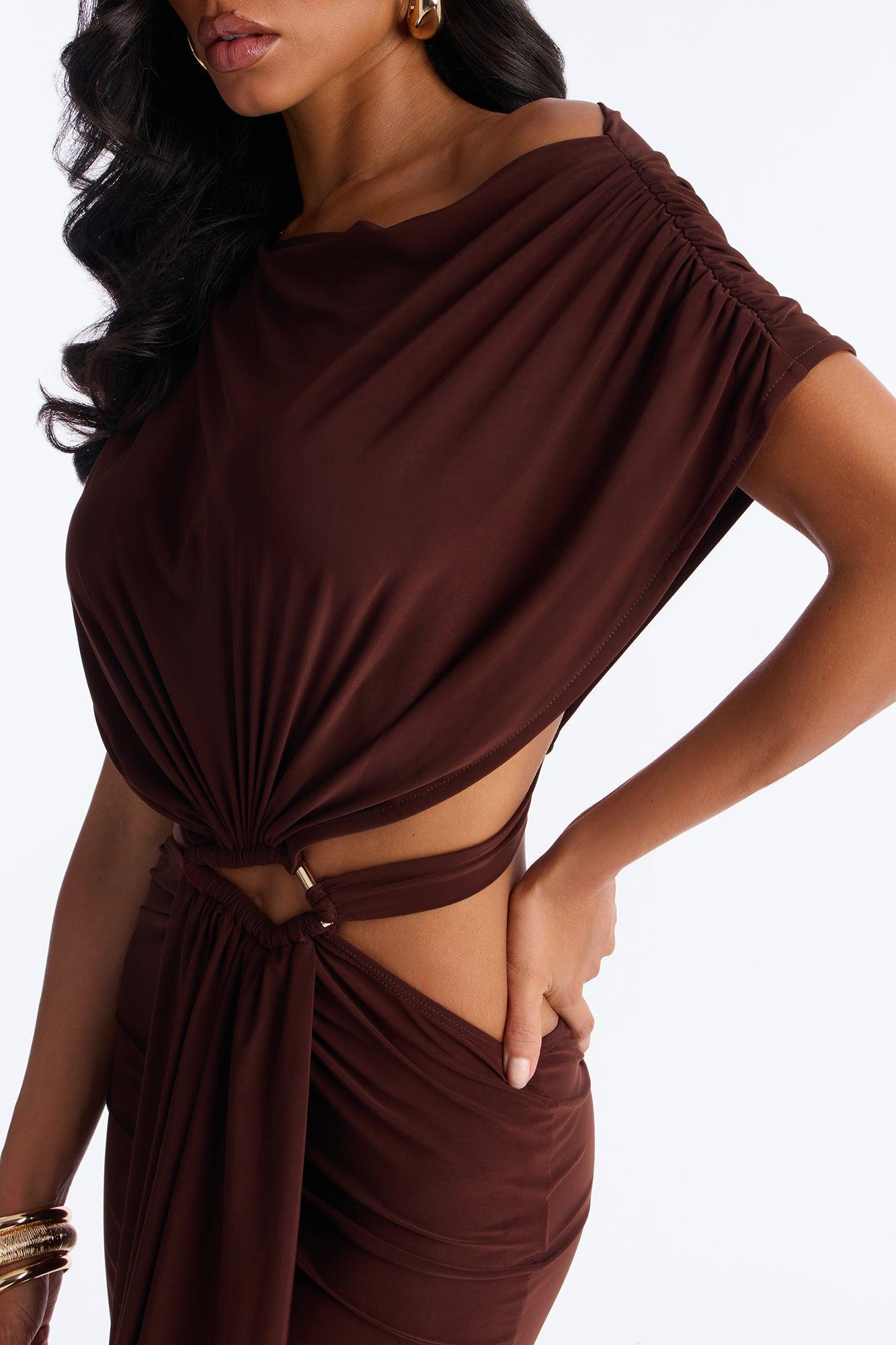 Available In Chocolate. Micro Mini Dress High Neck Sleeveless Cut Out Hardware Pleated Draped Stretch Length Measured Flat = 30" 96% Polyester 4% Spandex Imported California Proposition 65WARNING: Cancer and Reproductive Harm - www.P65Warnings.ca.gov.