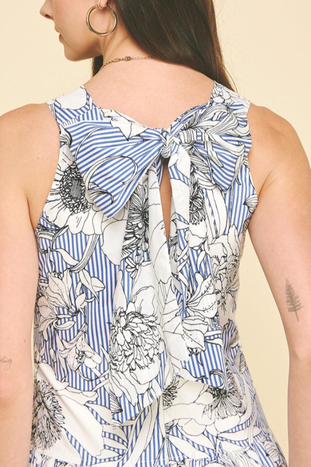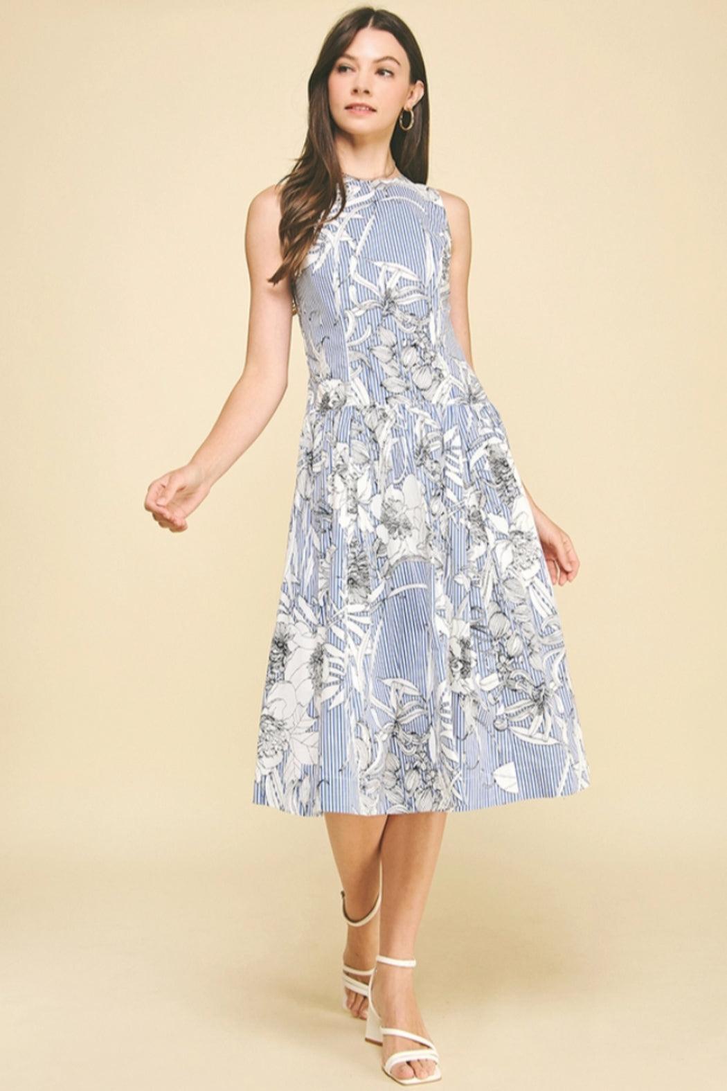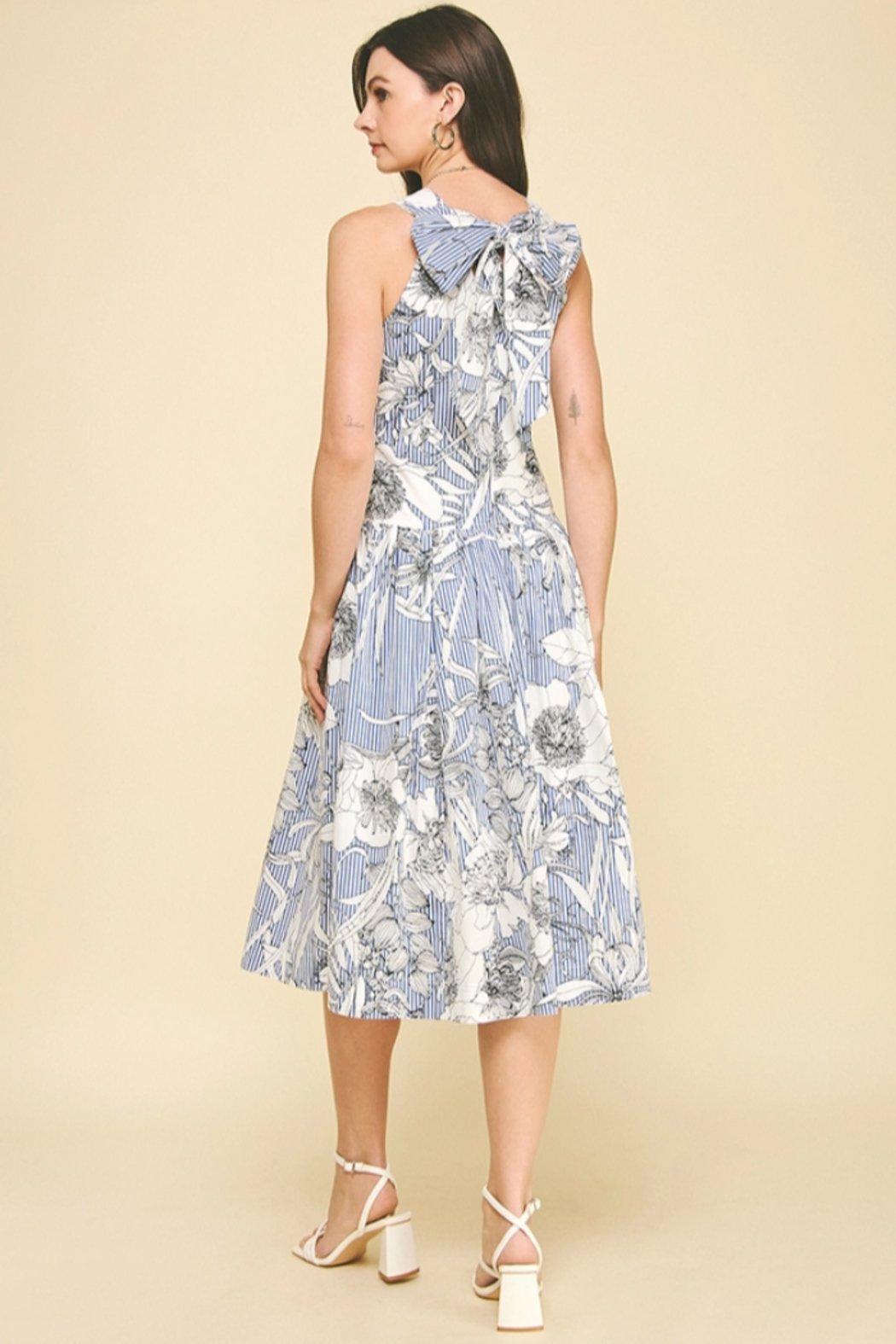This elegant midi dress features a sophisticated blue and white striped pattern adorned with delicate floral line drawings that create a timeless, artistic appeal. The sleeveless design showcases a charming tie-back detail at the neckline that adds a feminine touch, while the A-line silhouette flows gracefully to midi length. The combination of classic pinstripes with romantic floral sketches makes this versatile piece perfect for brunch dates, garden parties, or any occasion where refined elegance meets effortless style.