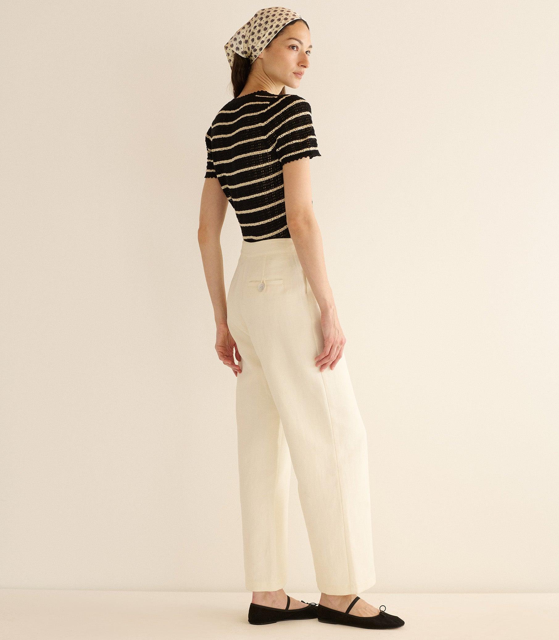Crafted from a soft, lightweight blend of Pima cotton and silk, the ‘30s-inspired Brandie Top features a Henley-style neckline with mother-of-pearl buttons, subtly gathered short sleeves, and an allover pointelle design. The neckline, sleeve cuffs, and hemline are adorned with scallop crochet detailing.